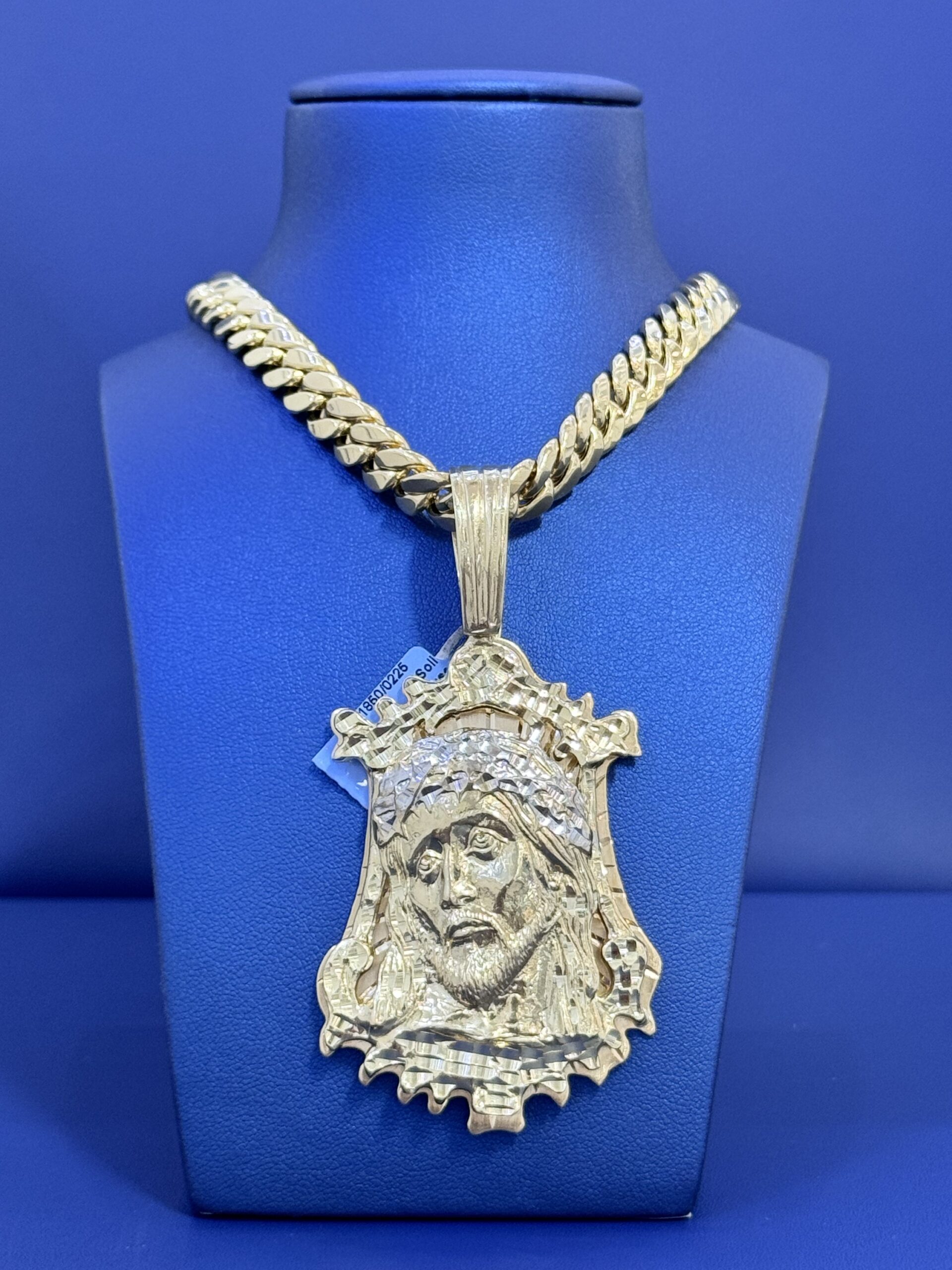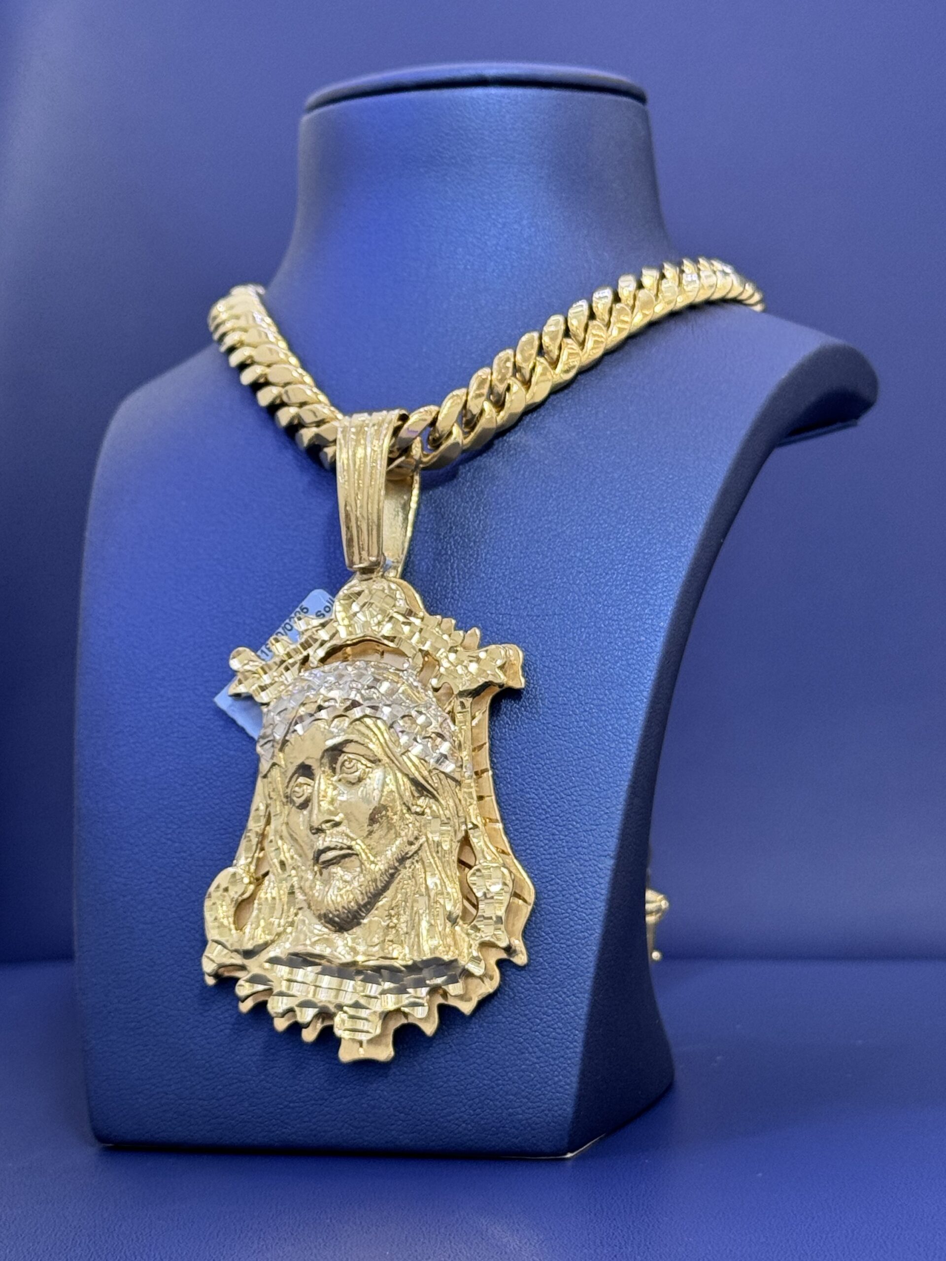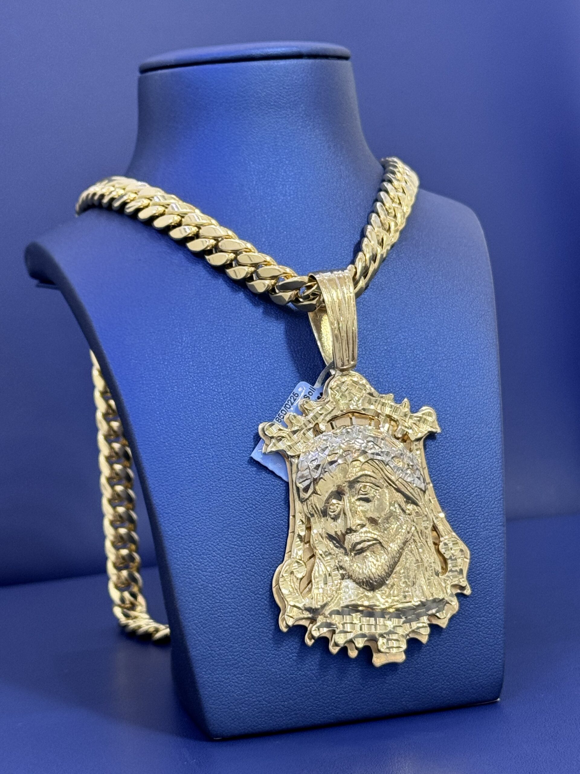 10KT Gold Jesus Pendant ComboSet comes With 22″ SemiSolid MiamiCuban Necklace 10MM Approx Gold Weight 52.4 Gram Pendant 3.5″ Tall By 1.85″ Wide Approx Gold Weight 42.4 Gram