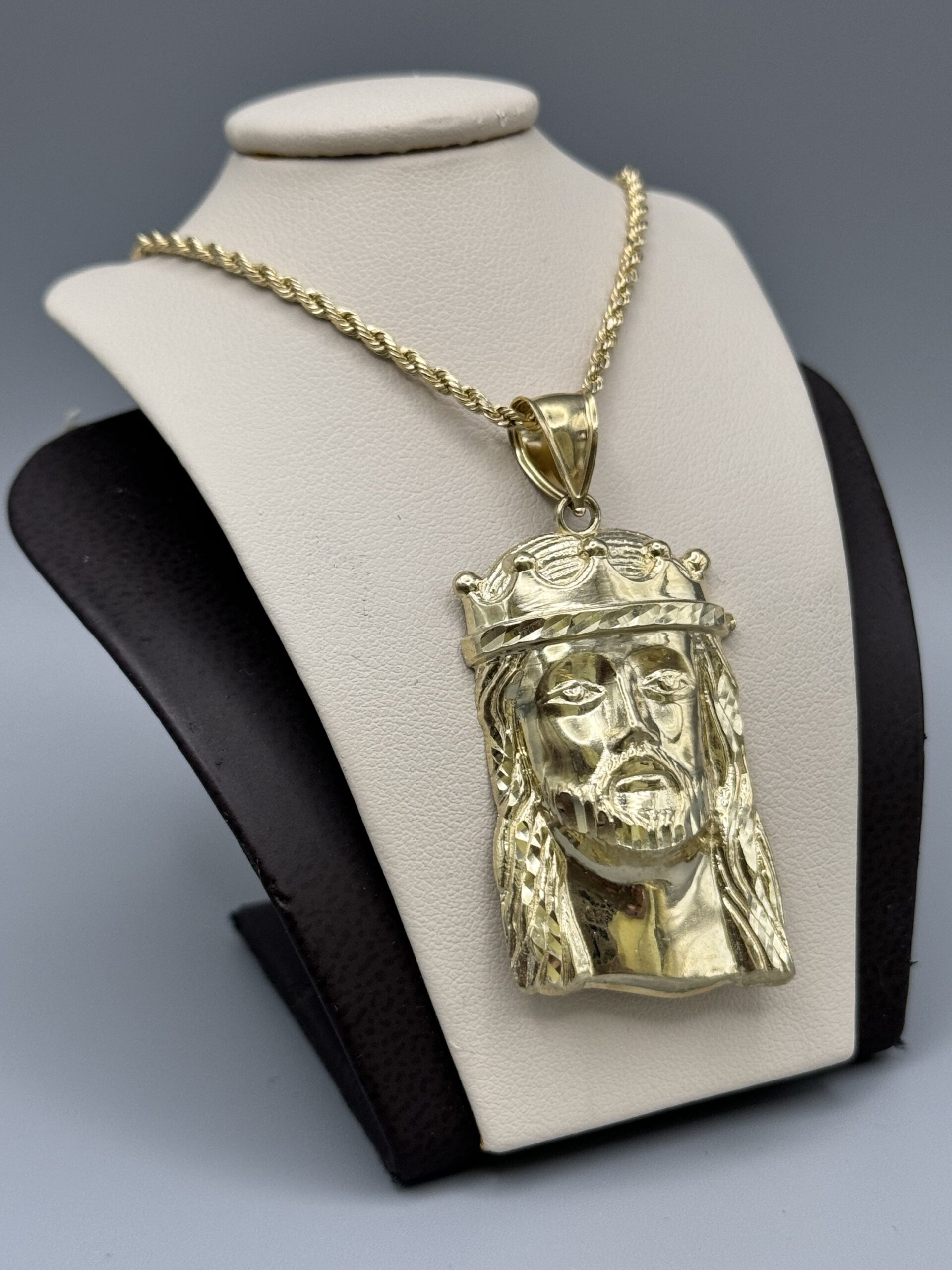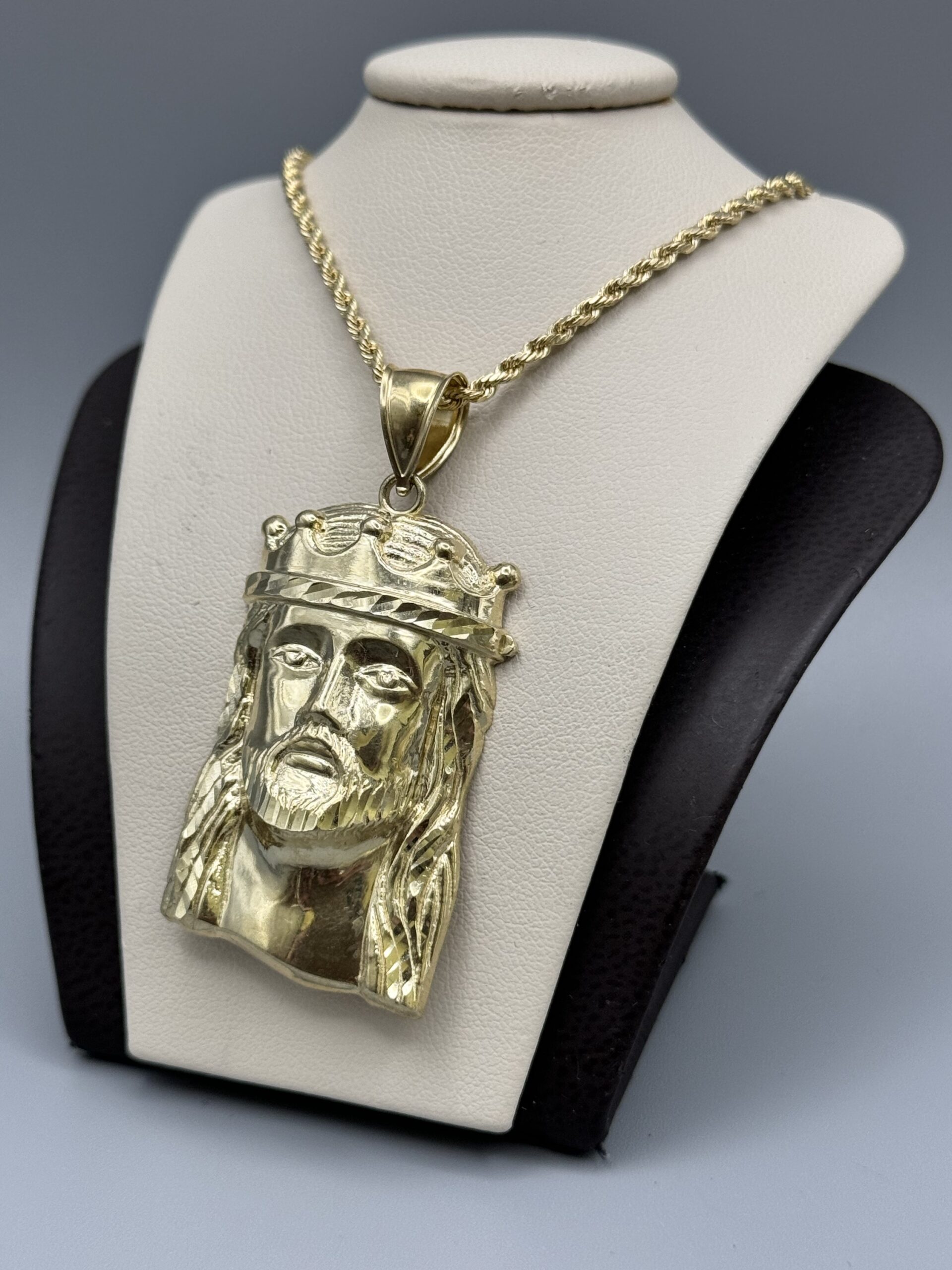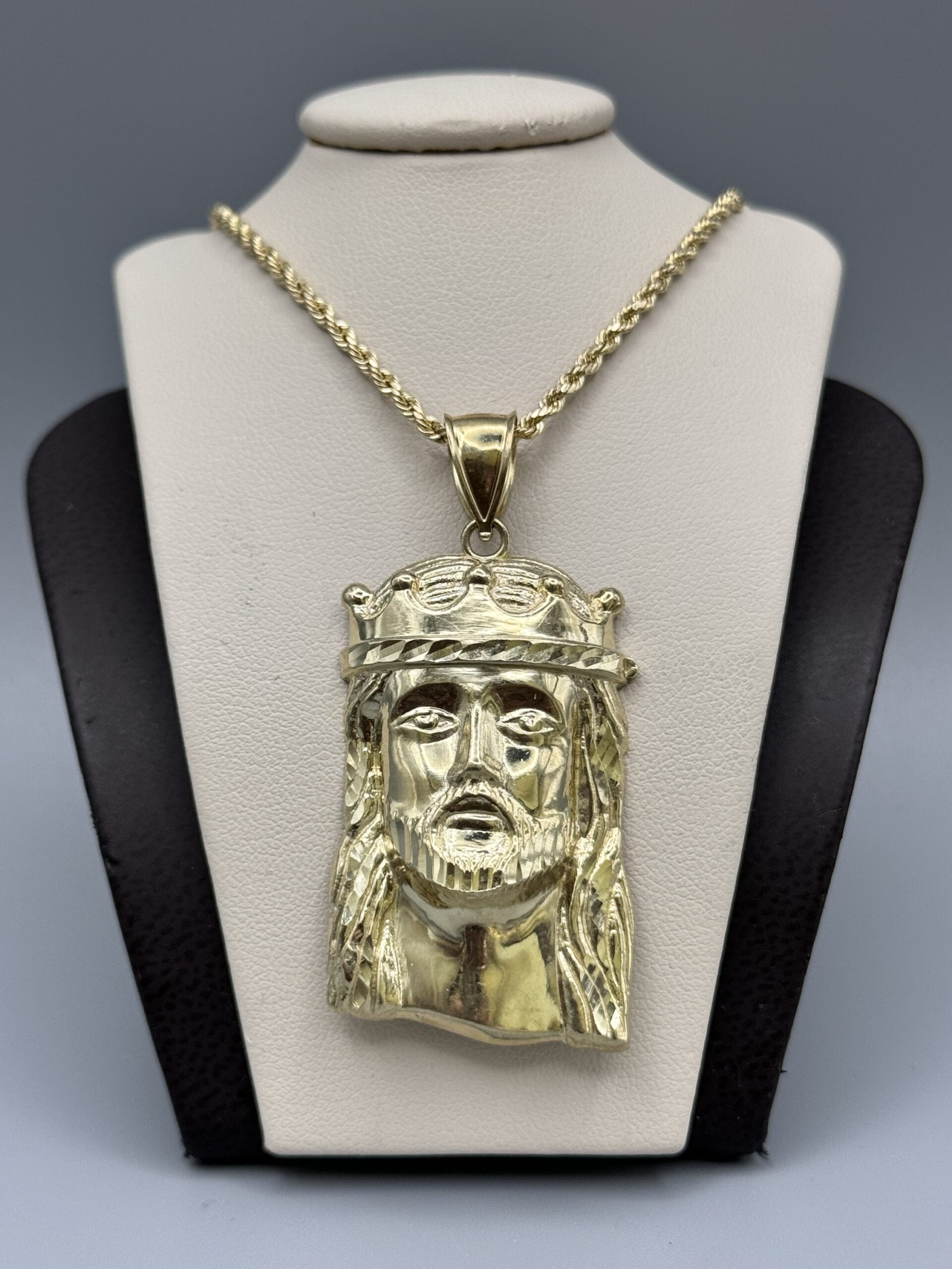 10KT Gold Jesus Pendant ComboSet Comes With 10KT Gold 2MM Rope Necklace 22″ Approx Gold Weight 3.1 Gram Pendant 2.15” Tall By 1″ Wide Approx Gold Weight 7.1 Gram