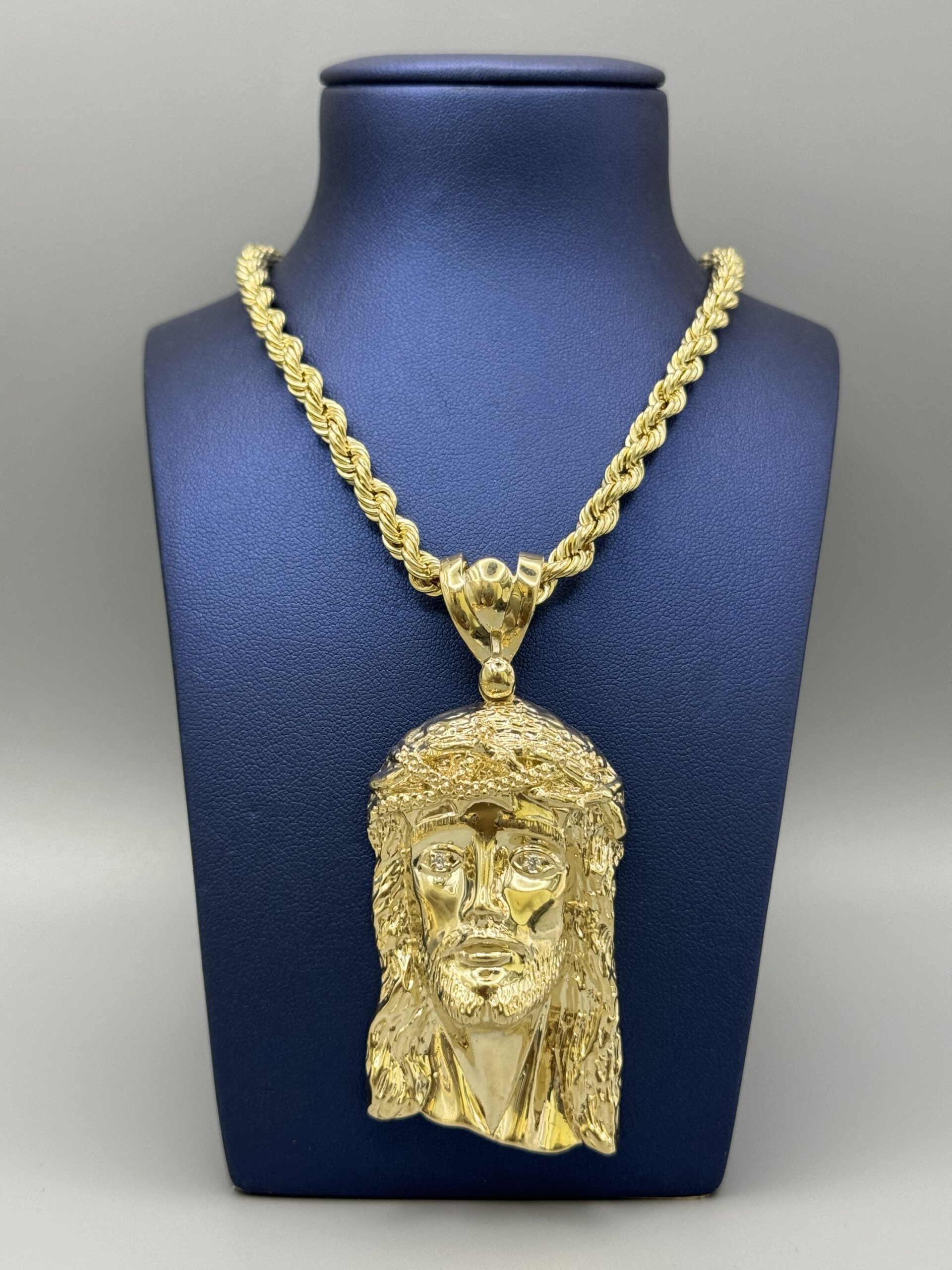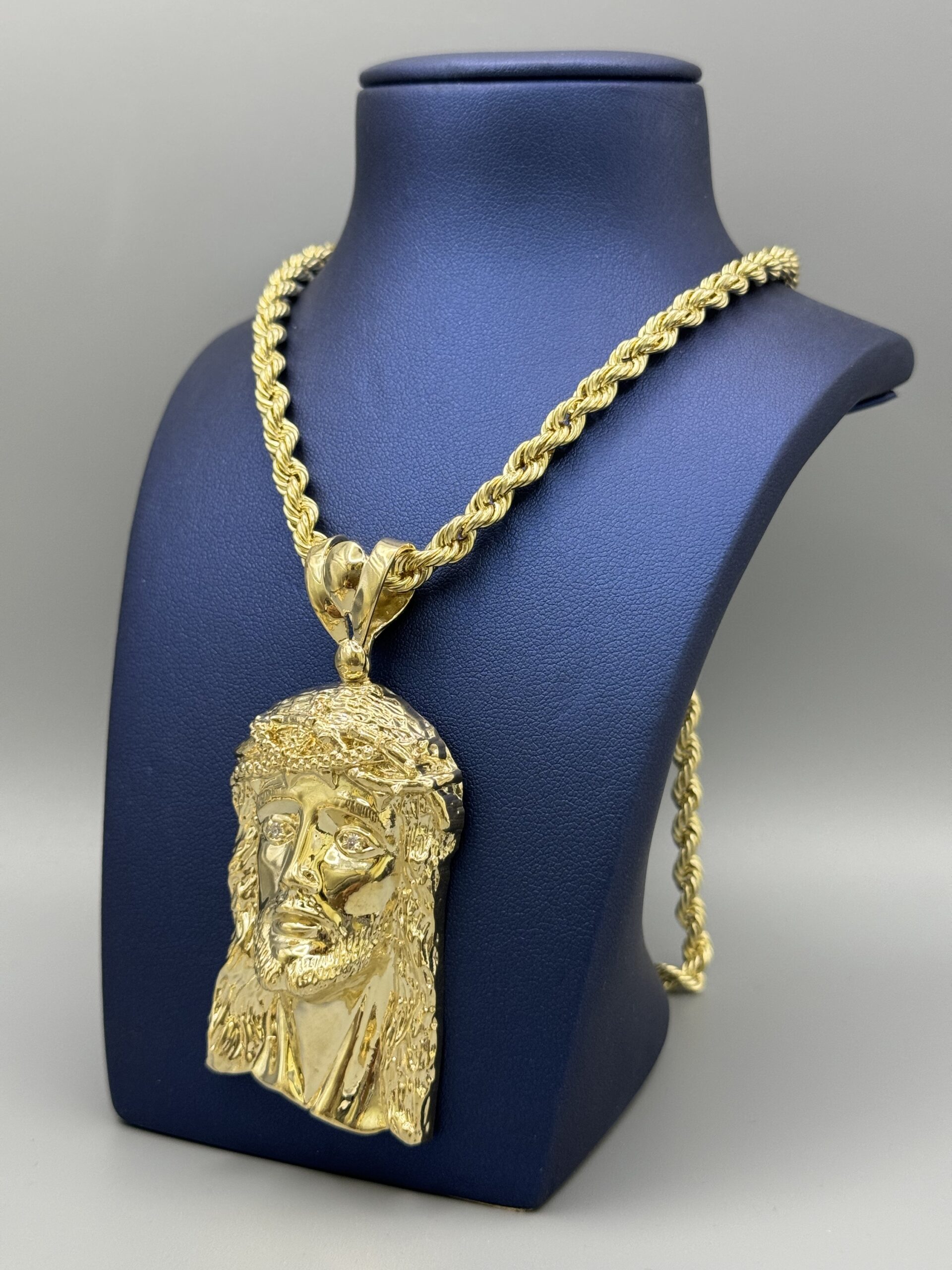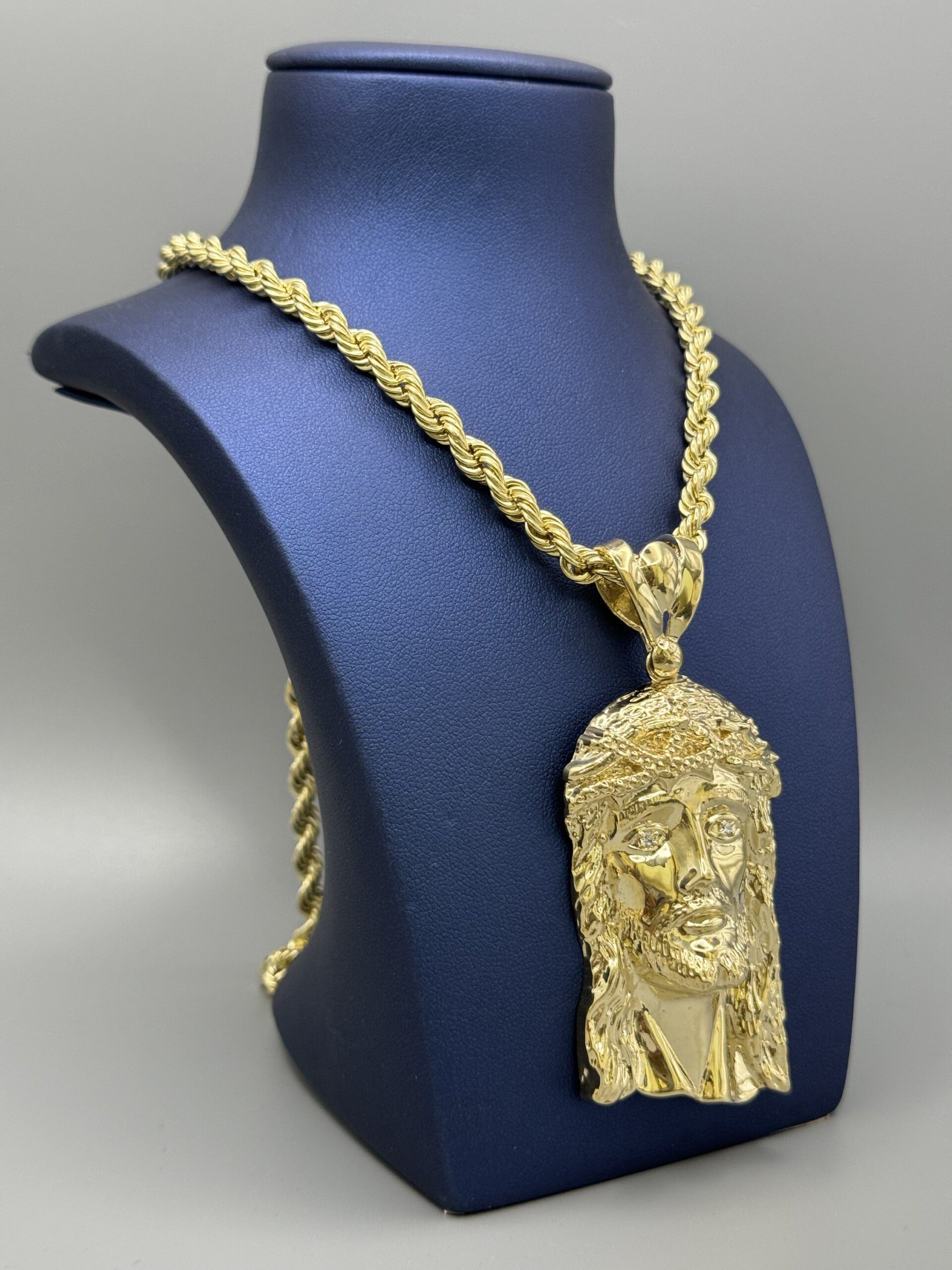 10KT Gold Jesus Pendant ComboSet Comes With 6MM 24″ Rope Necklace Approx Gold Weight 12.3 Gram Pendant Approx Gold Weight 19.9 Gram 3.25″ Tall By 1.5″ Wide