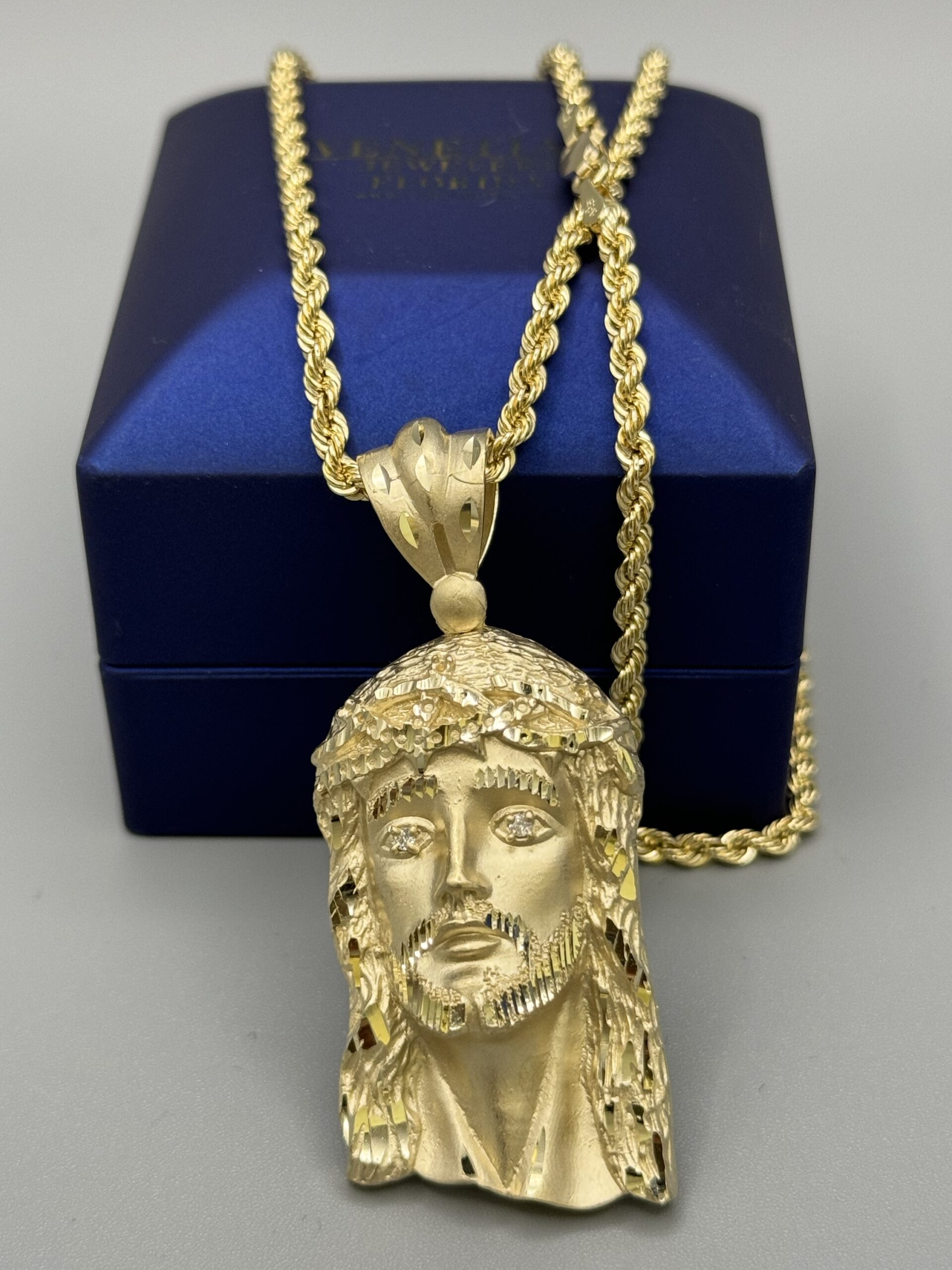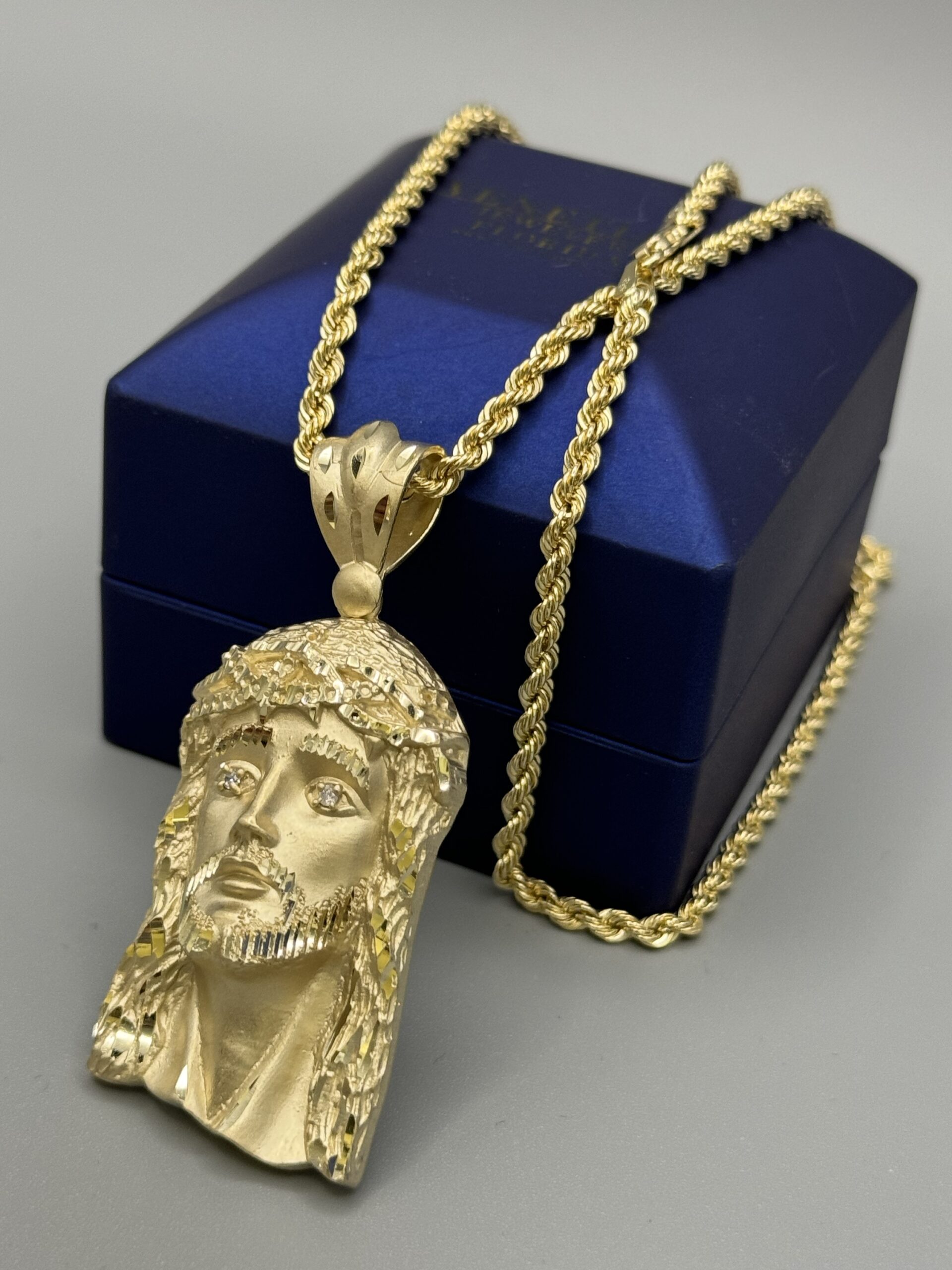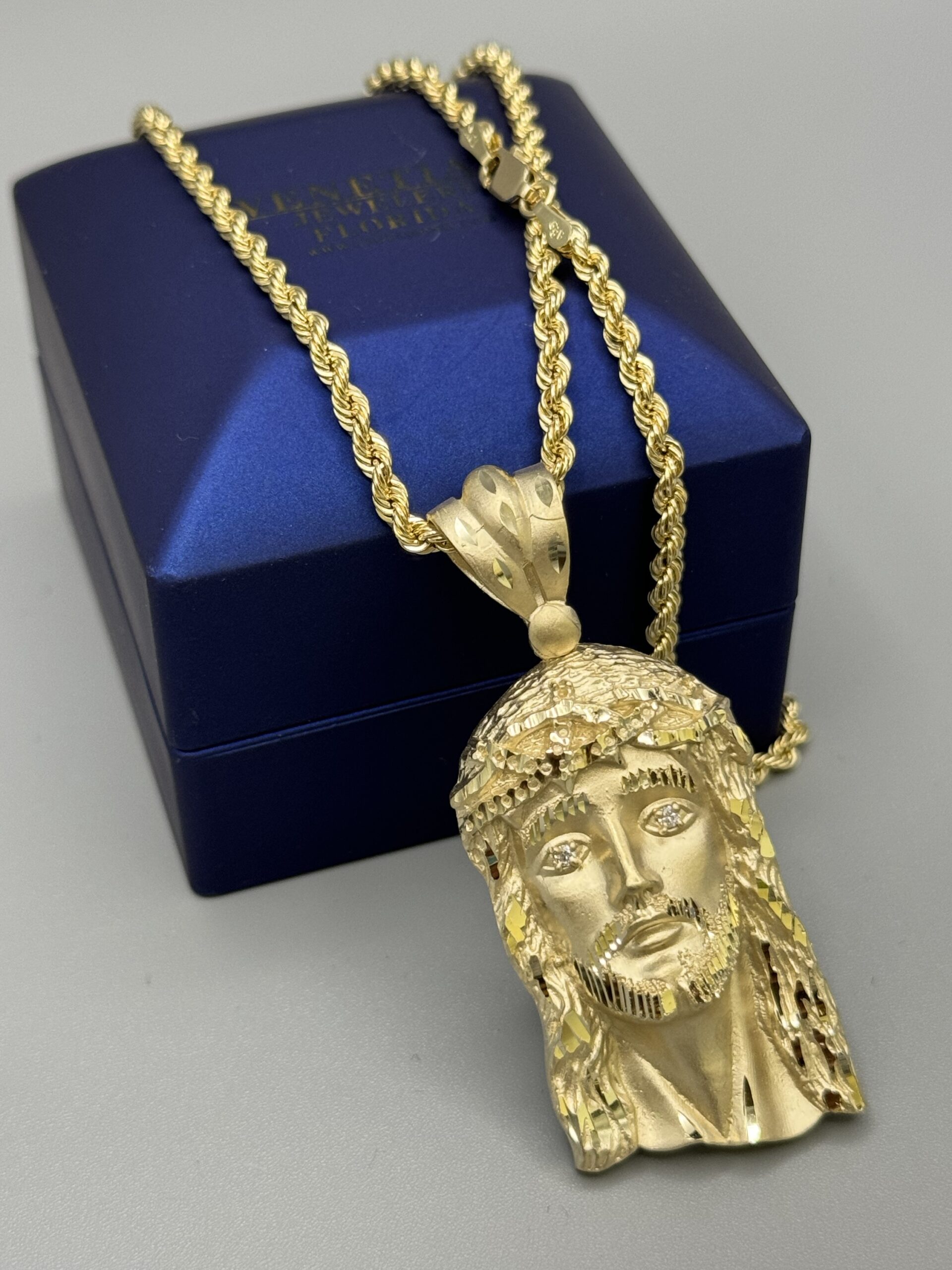 10KT Gold Jesus Pendant ComboSet Comes With 6MM 24″ Rope Necklace Approx Gold Weight 6.3 Gram Pendant Approx Gold Weight 7.4 Gram 2.25″ Tall By 1″ Wide