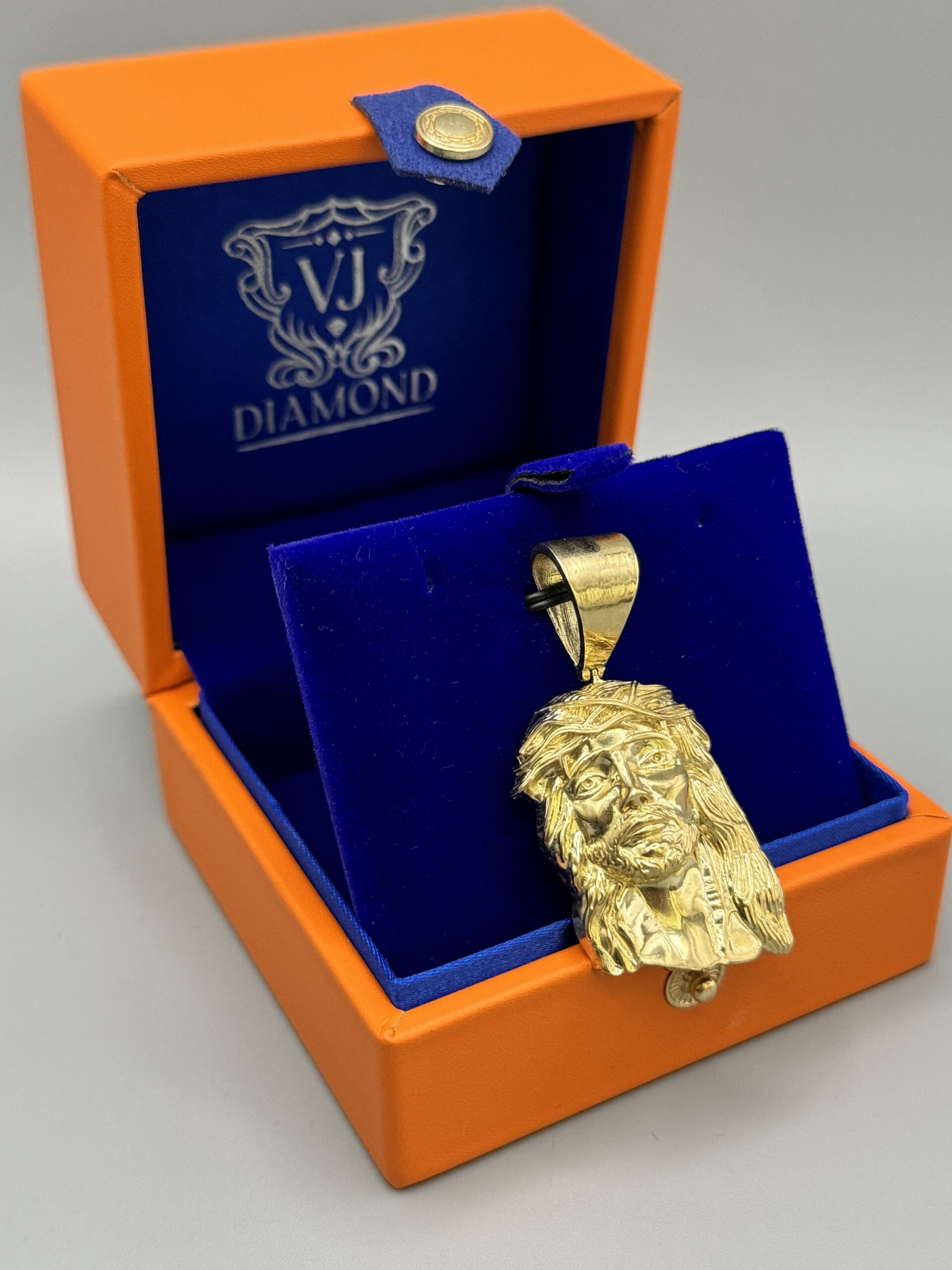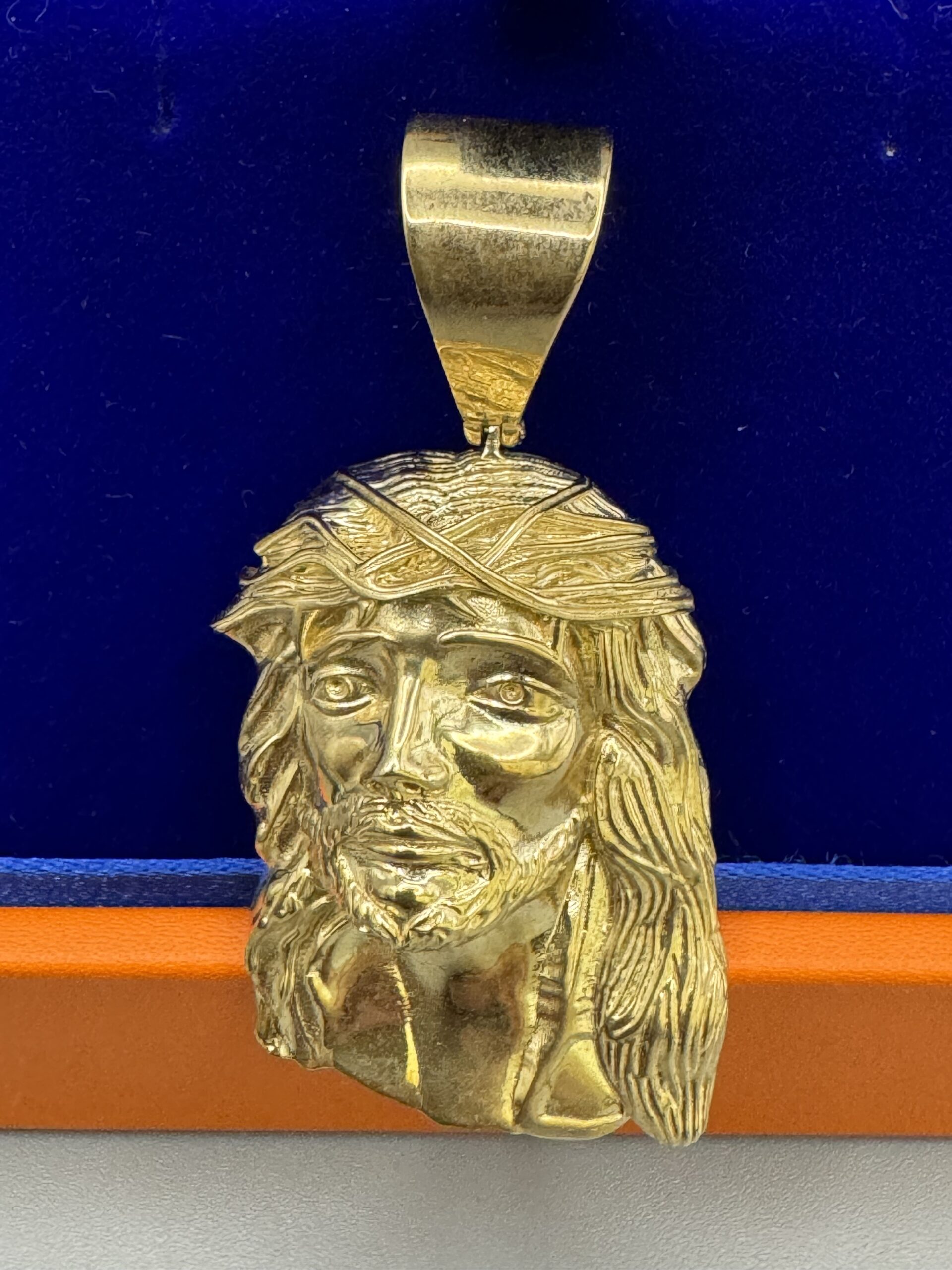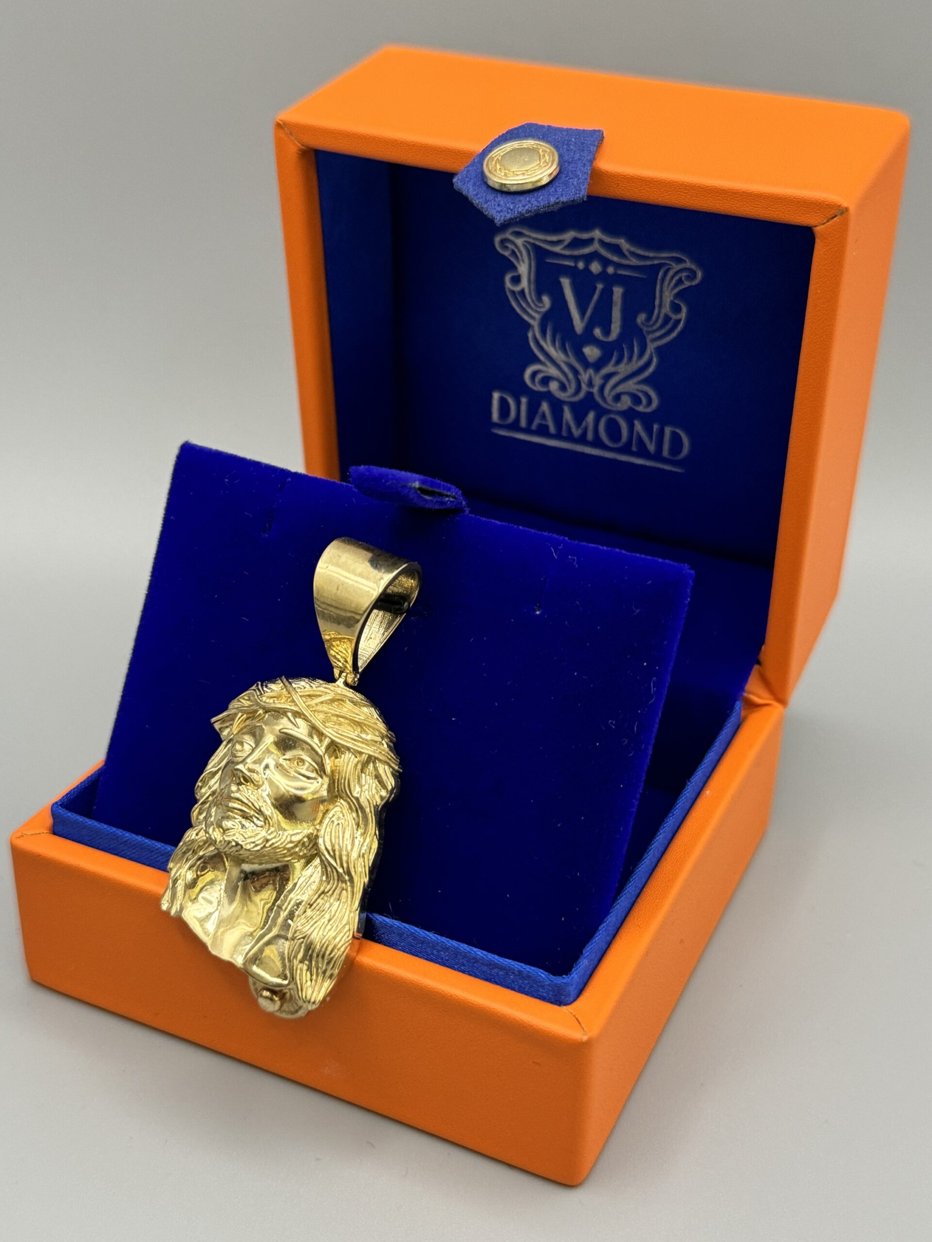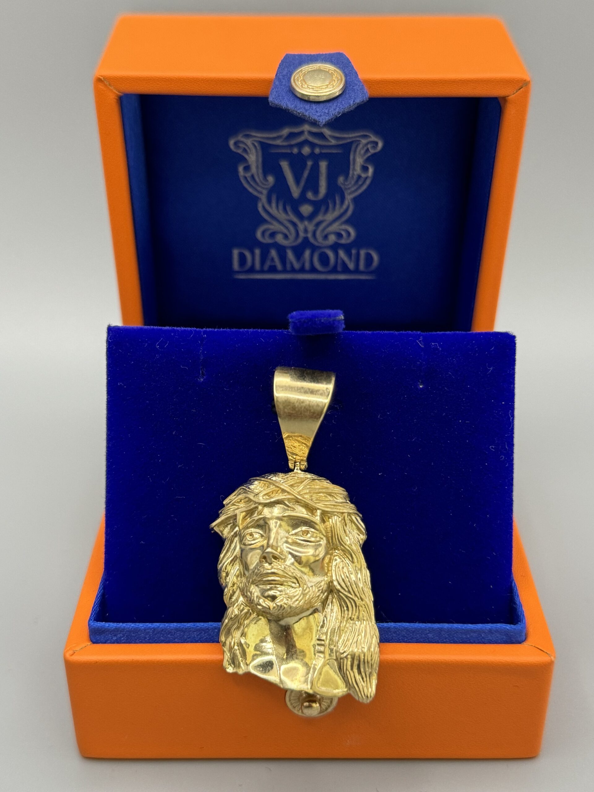 Elevate your style with this stunning 10KT Gold Jesus Pendant. Weighing approximately 8.5 grams, it features a bigger opening bell cage back, measuring 2″ tall by 1″ wide, perfect for any occasion.