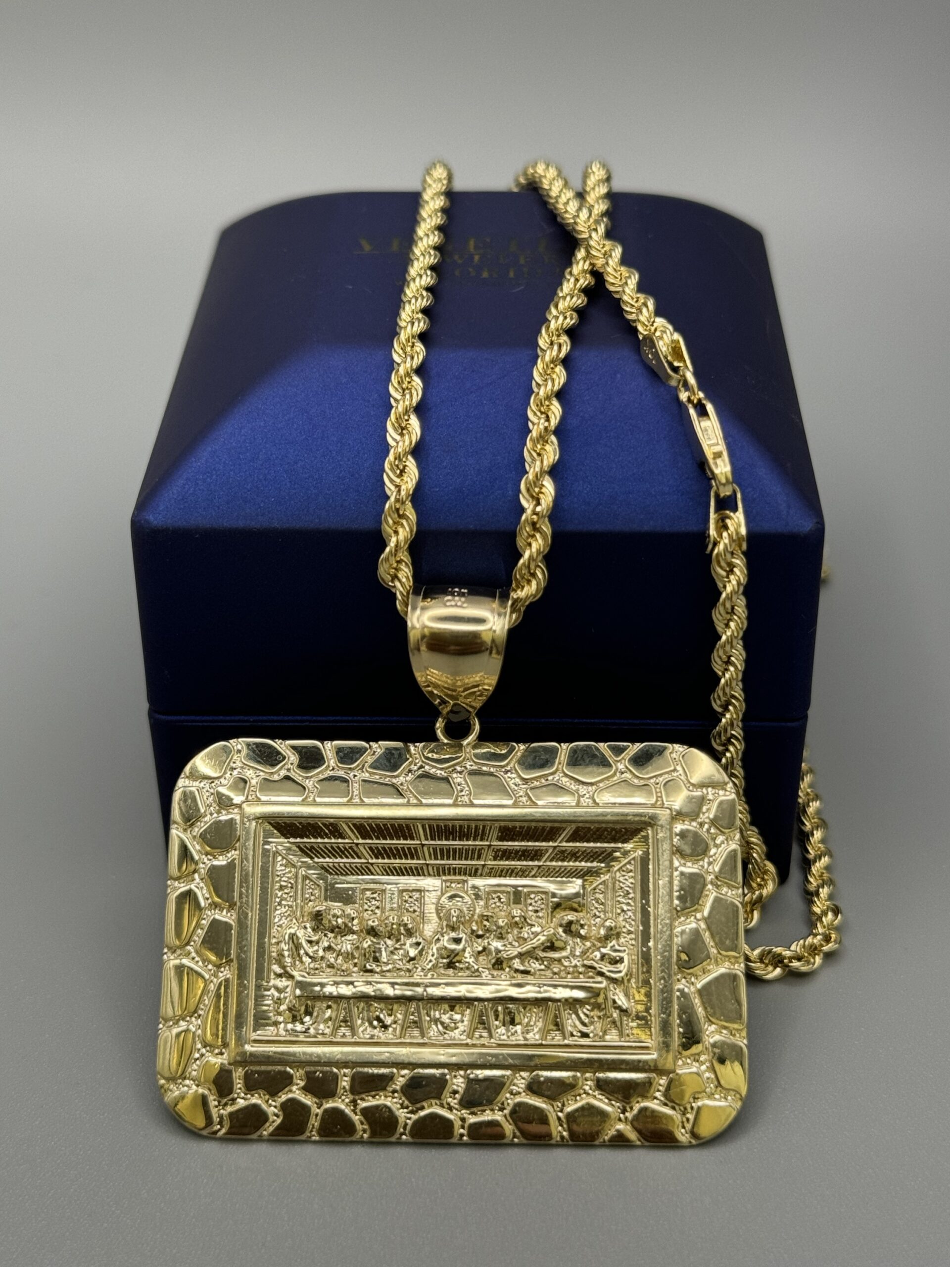Elevate your style with the 10KT Gold Last Supper Pendant Combo Set. Featuring a stunning 2″ tall by 2″ wide pendant and a 3MM 24″ rope necklace, this set weighs approximately 6.2 grams and 6.9 grams, respectively.