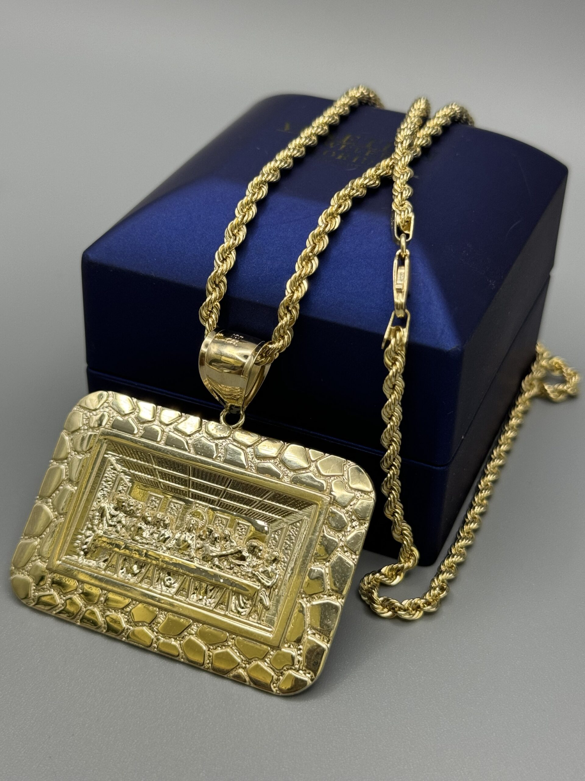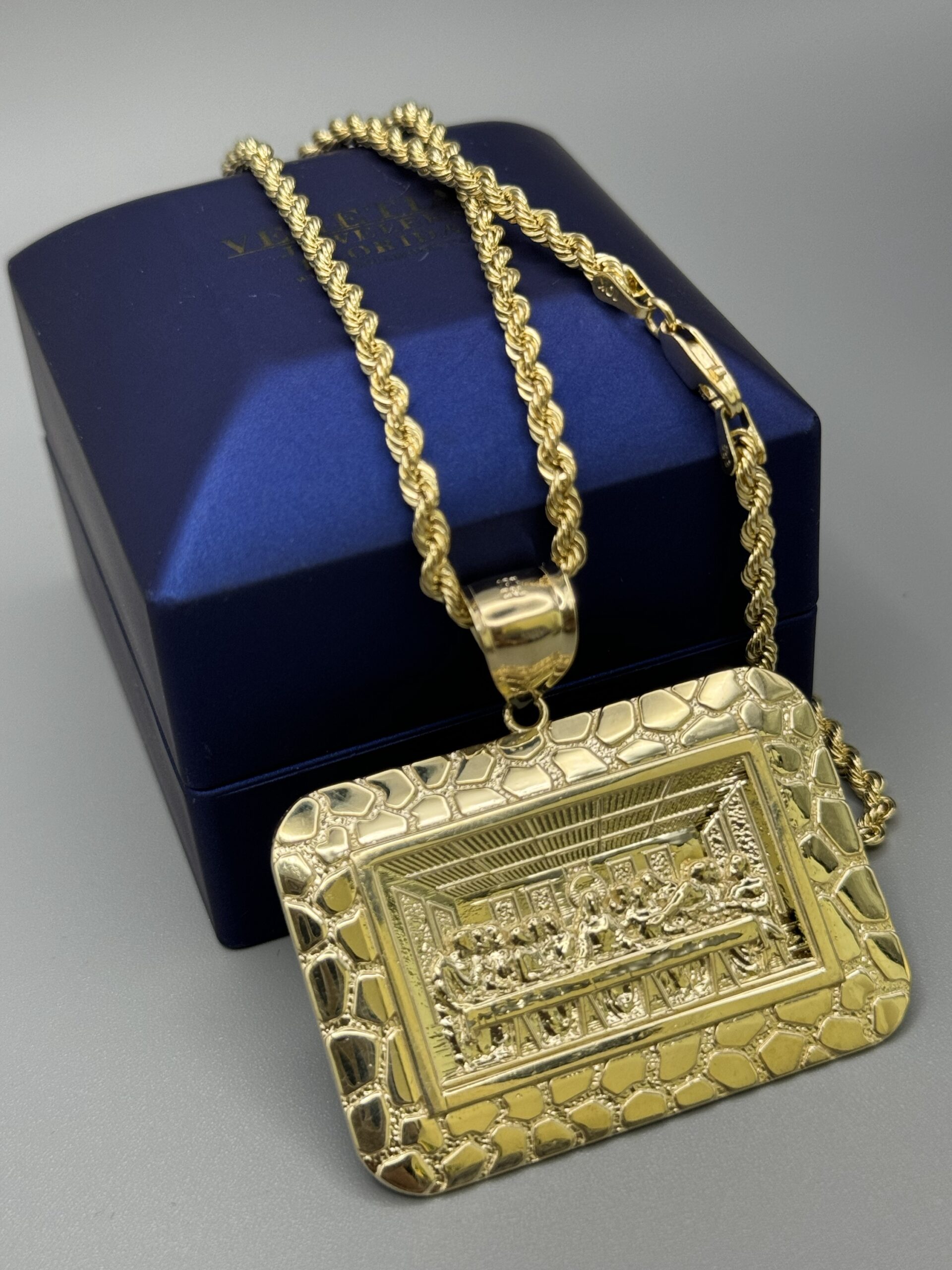 10KT GoldLastSupper Pendant ComboSet Comes With 3MM 24″ Rope Necklace Approx Gold Weight 6.2 Gram Pendant Approx Gold Weight 6.9 Gram 2″ Tall By 2″ Wide