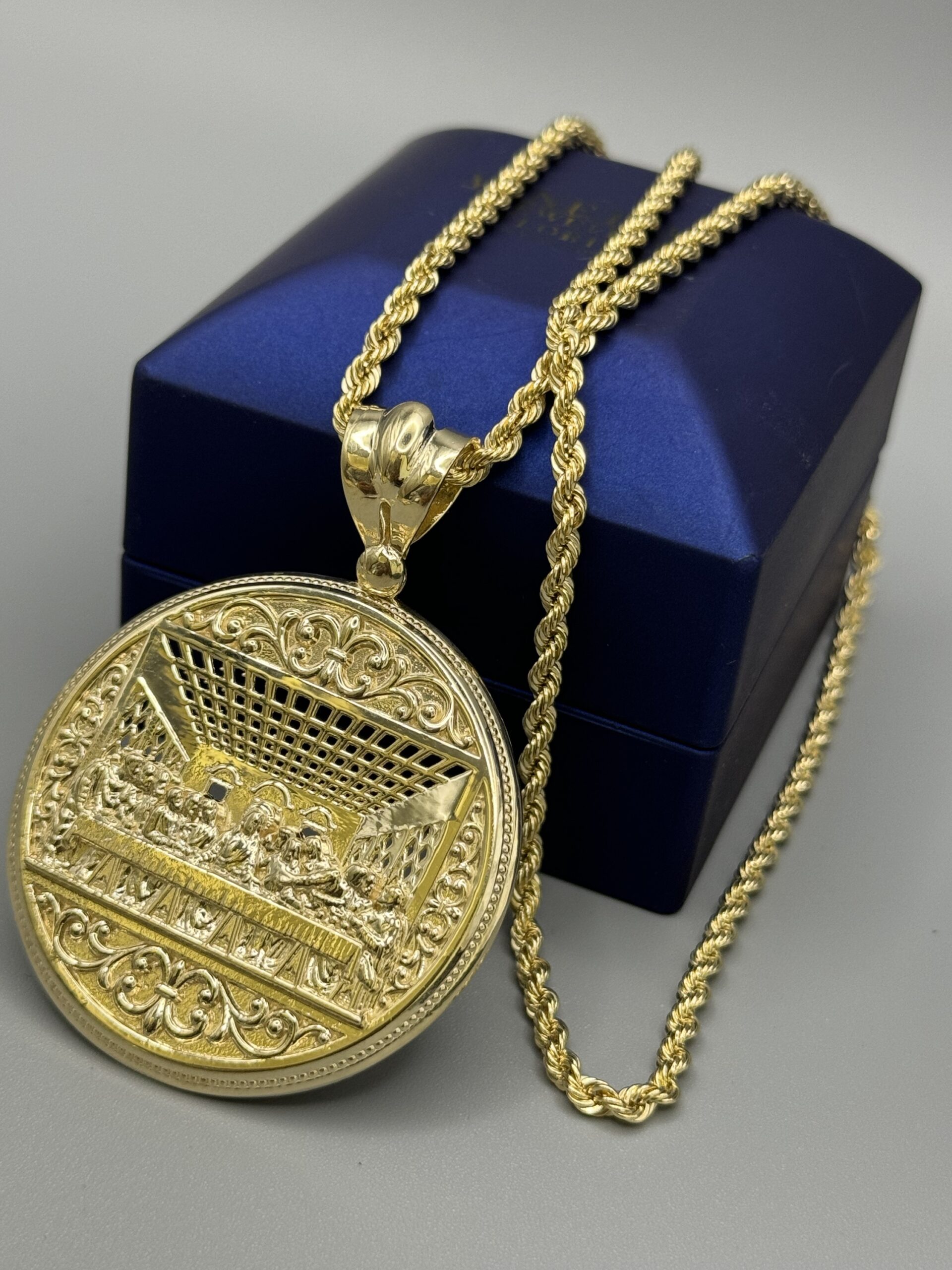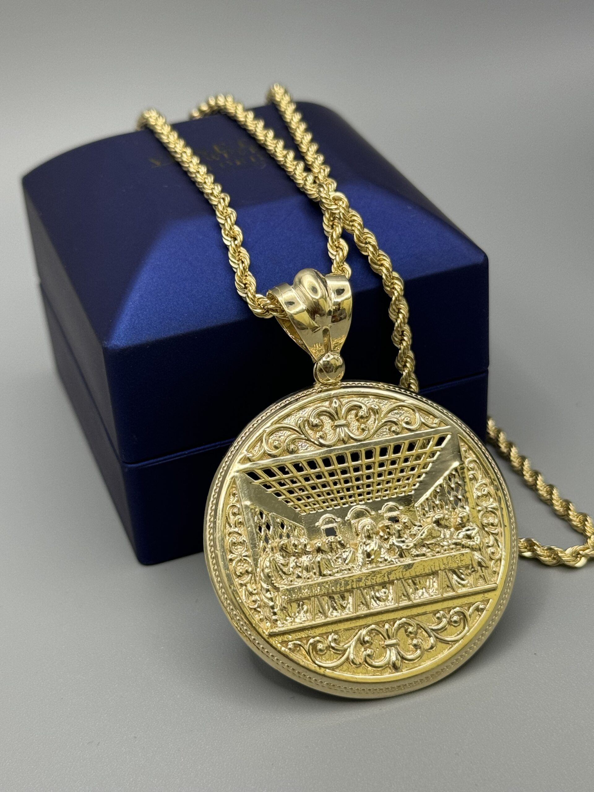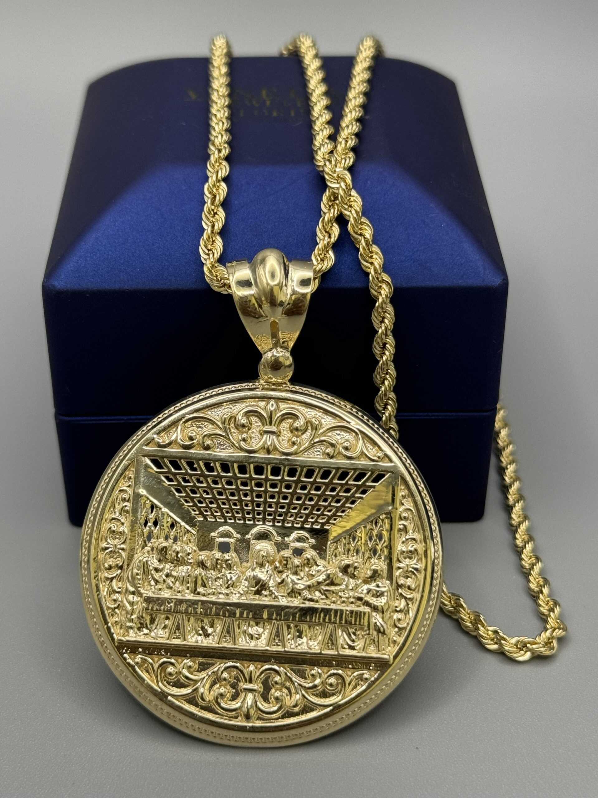 10KT Gold LastSupper Pendant ComboSet Comes With 6MM 24″ Rope Necklace Approx Gold Weight 6.3 Gram Pendant Approx Gold Weight 11.6 Gram 2.25″ Tall By 1.75″ Wide