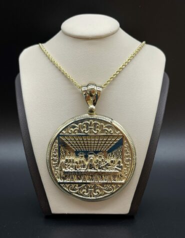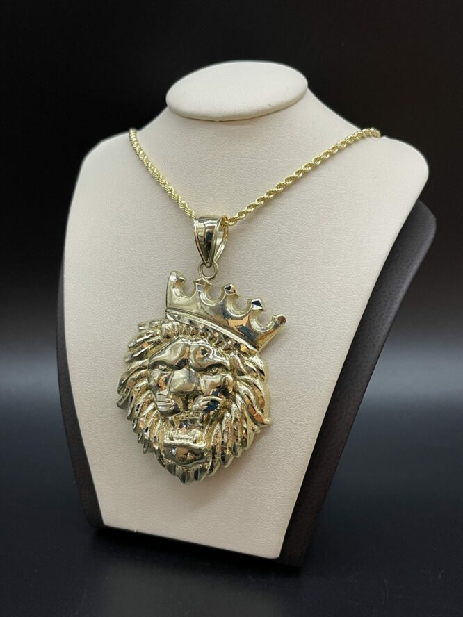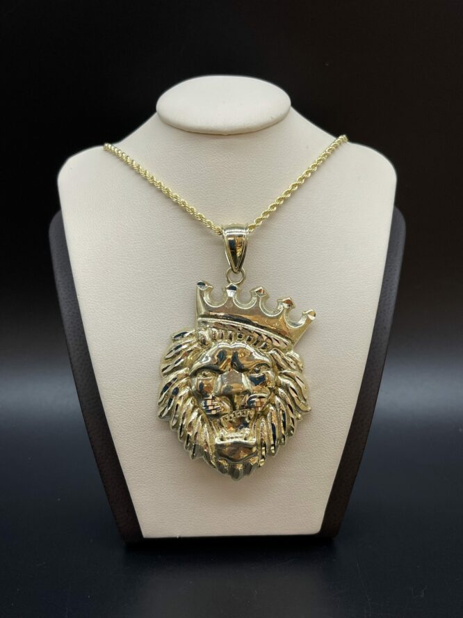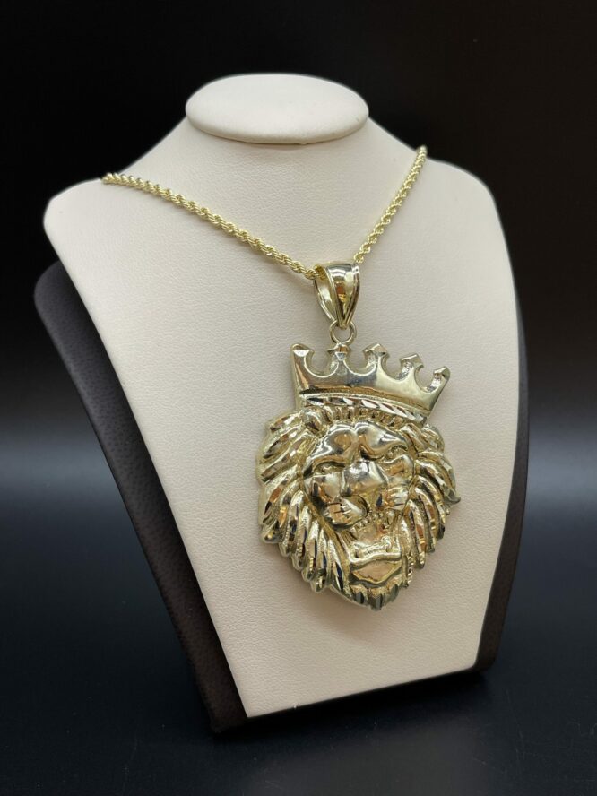 10KT Gold Lion With Crown Head Combo Set Comes With 24″ Rope Approx Gold Weight 3.06 Gram 2MM Pendant Approx Gold Weight 11.91 Gram 2.75″ Tall Includes Bell 1.75″ Wide Pendant