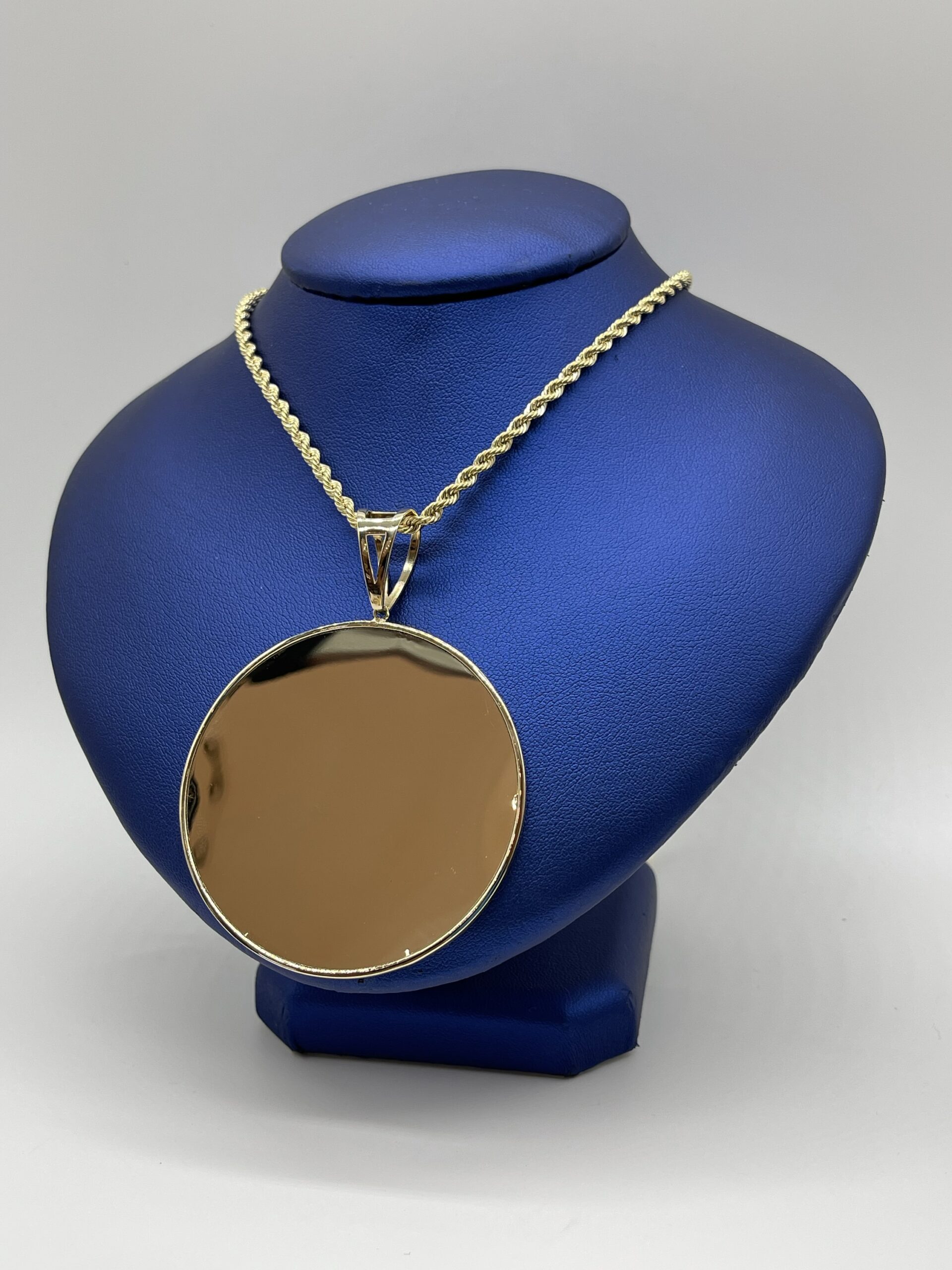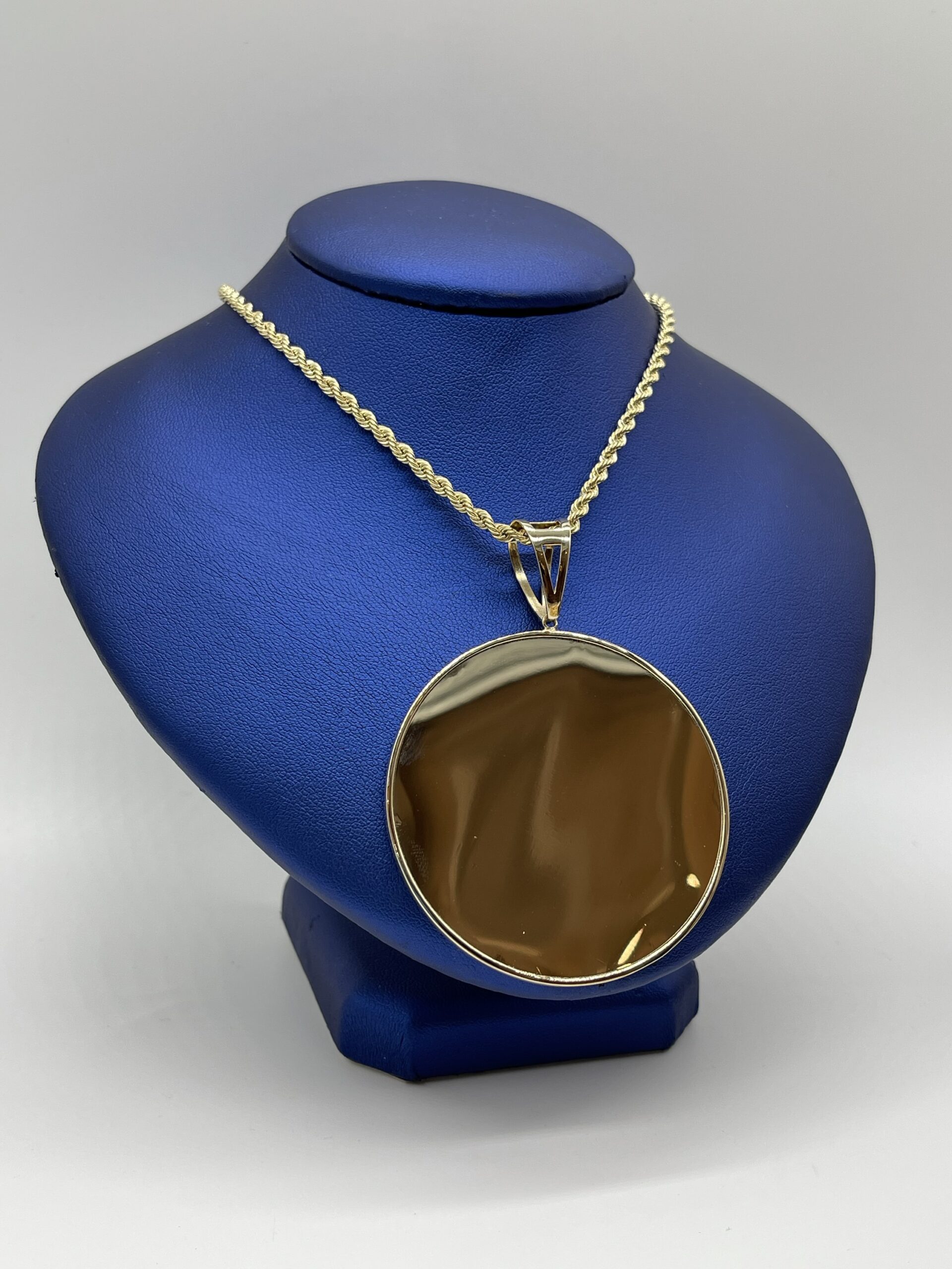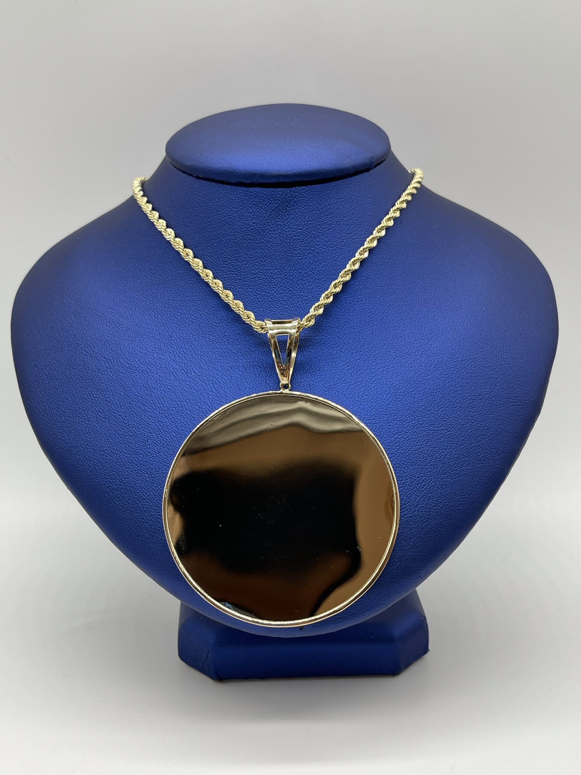 10KT Gold Memory Picture Pendant ComboSet 2.25″ All Around By 3.0″ Tall Includes Bell Approx Gold Weight 14.12 Comes With 10KT 3MM Rope 22″ Approx Gold Weight 5.66 Gram Every Order Comes With Free Picture Installed Or Engraving