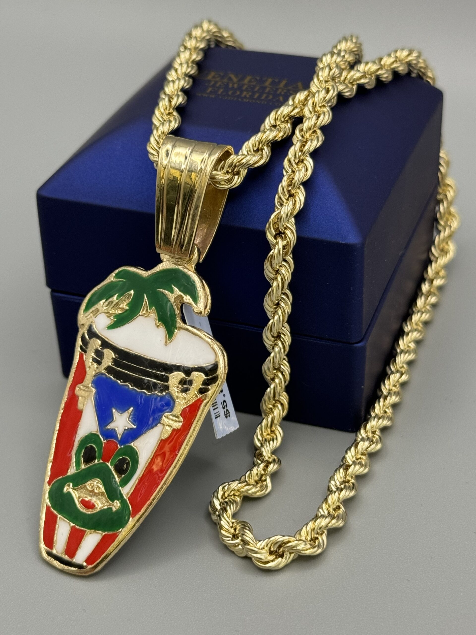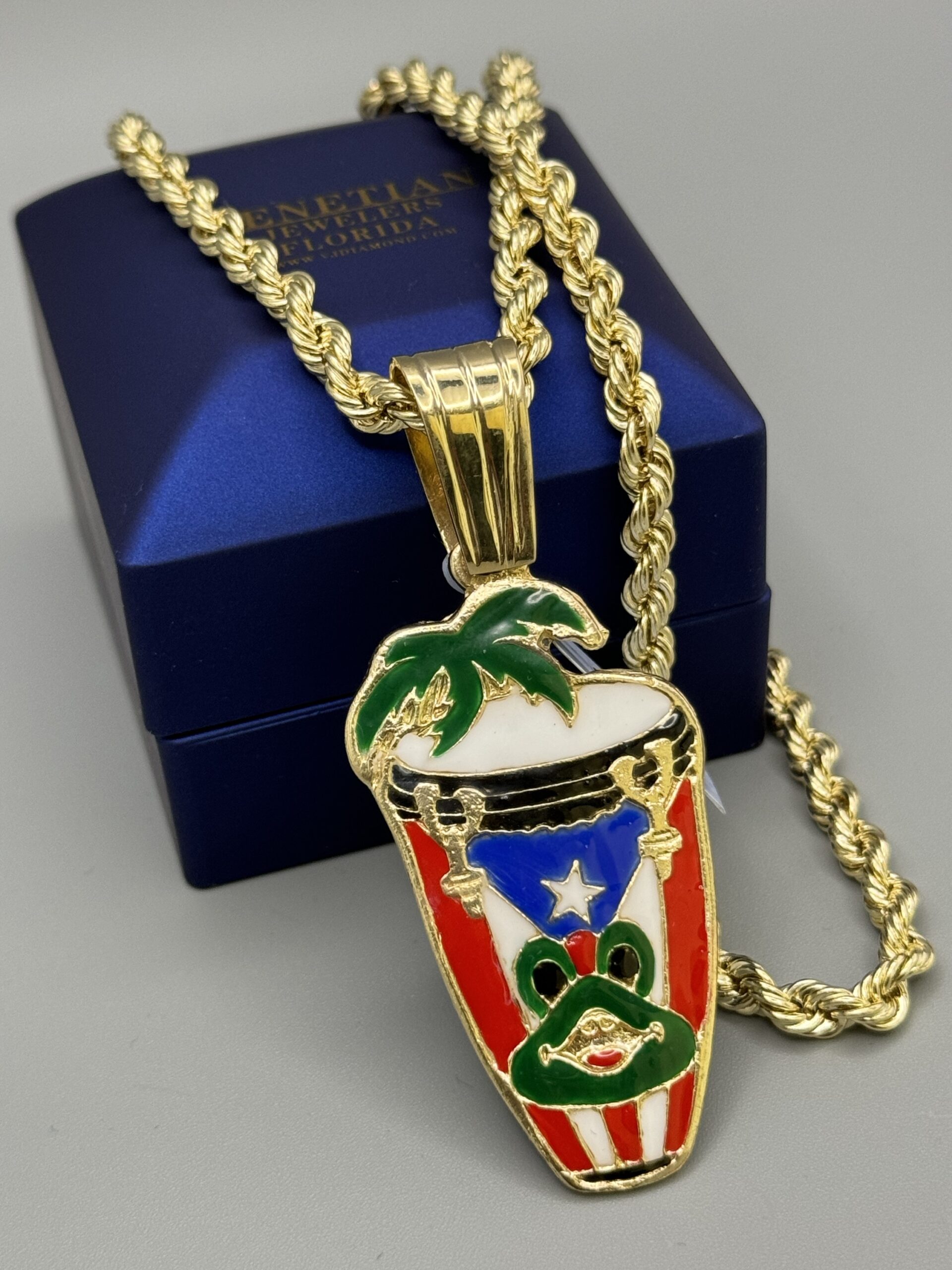 10KT Gold Puerto Rico Conga Drum Pendant With Palm Tree ComboSet Comes With 22″ Chain 5Mm Approx Gold Weight 8.8 Gram Pendant HandMade Solid With Beautiful Enamel Job 2.75″ Tall By 1.25″ Wide Approx Gold Weight 15.1 Gram