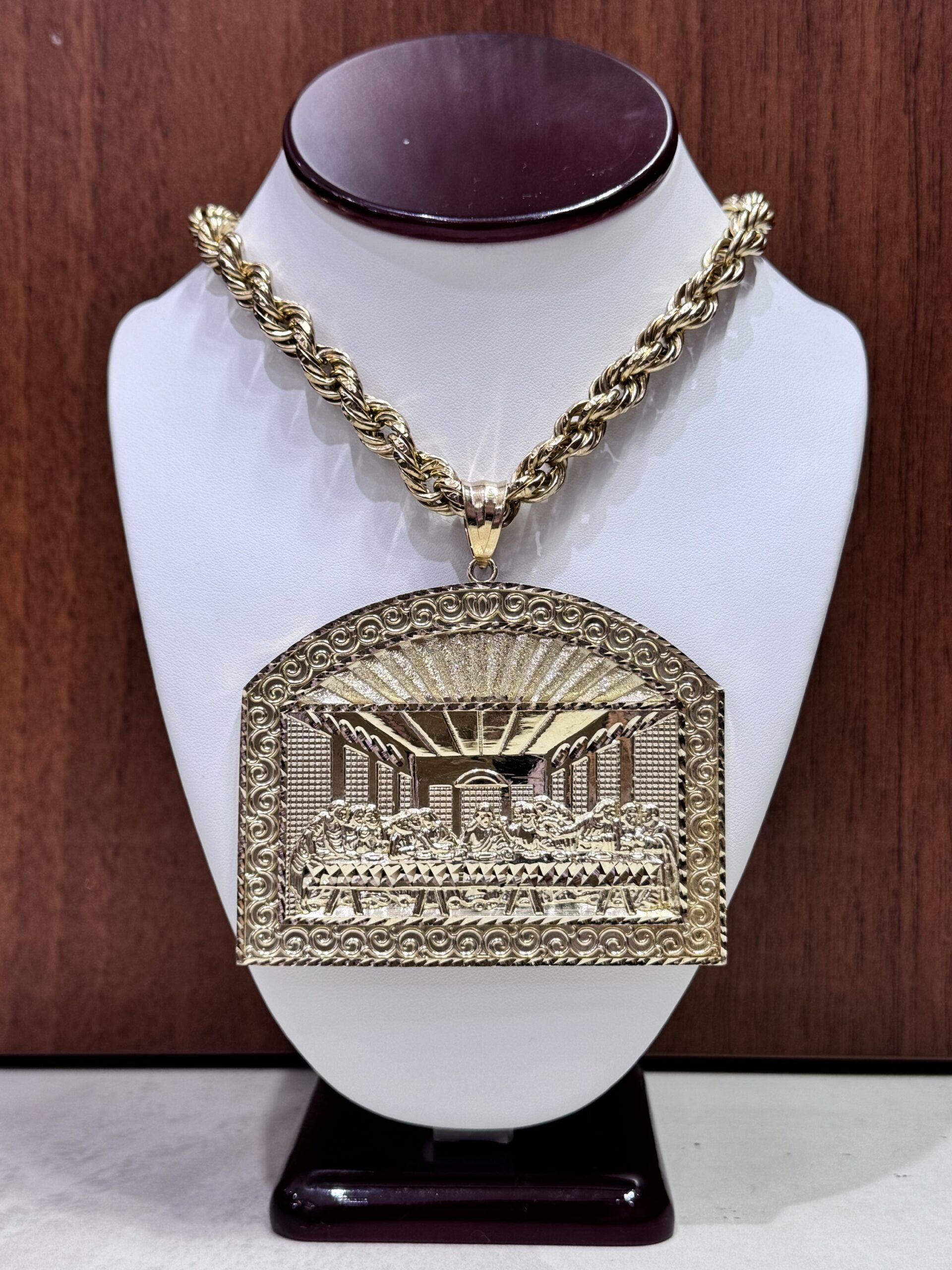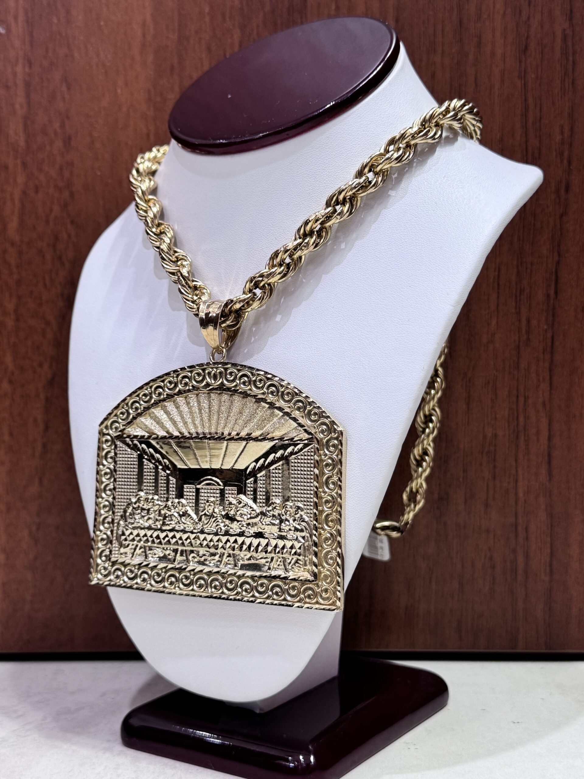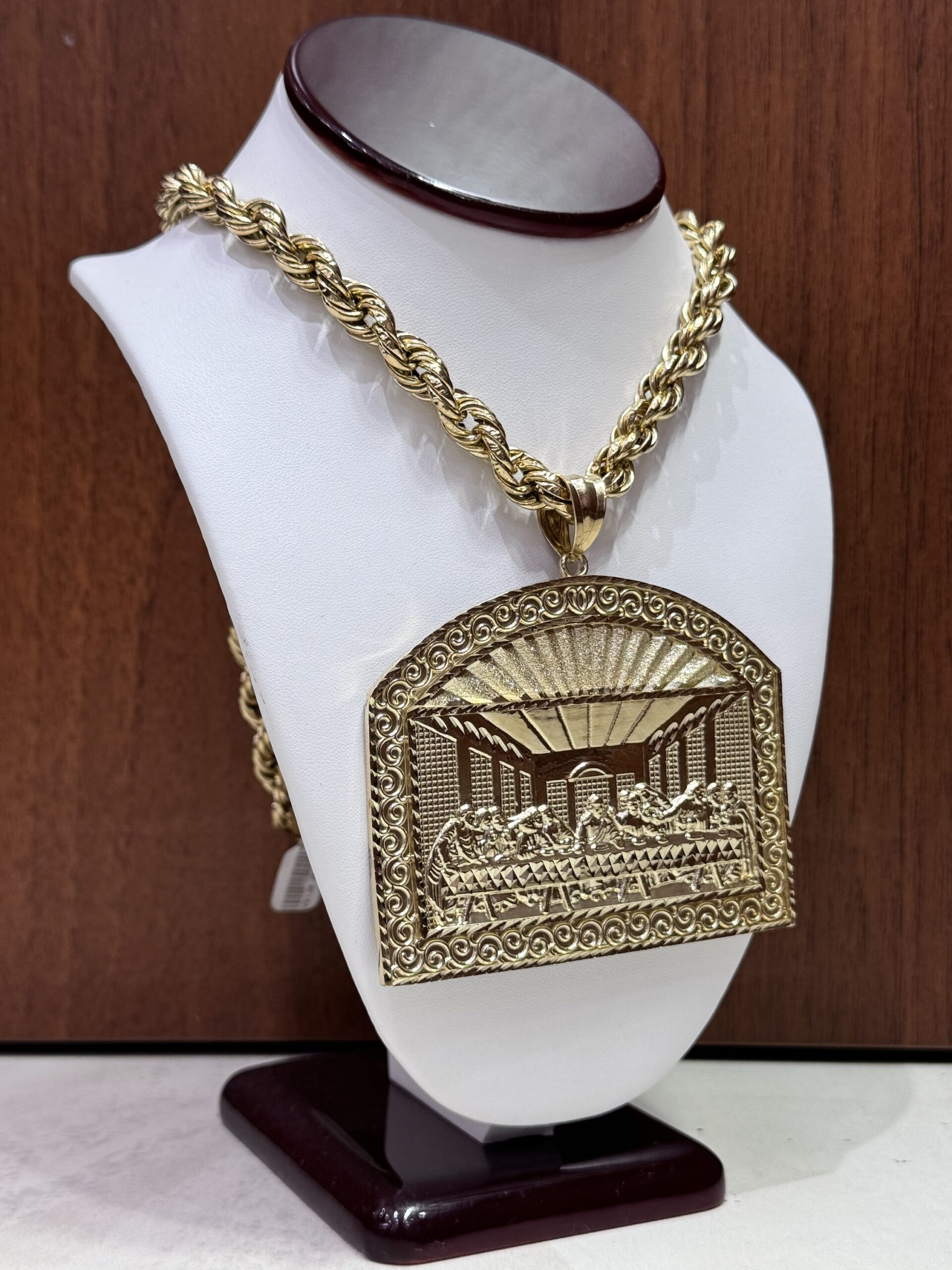 Elevate your style with this stunning 10KT Gold Saint Lazaro Pendant Combo Set, featuring a 3.80″ x 3.75″ pendant weighing 77.9 grams and a 26″ 10MM rope necklace at 31.8 grams. A true statement piece!