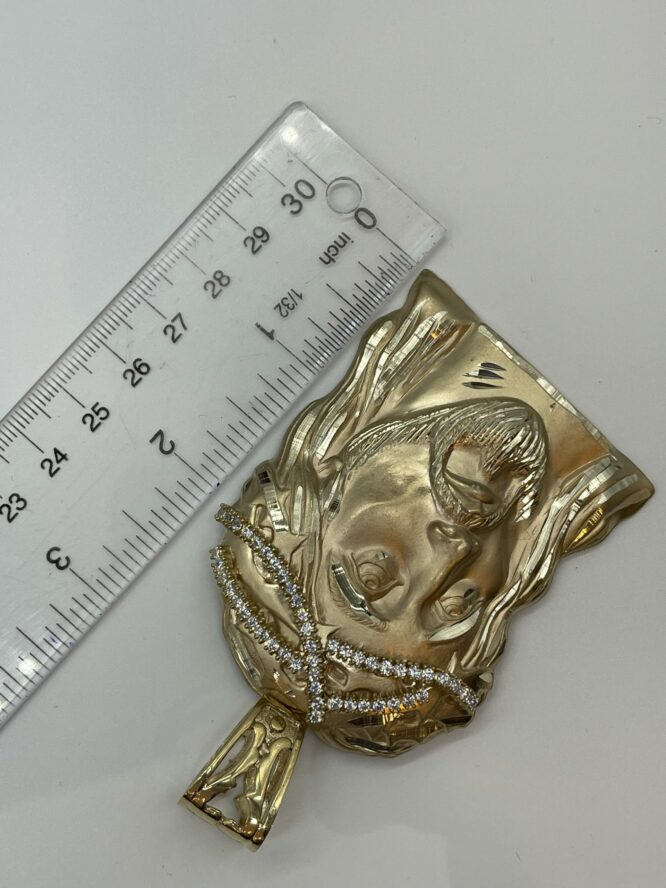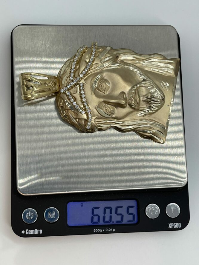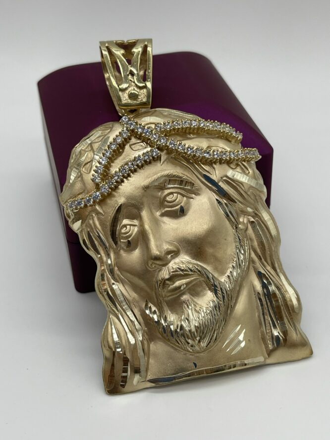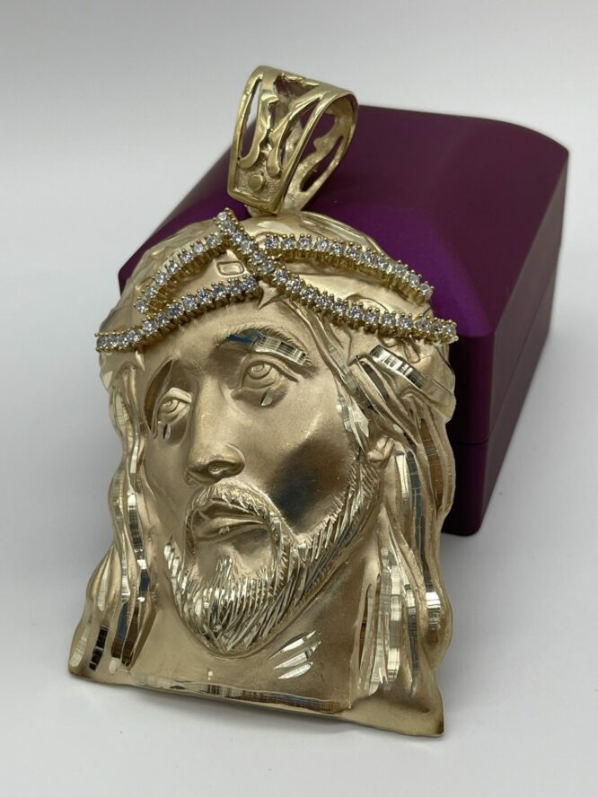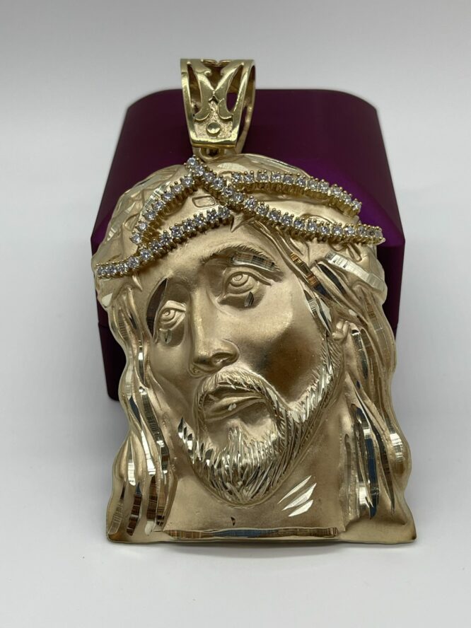 10Kt Gold Solid Back Jesus Head 3.5 Inches Tall Custom Made With CZ Stones On Jesus Throne Approx Gold Weight 60.55 Gram With Frosted Finish