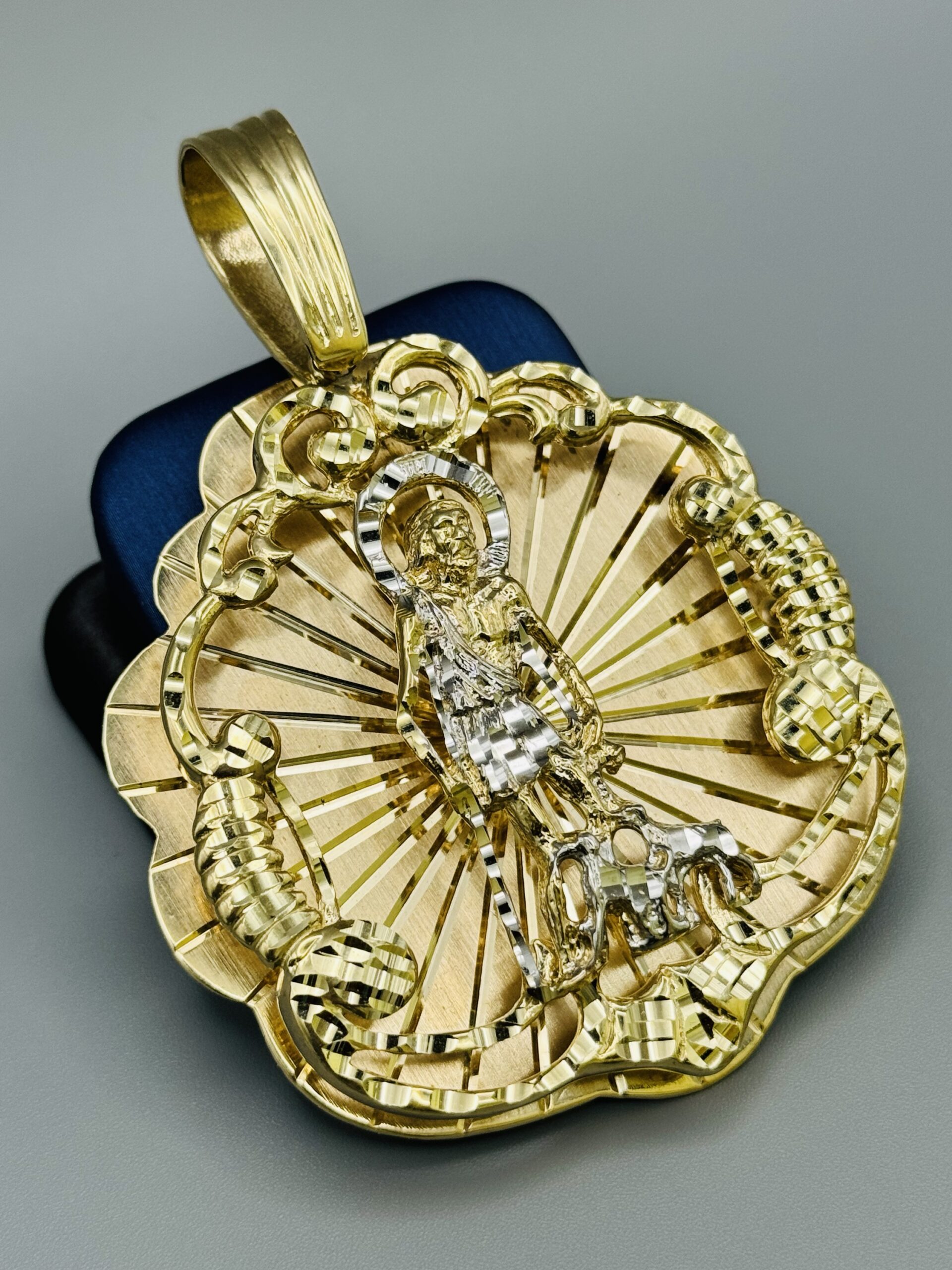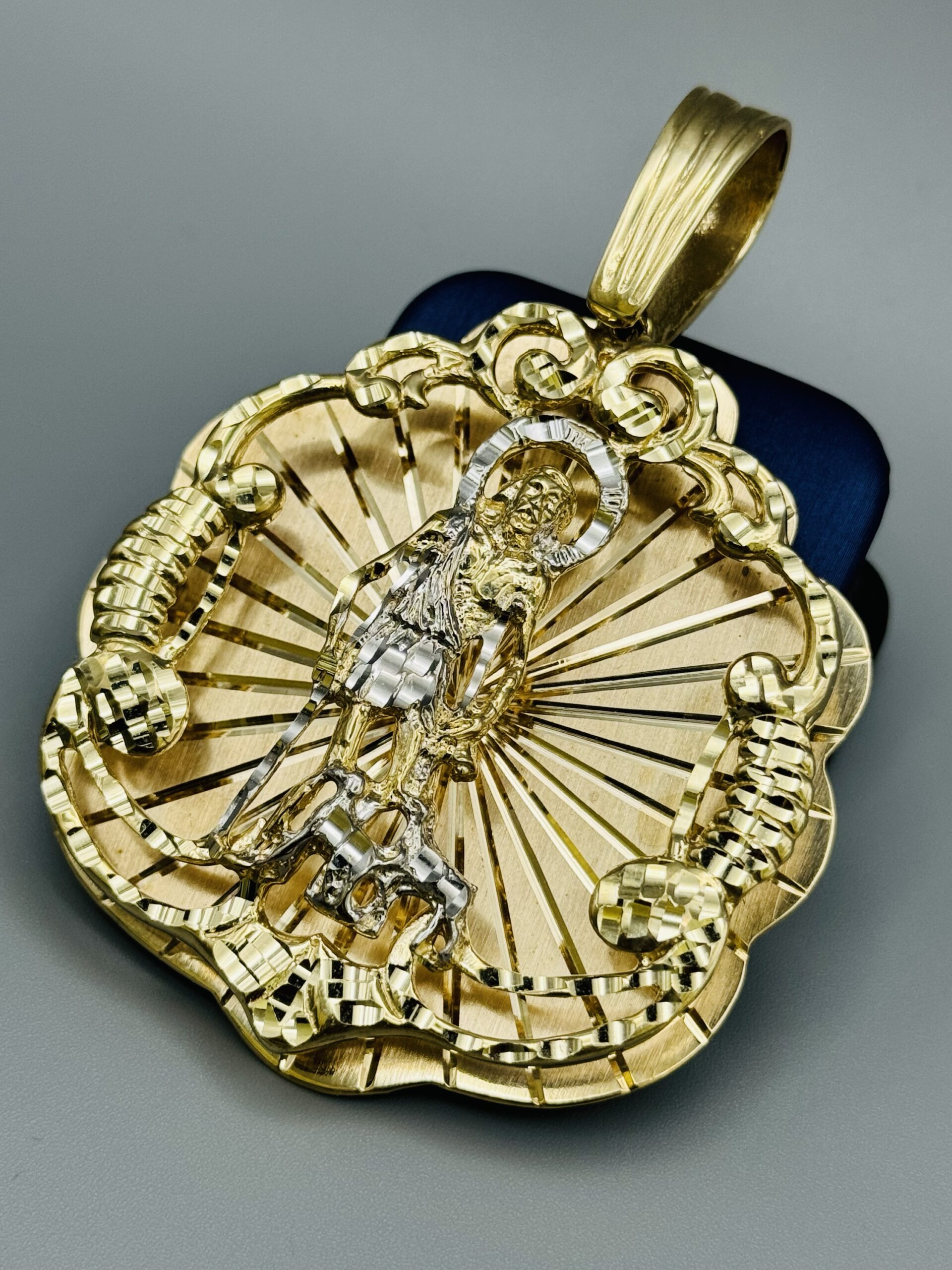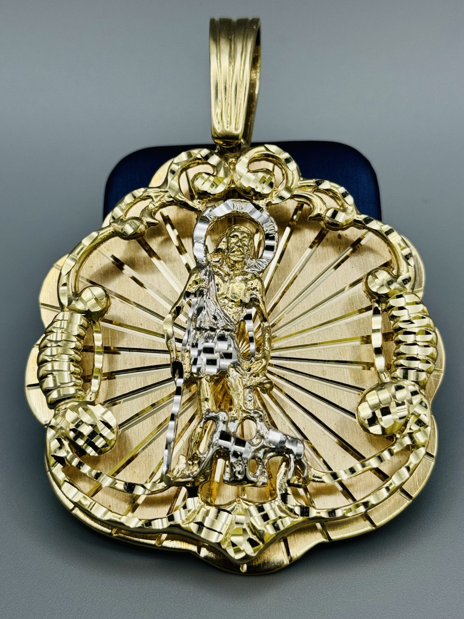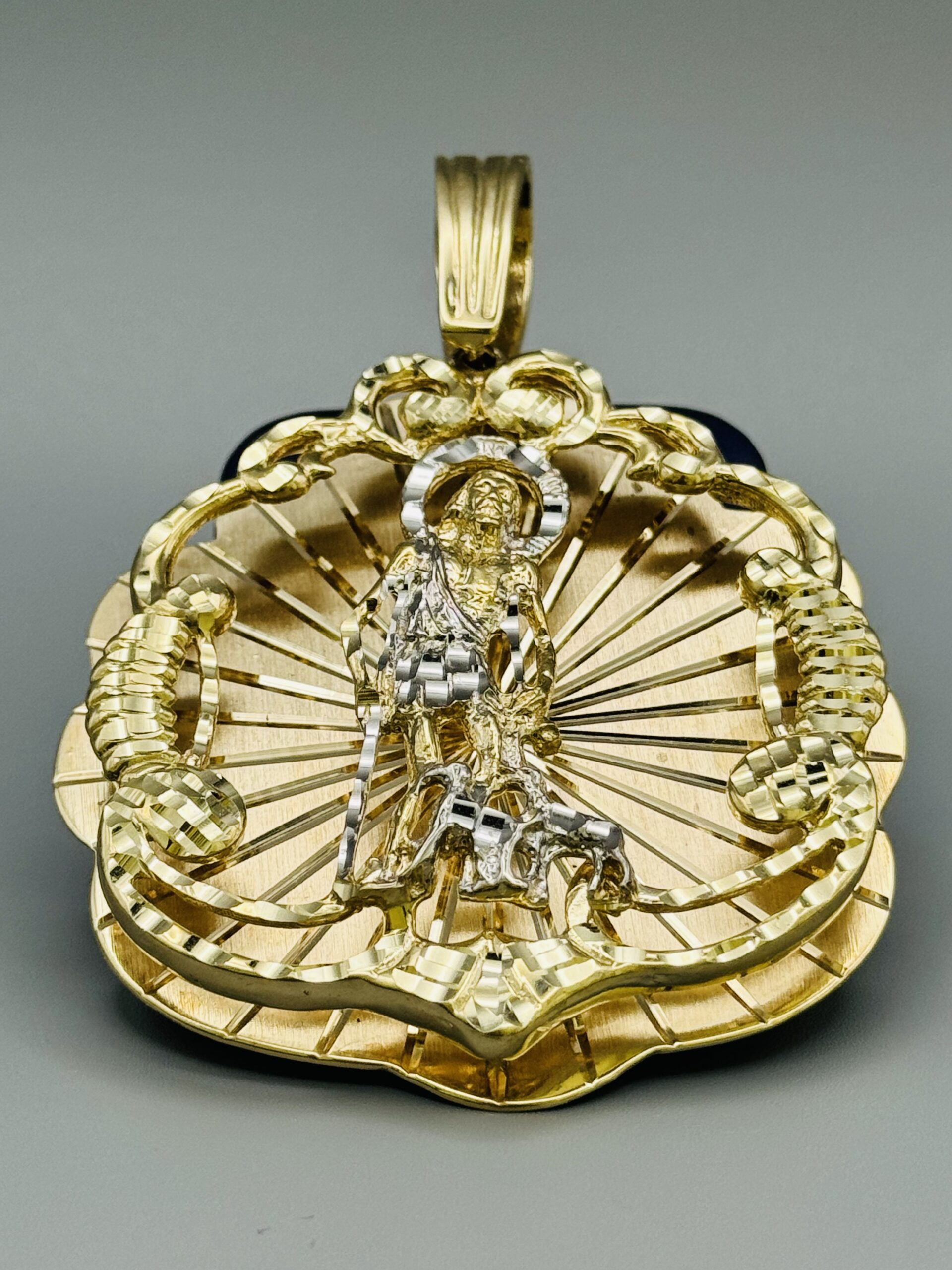 Elevate your style with this stunning 10KT Gold Solid St. Lazaro Pendant. Measuring 2.75″ tall and weighing 61.1g, its intricate 3D design shines beautifully, perfect for any occasion.