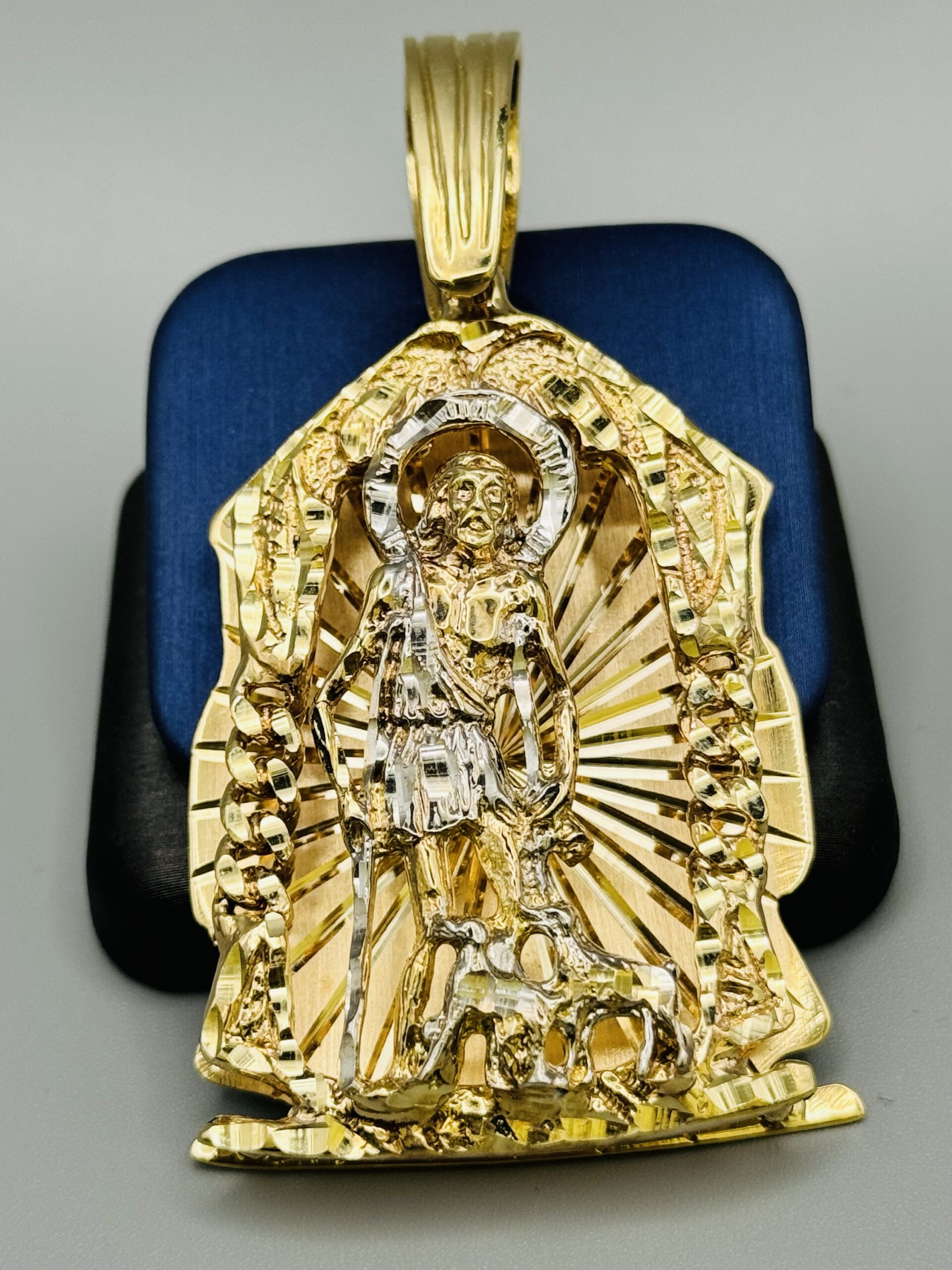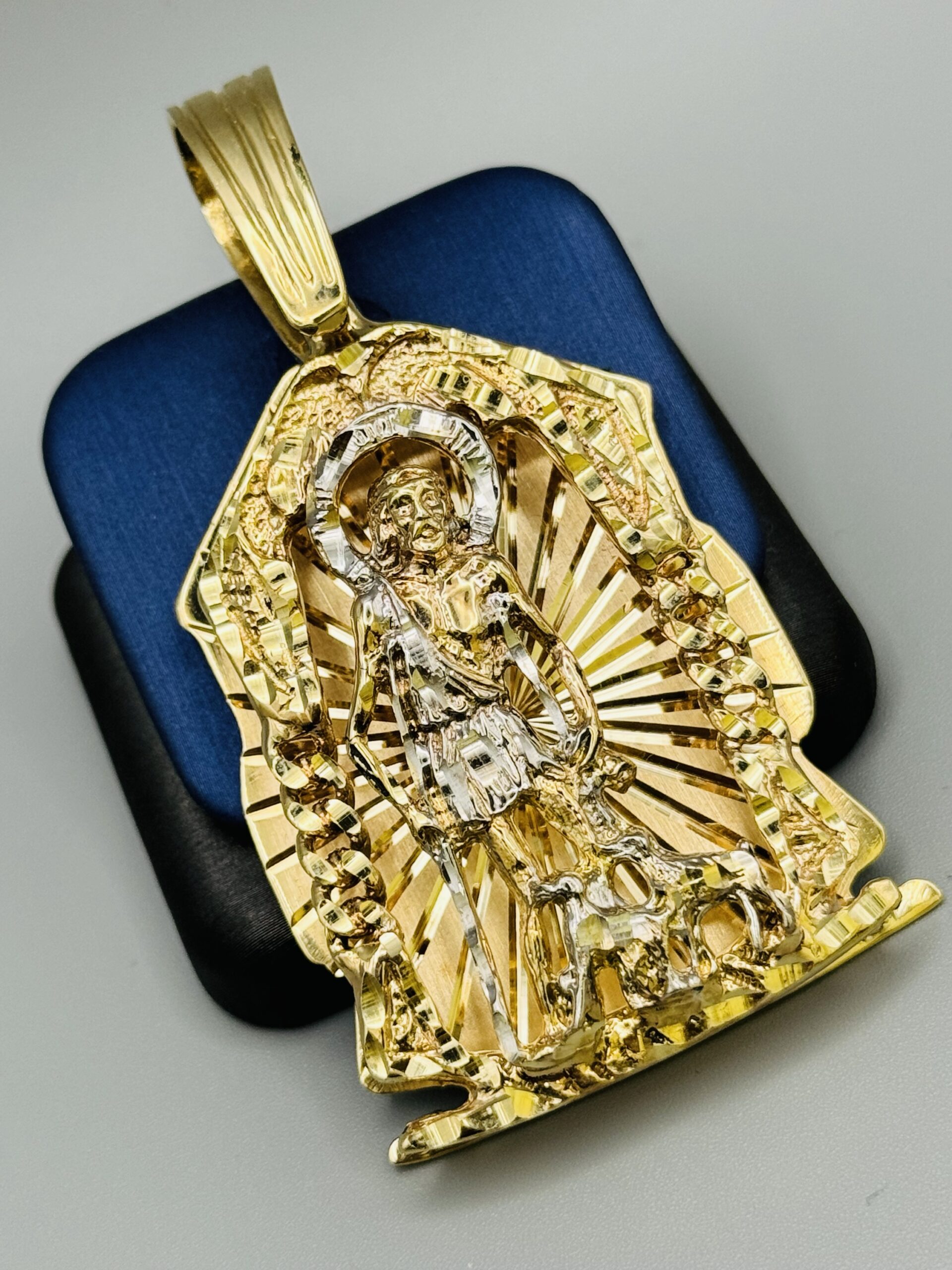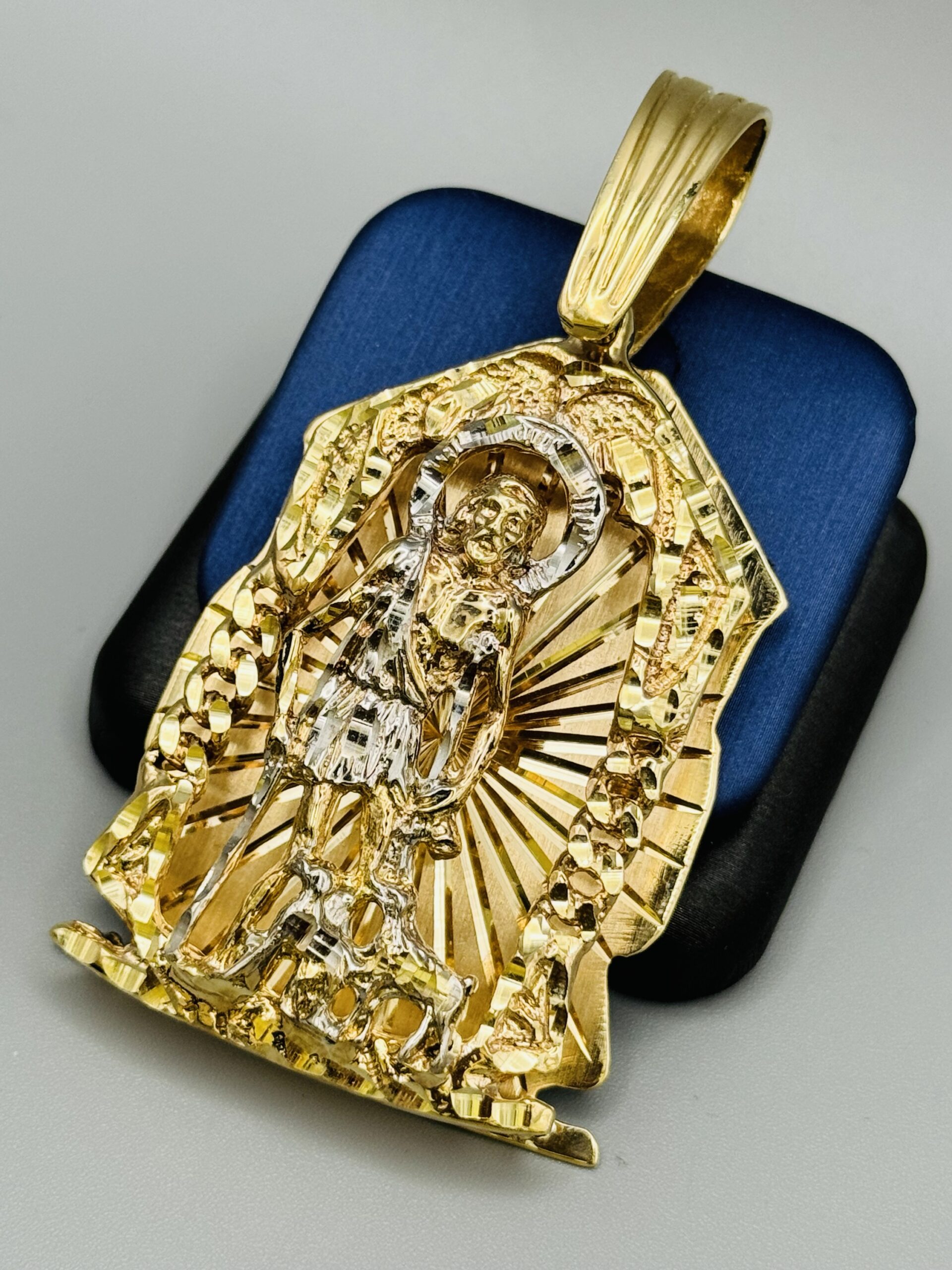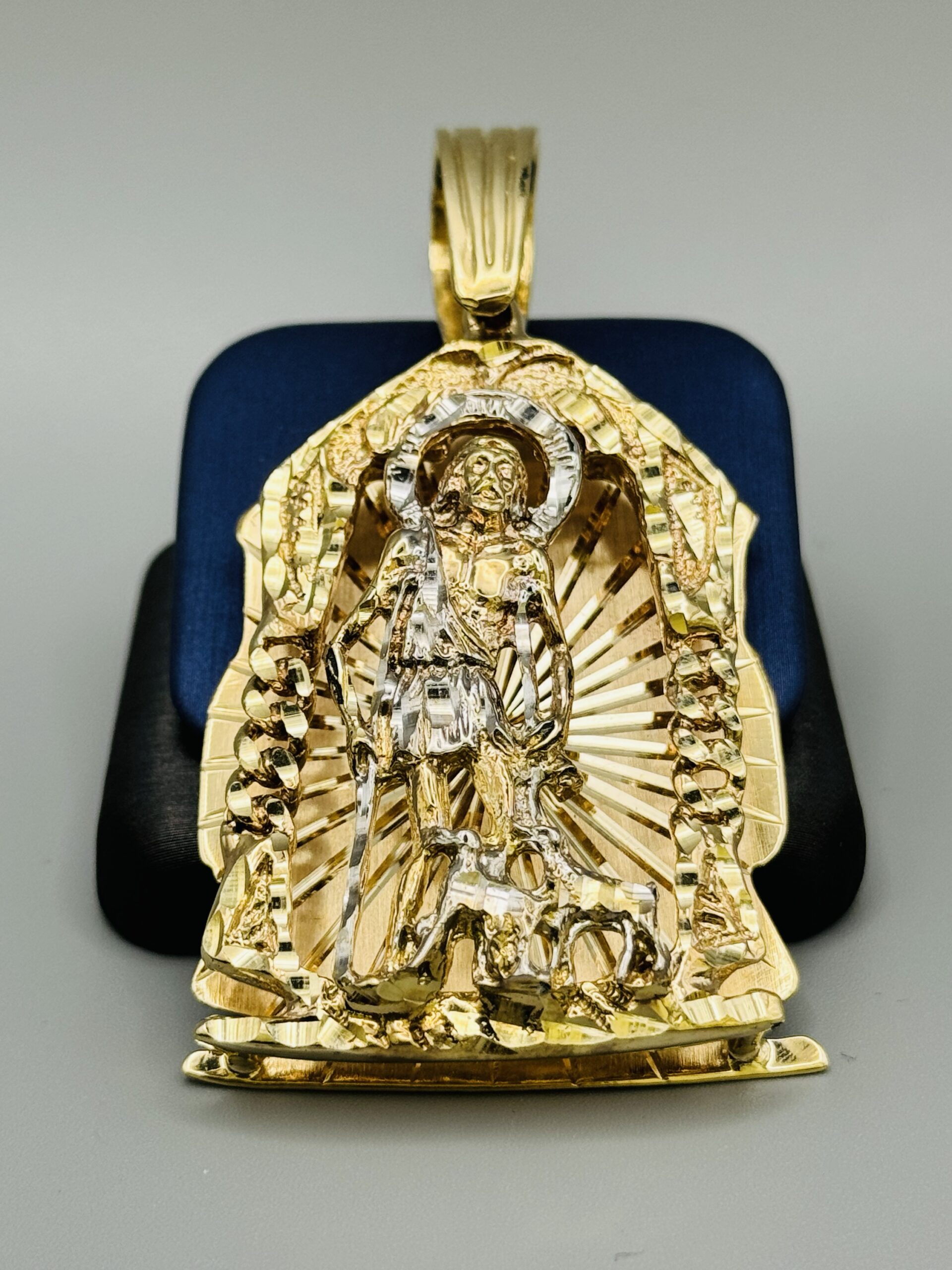 Elevate your style with this stunning 10KT Gold St. Lazaro Pendant. Featuring a detailed 3D design and solid back, it measures 2″ tall by 1″ wide, weighing approximately 40.8 grams. A timeless accessory!