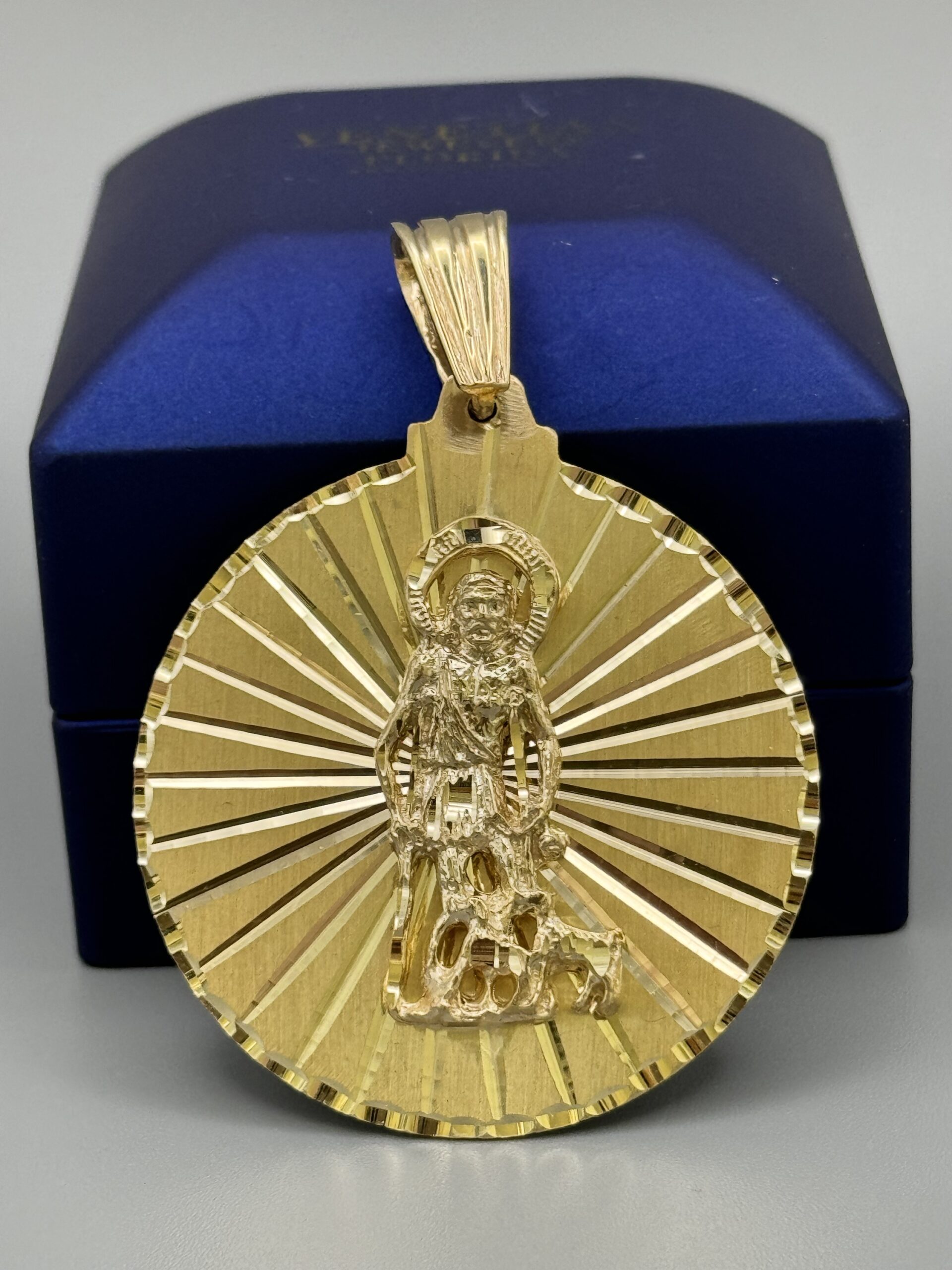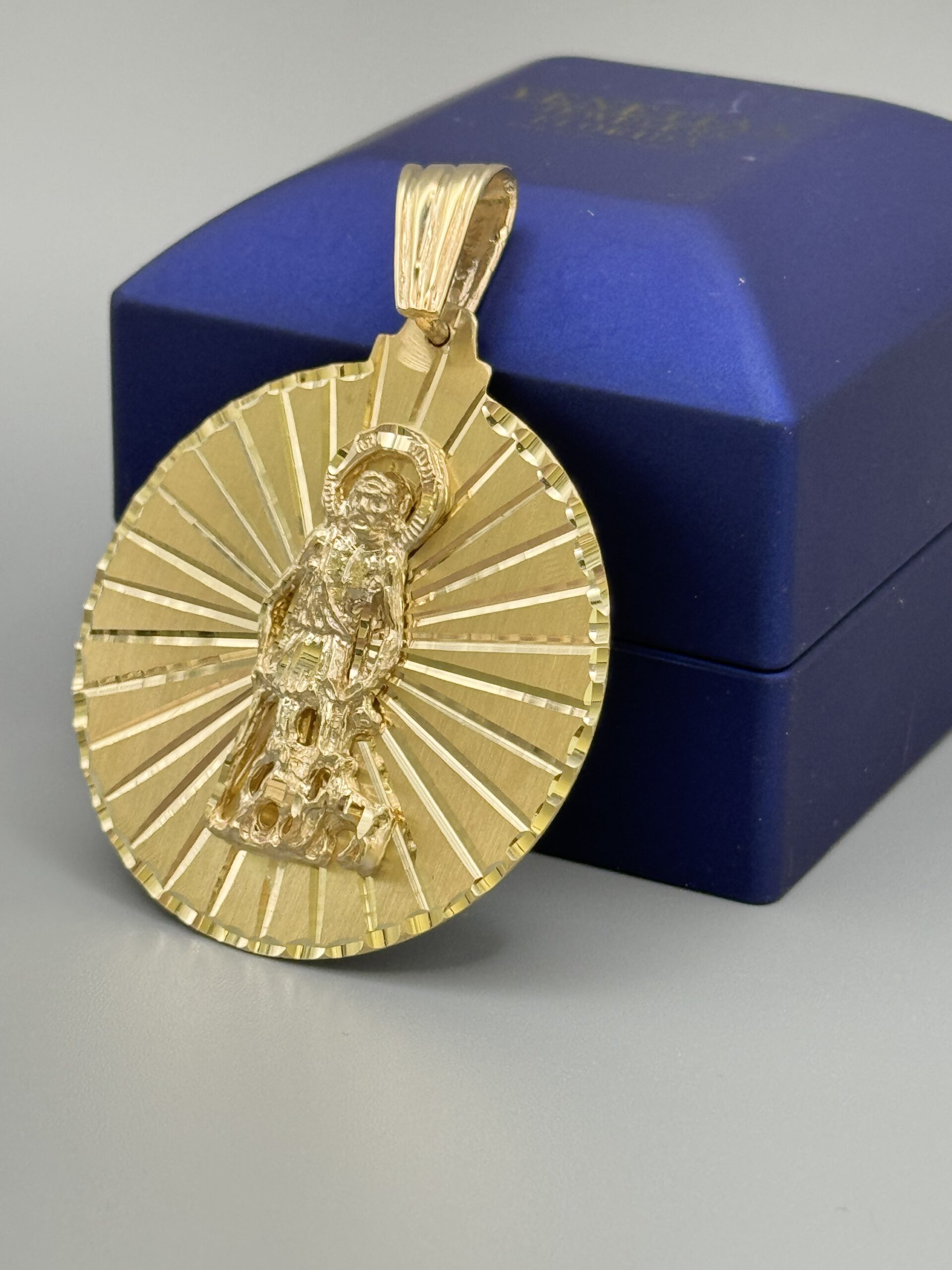 10KT Gold Solid St.Lazaro Pendant Medium Size With LaserCut Design Approx Gold Weight 15.7 Gram 2.5″ Tall Approx 1.75″ All Around Big Enough Opening To Fit Upto 10MM Necklace