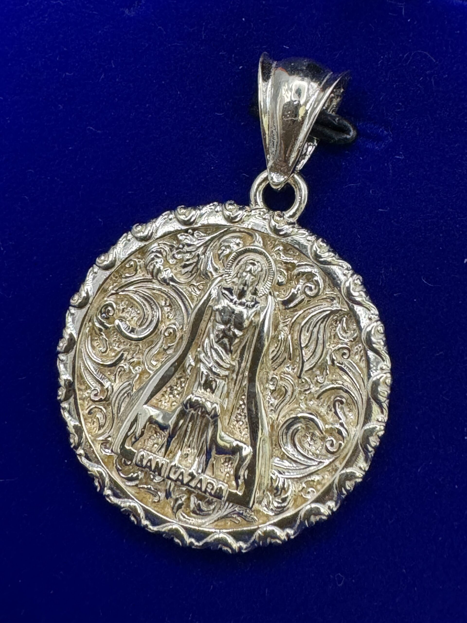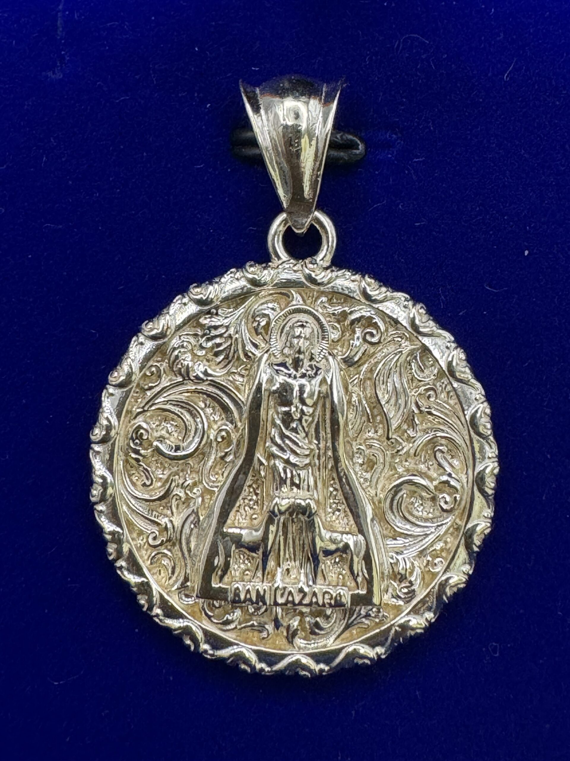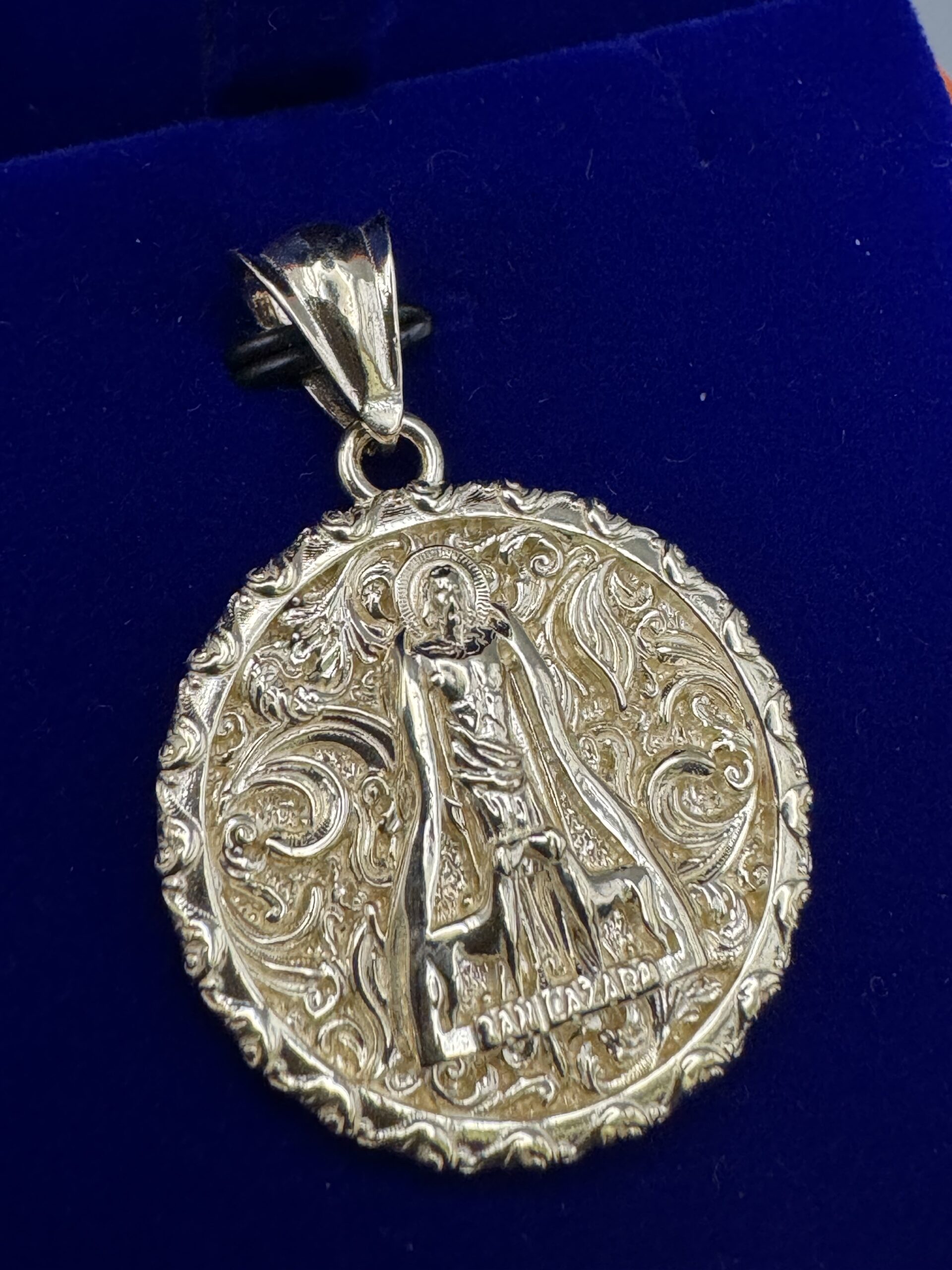 Adorn yourself with the exquisite 10KT Gold St Lazaro Medallion Pendant. At 1.5″ tall and 1.1″ wide, this handcrafted piece weighs 7.2 grams, showcasing a stunning hand-carved design. A perfect blend of elegance and spirituality!