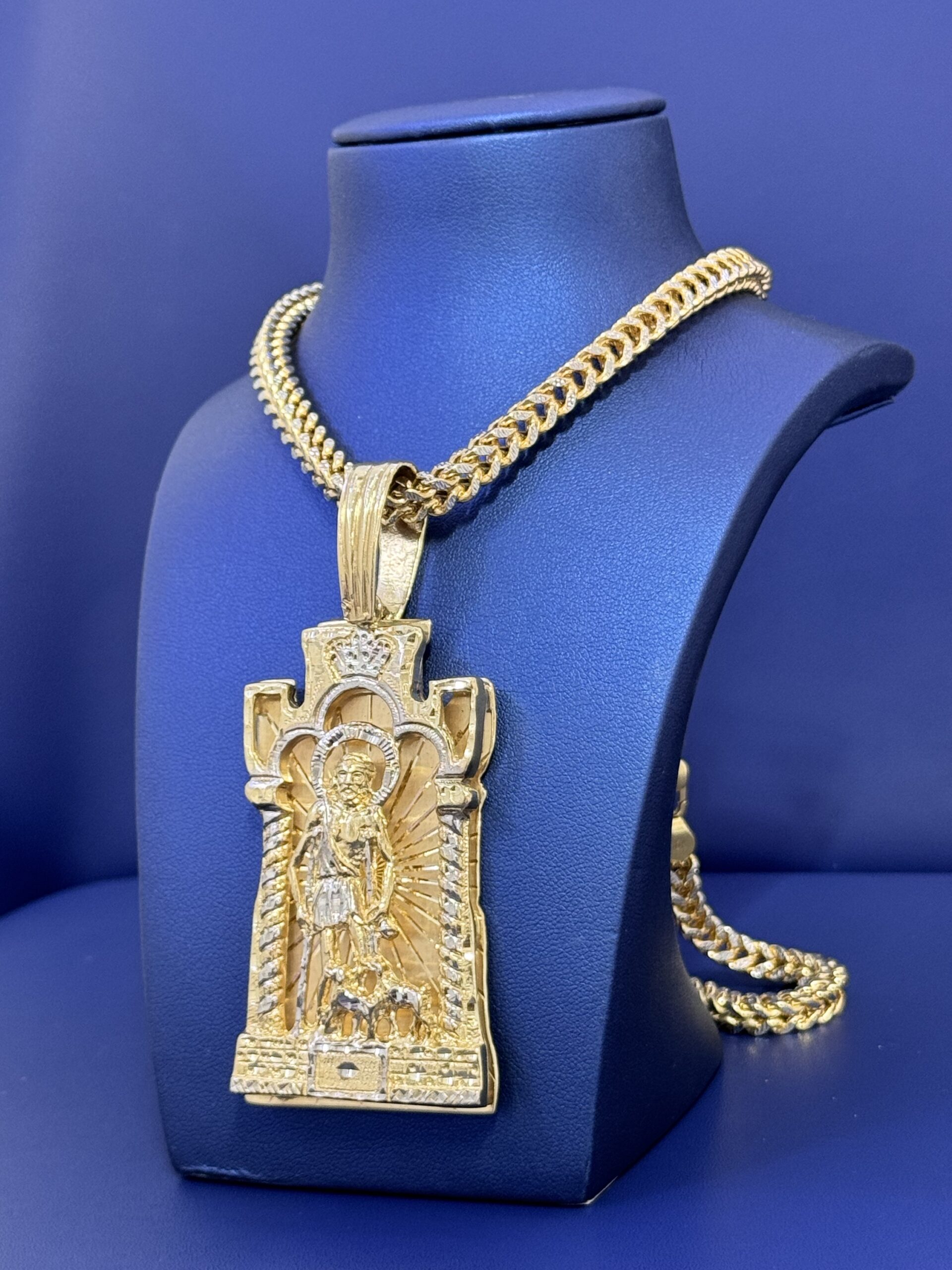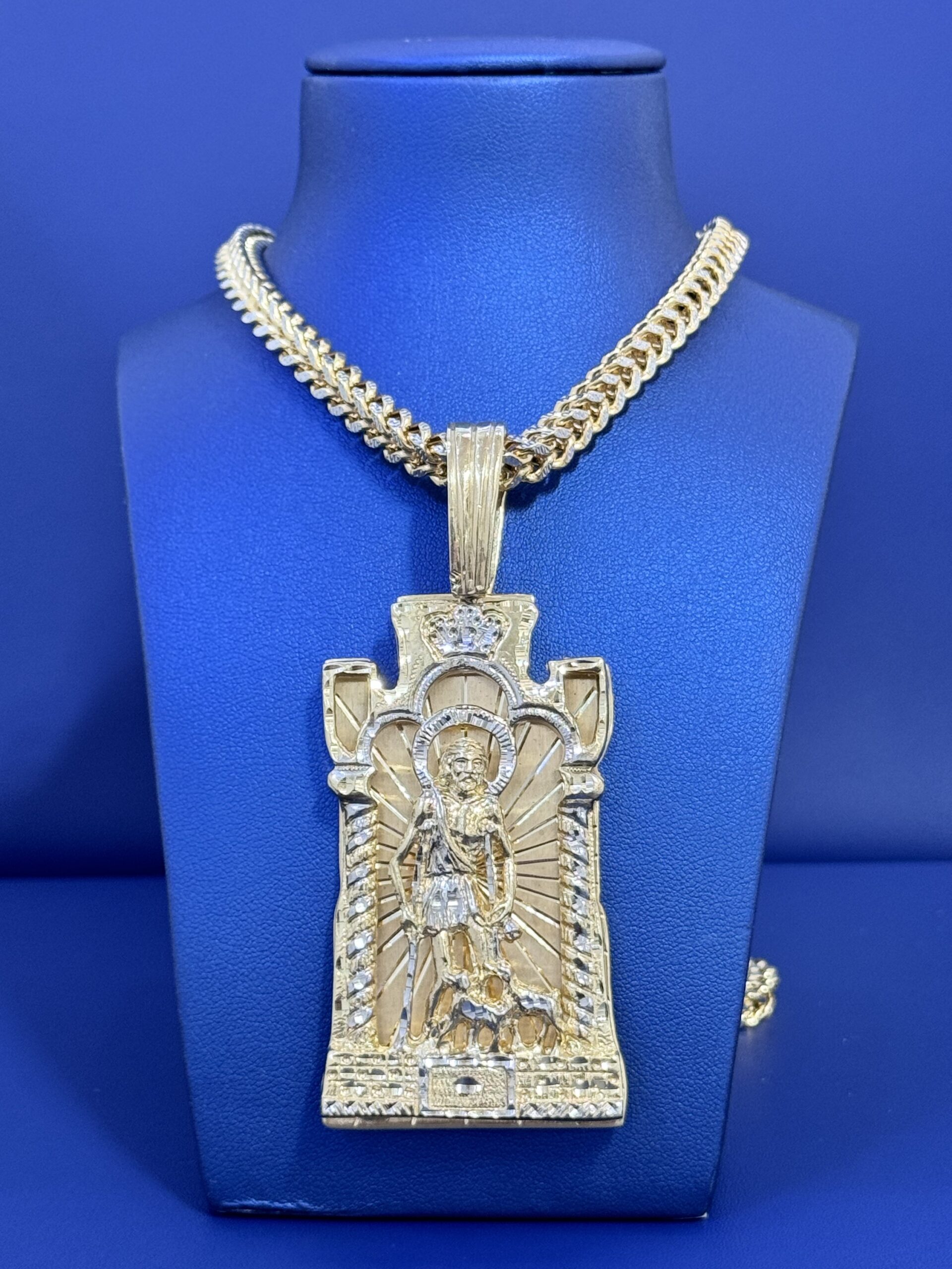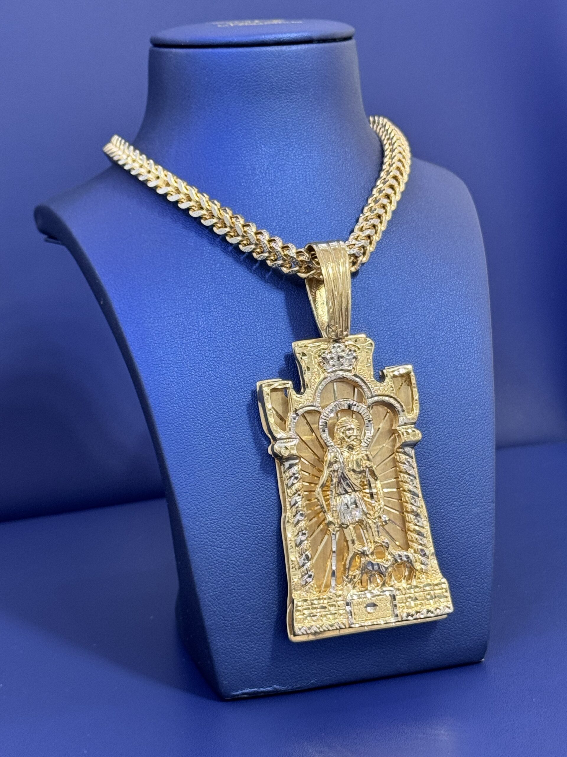 10KT Gold St.Lazaro Pendant ComboSet Comes With 6Mm Franco DiamondCut Necklace 24″ Approx Gold Weight 41.9 Gram Pendant Approx Gold Weight 55.3 Gram 3.75″ Tall By 1.65″ Wide