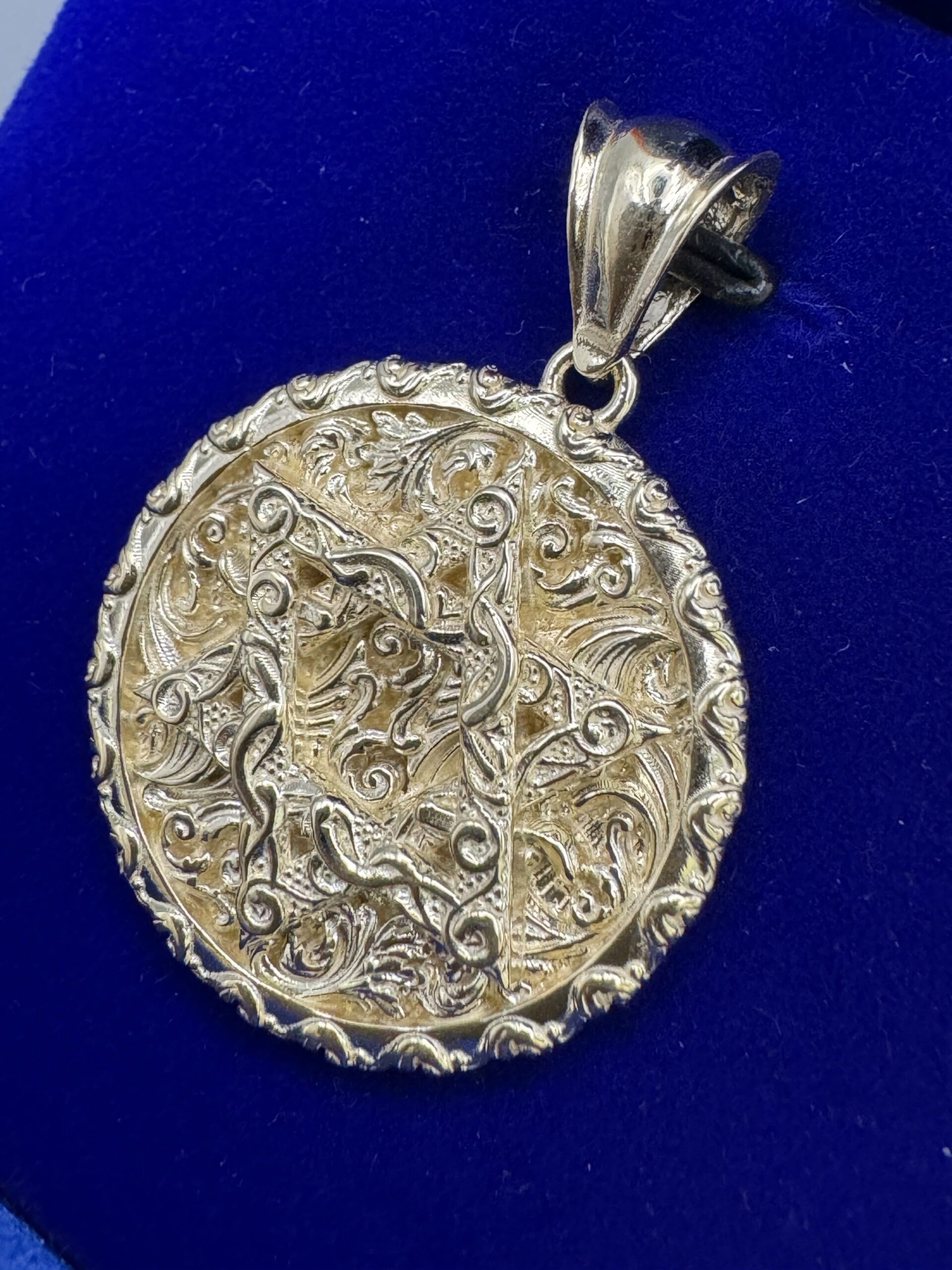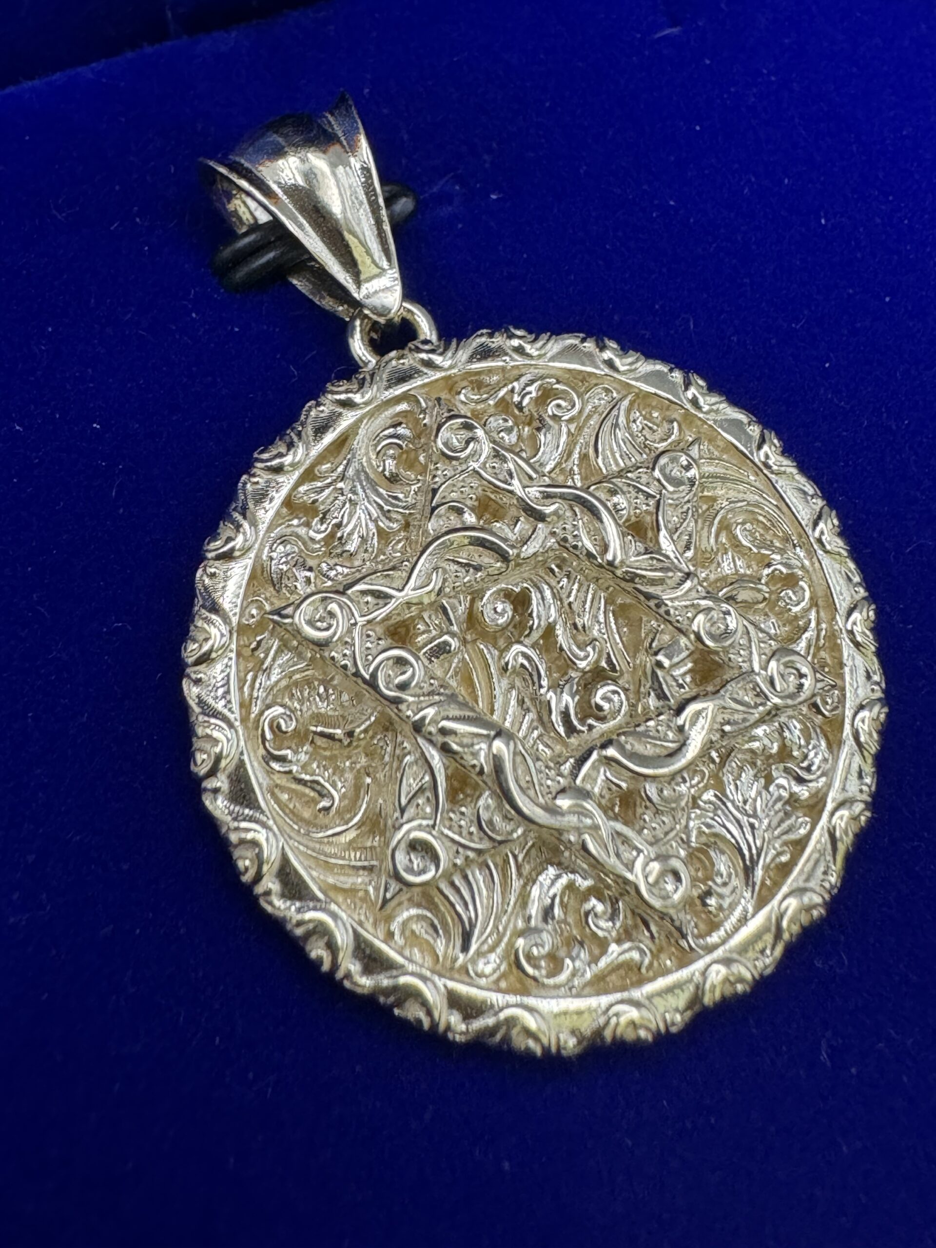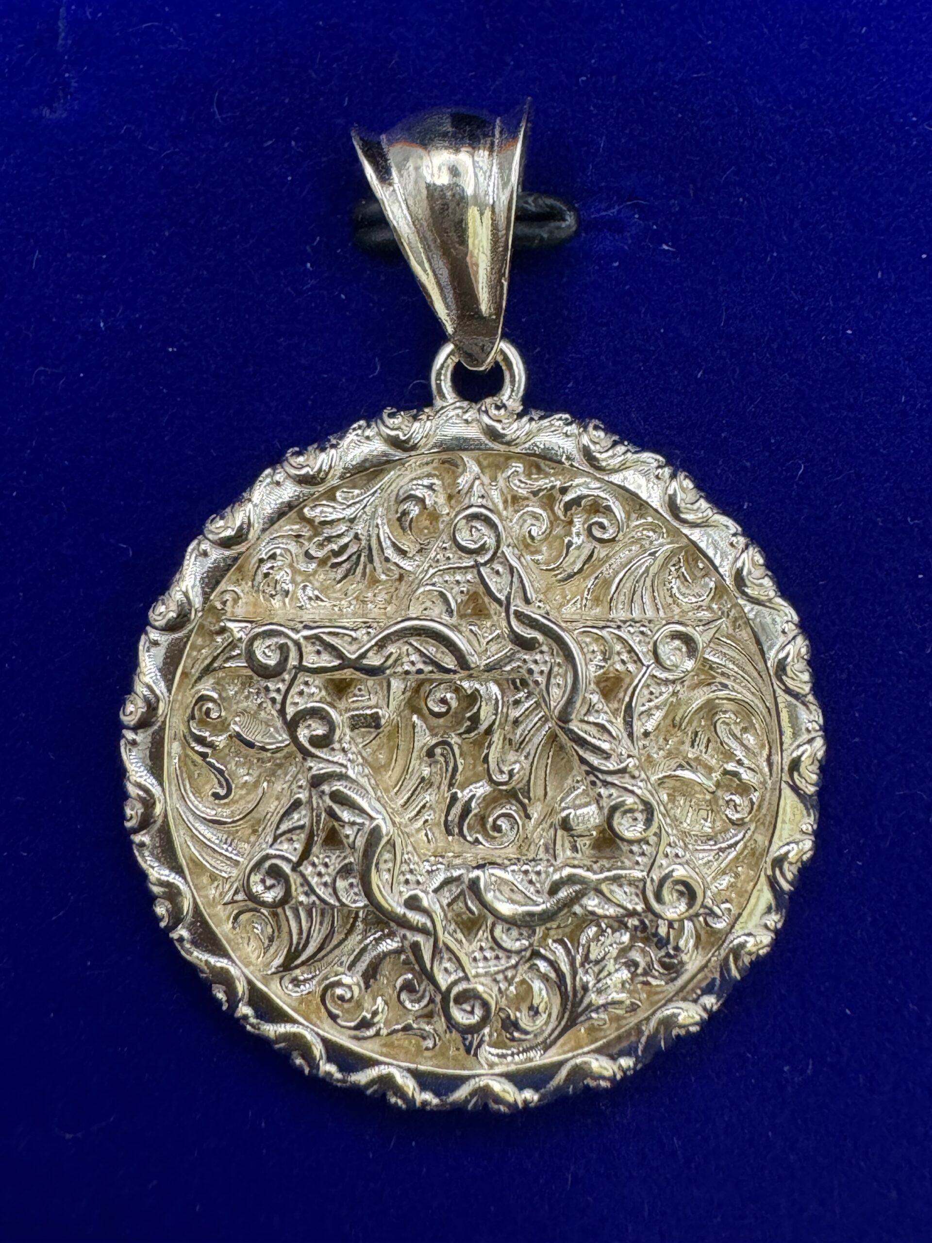 10KT Gold Star Of David Medallion Pendant With Hand Carved Design 1.5″ Tall By 1.1″ Wide Approx Gold Weight 8.3 Gram