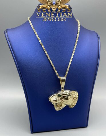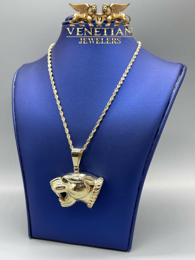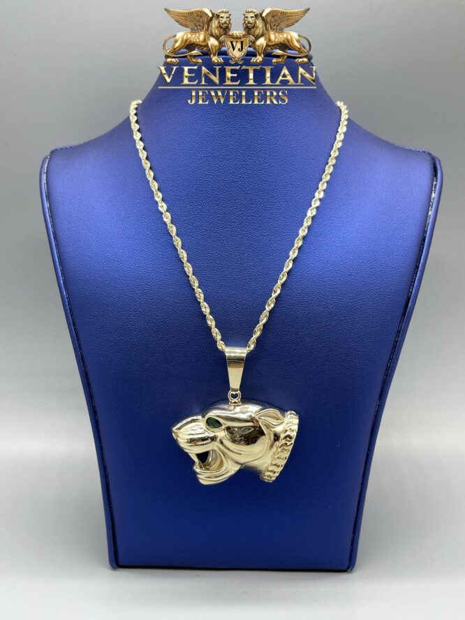 10KT Gold Big Cat Pendant With Green Sapphire Stone In Eye Diamond Cut Rope “24 Inches Rope 17.10 Gram Gold