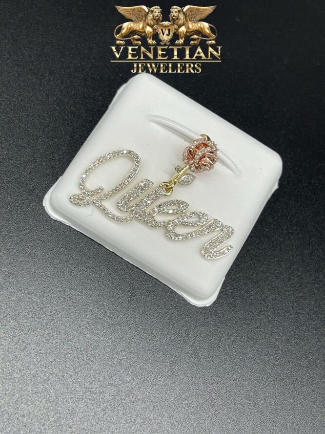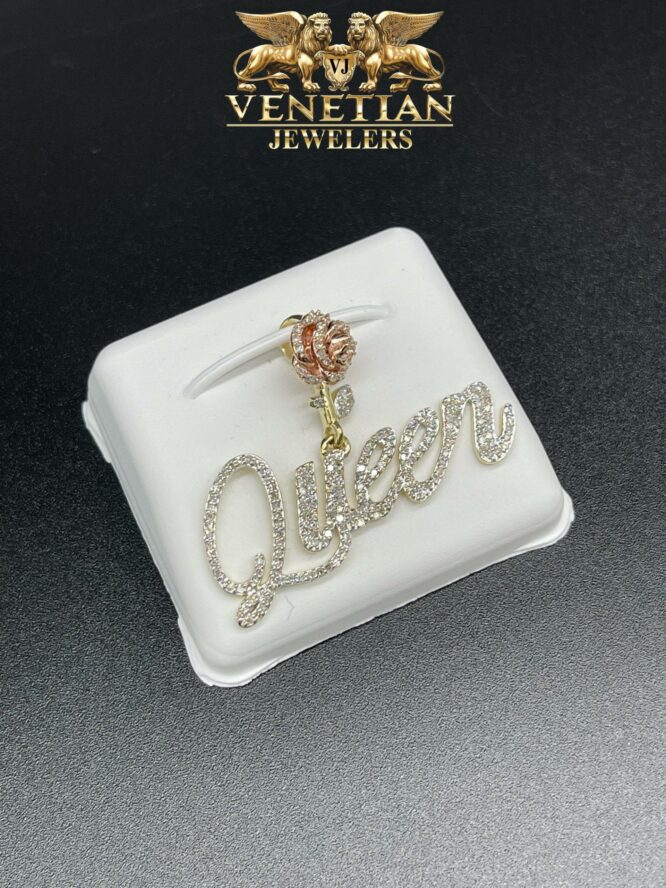 This piece is very unique, crafted in warm 10K yellow gold, this features a Iced Queen pendant with Rose Bale. Gorgeous genuine diamonds more than 1/5CT are paved on the pendant and the bale that allows the diamonds to shine from every angle. The listing is for the pendant only. 20inch chain is included.