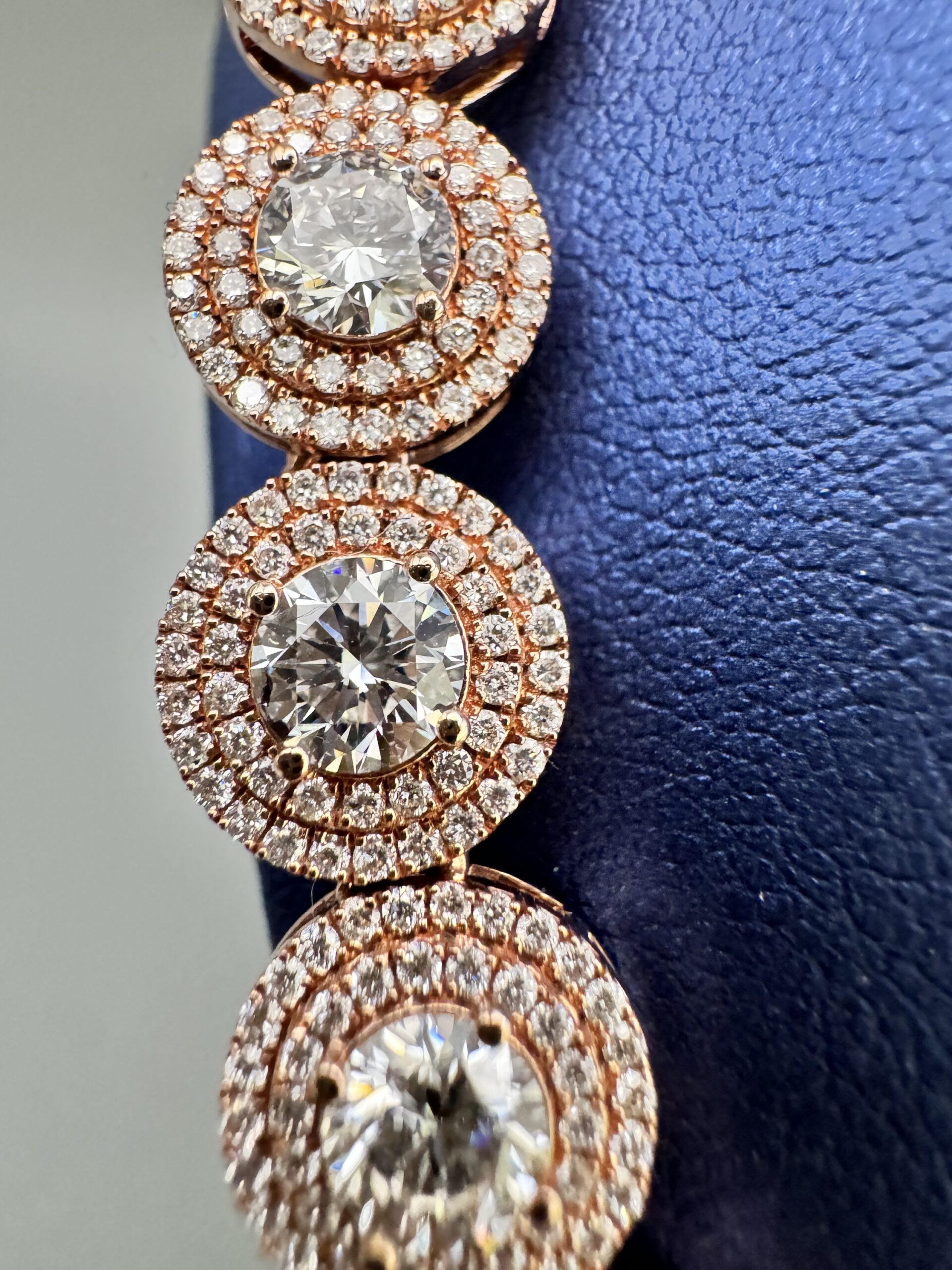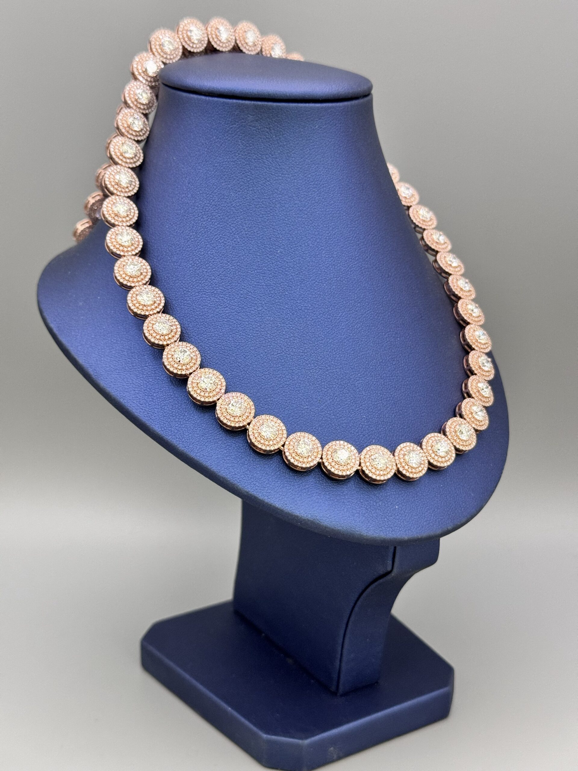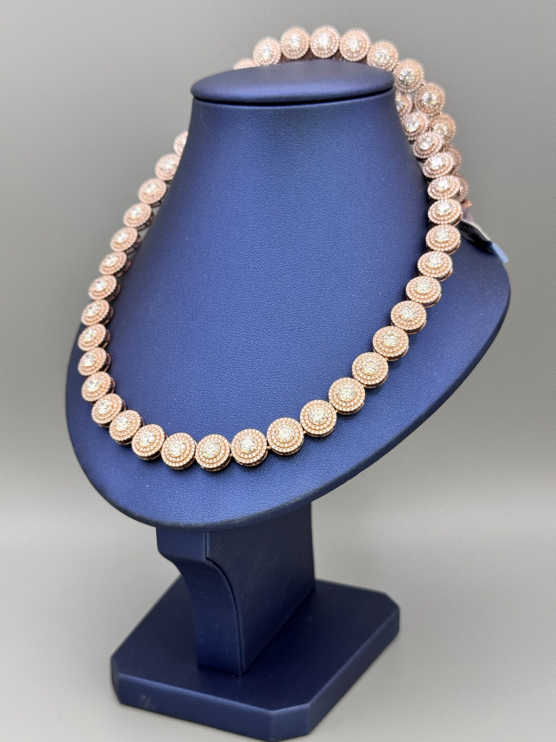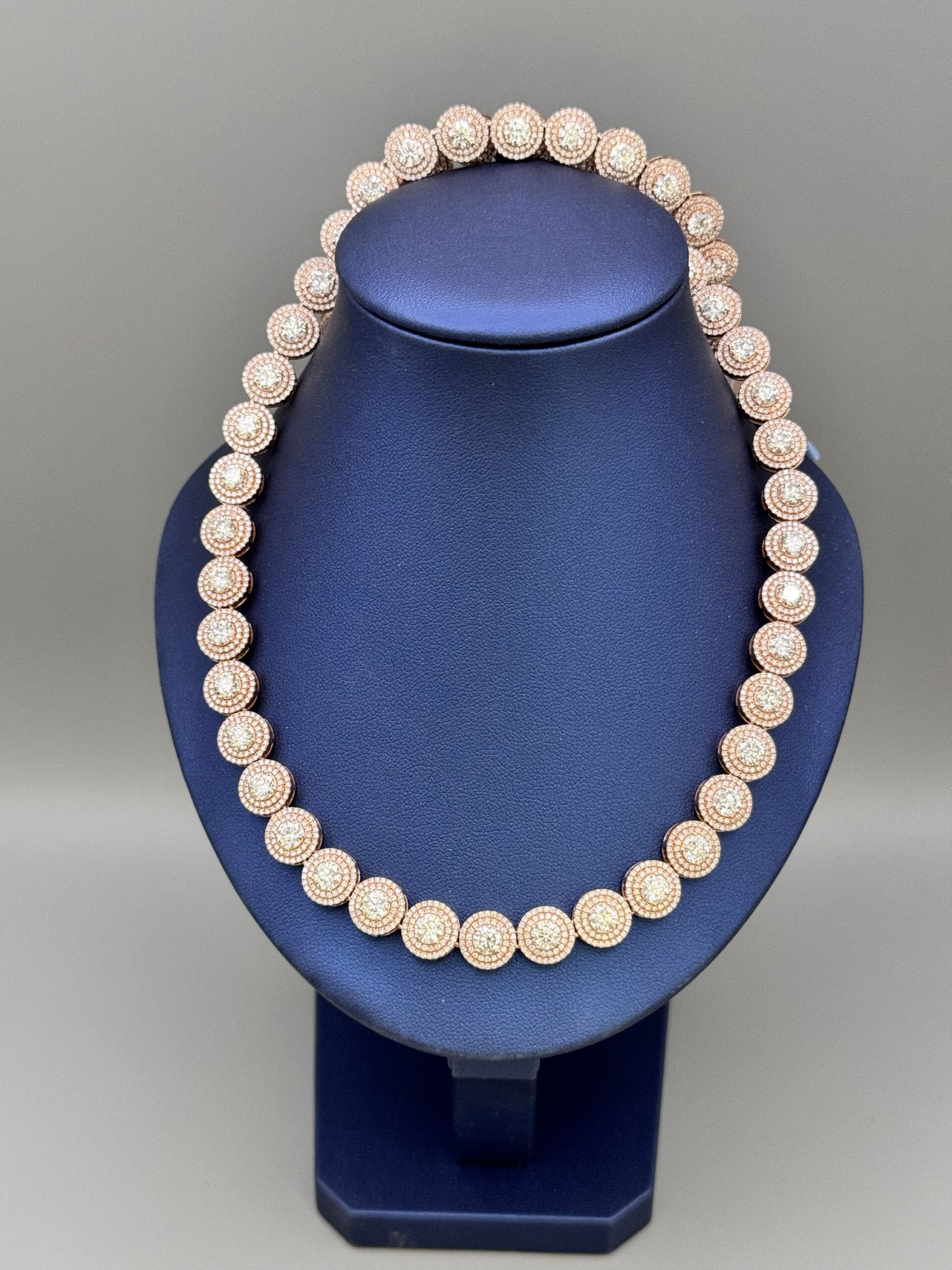 10KT R/Gold 31.24CT Diamond Tennis Necklace 22″ 10MM Width With Double Halo Bezel Set VVs F Color Approx Gold Weight 60.1 Gram