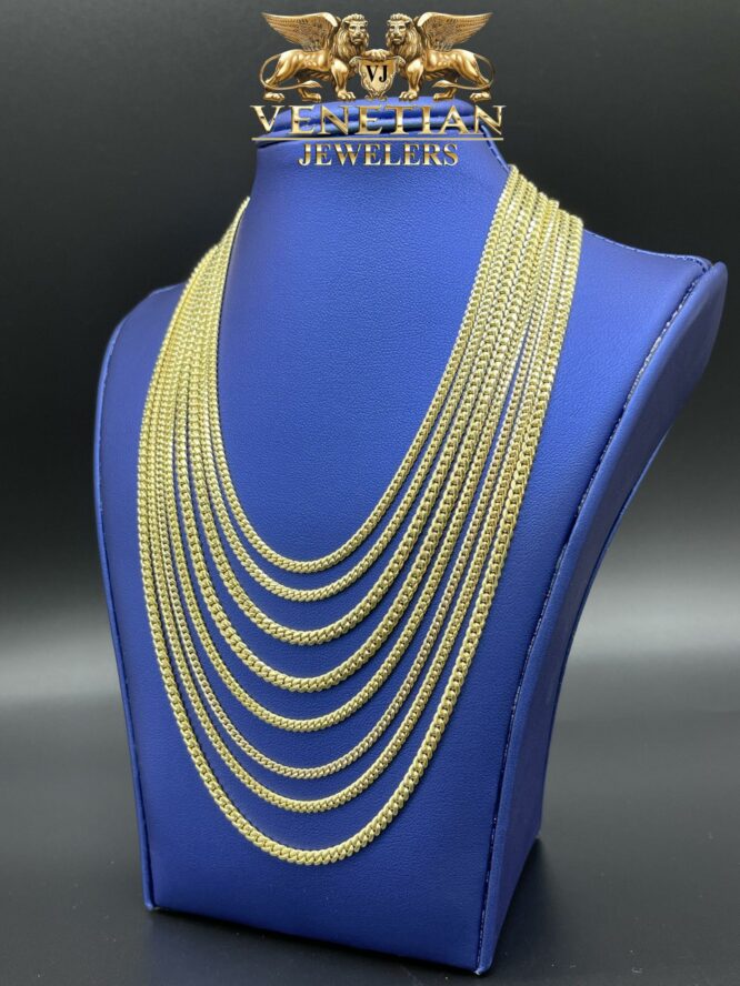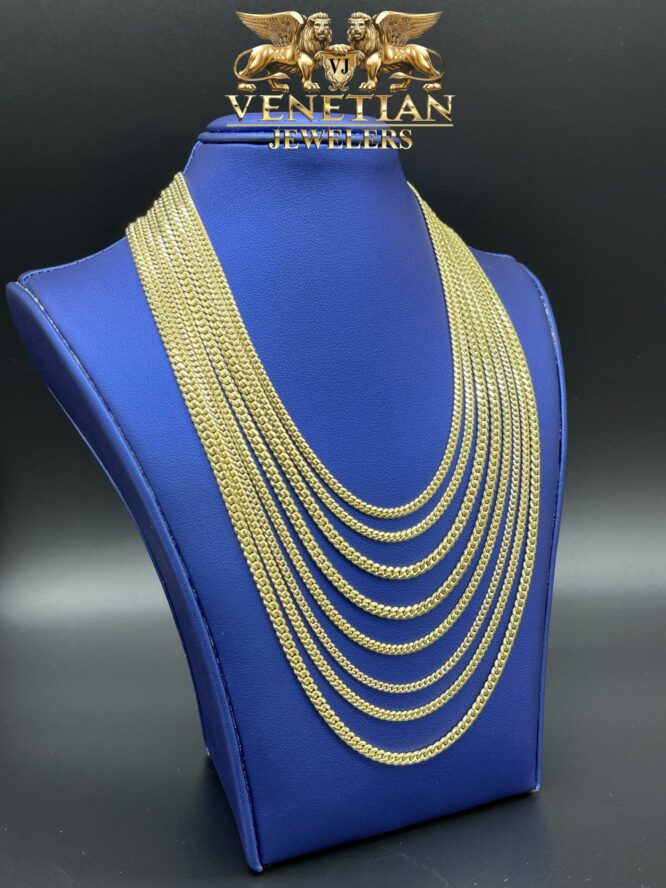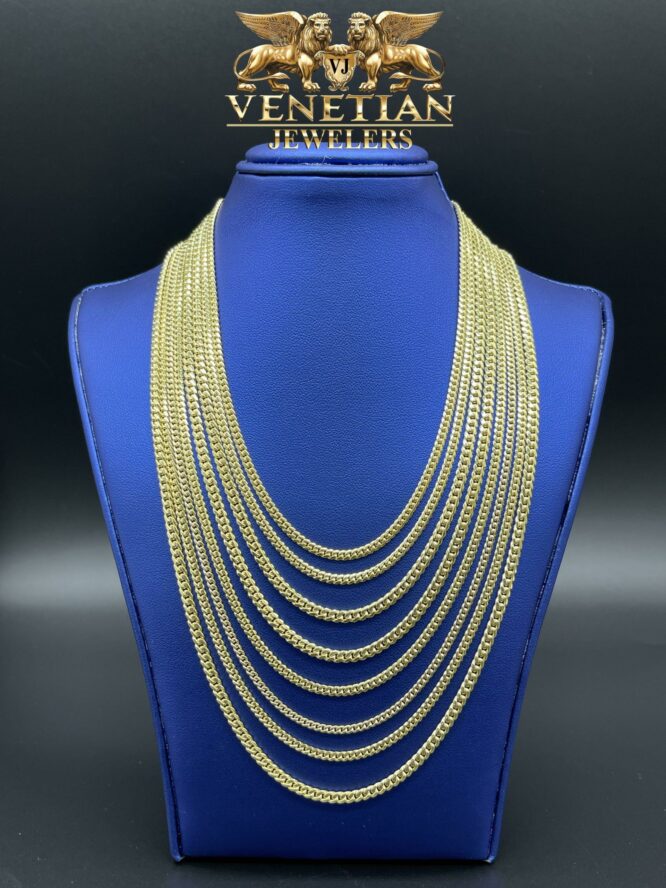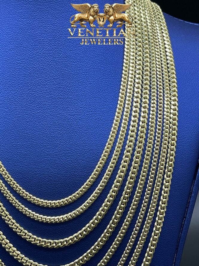 Treat yourself to one of the most good looking chains within our collection. A straightforward looking necklace features solid baby miami cuban links chain with bright polished finish. This 10K chain is available in different lengths. Select your preferred size of the chain from 18 inches to 24 inches options. This good looking chain secures with a box clasp with side fastening. Great alone or paired with a pendant. All our gold chains are 100% genuine gold as described. Comes in brand new condition and steam cleaned prior to shipping.