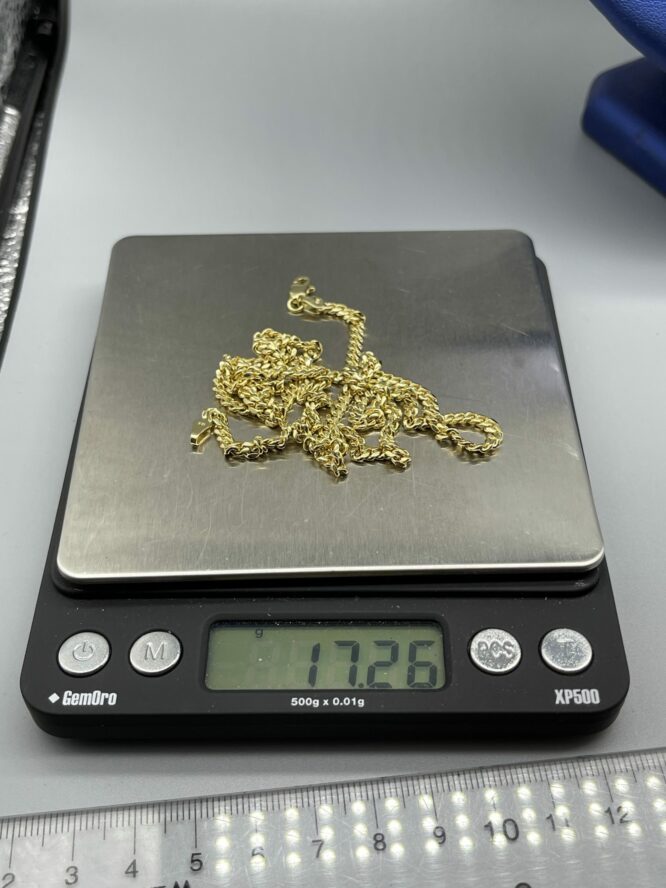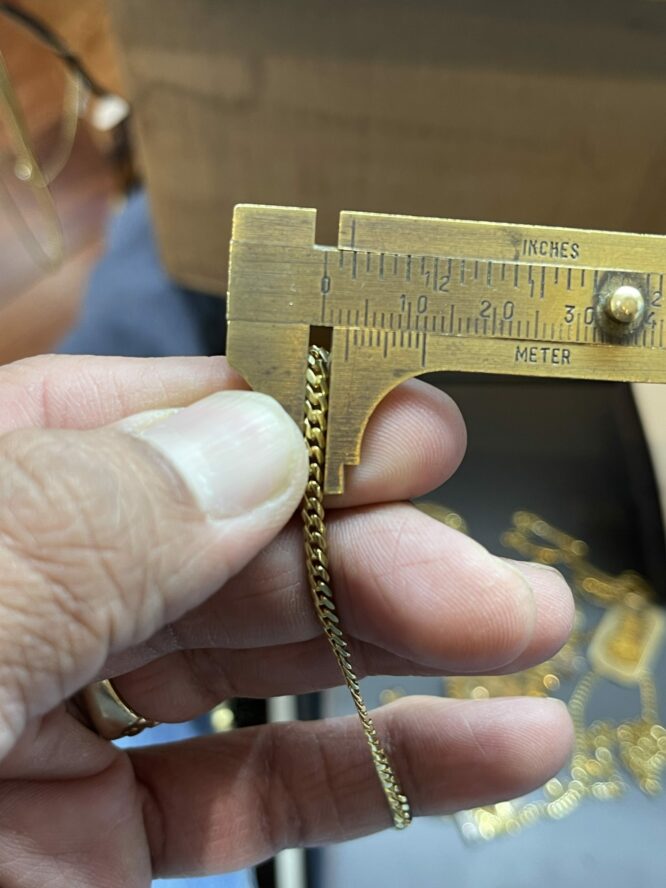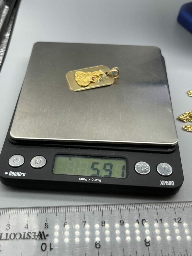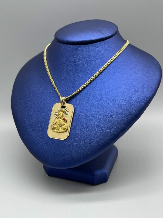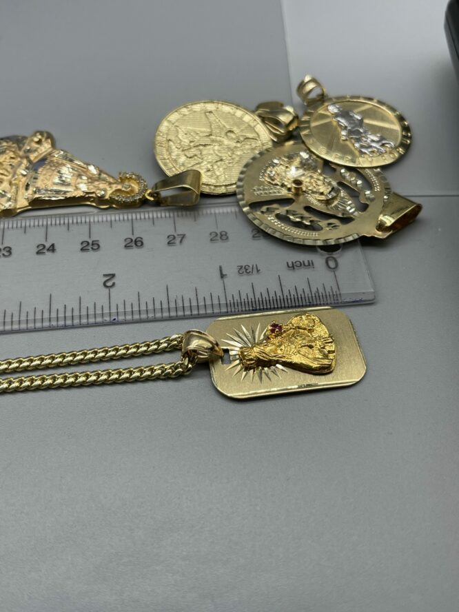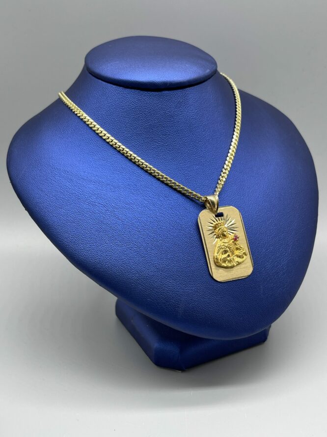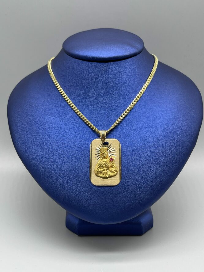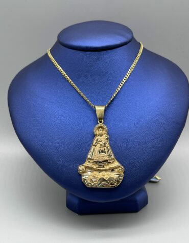 10KT Solid Baby MiamiCuban Necklace 22″ 3MM Approx Gold Weight On Necklace 17.26 Grams Comes With Santa Barbara Pendant 1.5″ Tall Approx Gold Weight On Pendant 5.91 Grams