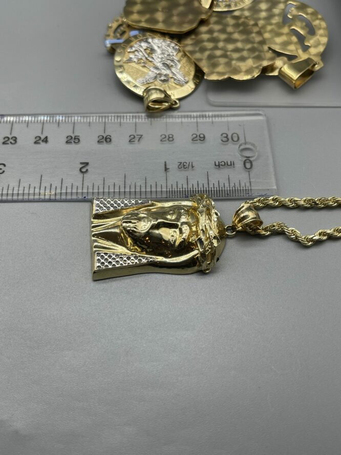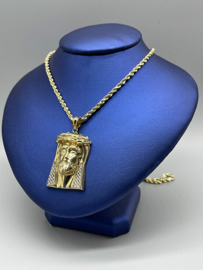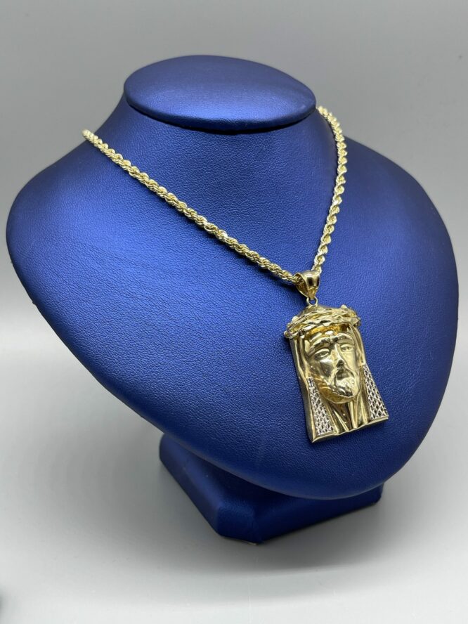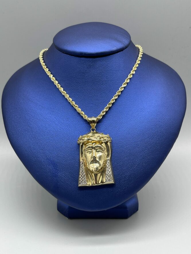 10KT Solid Gold Jesus Combo Set Comes WitH 24″ Rope Chain Live Product Available Instore And Online All Specs Visible In Photos 11.23 Grams Approx Weight Pendant 17.34 Grams Approx Gold 24″ Chain 3.5MM