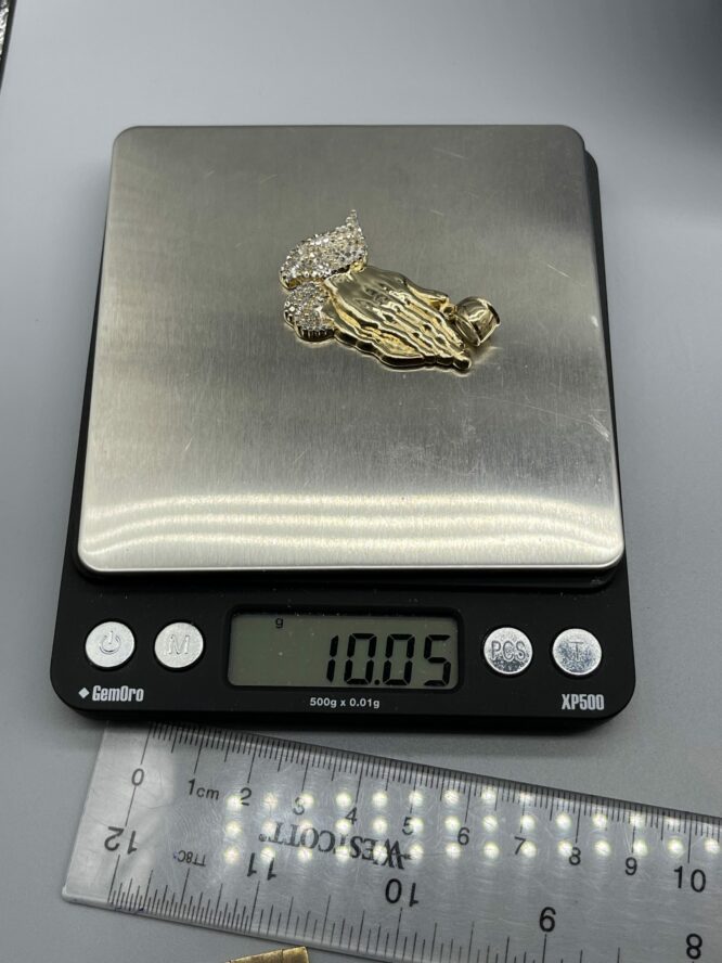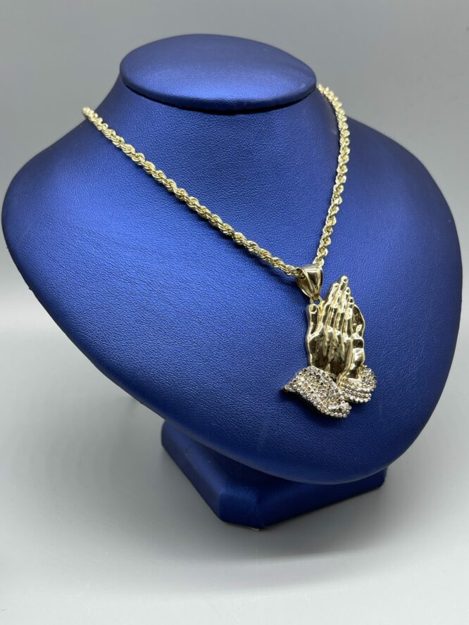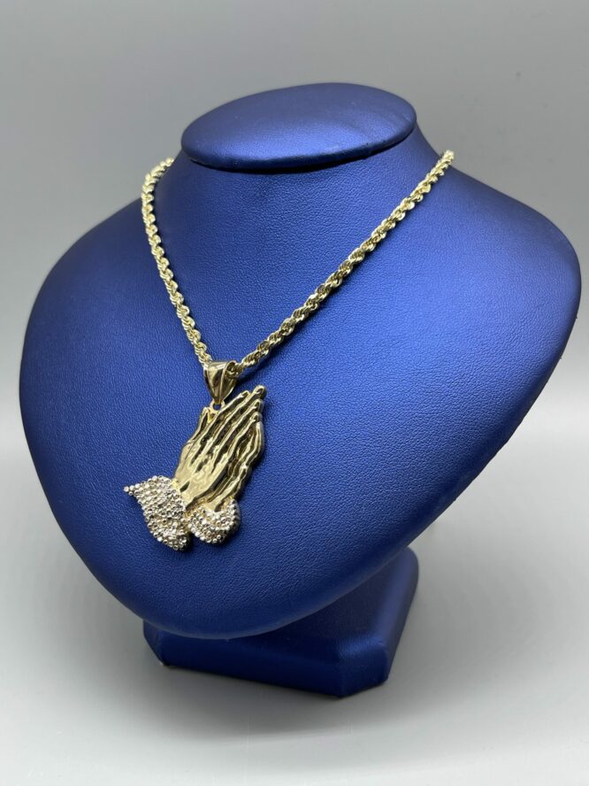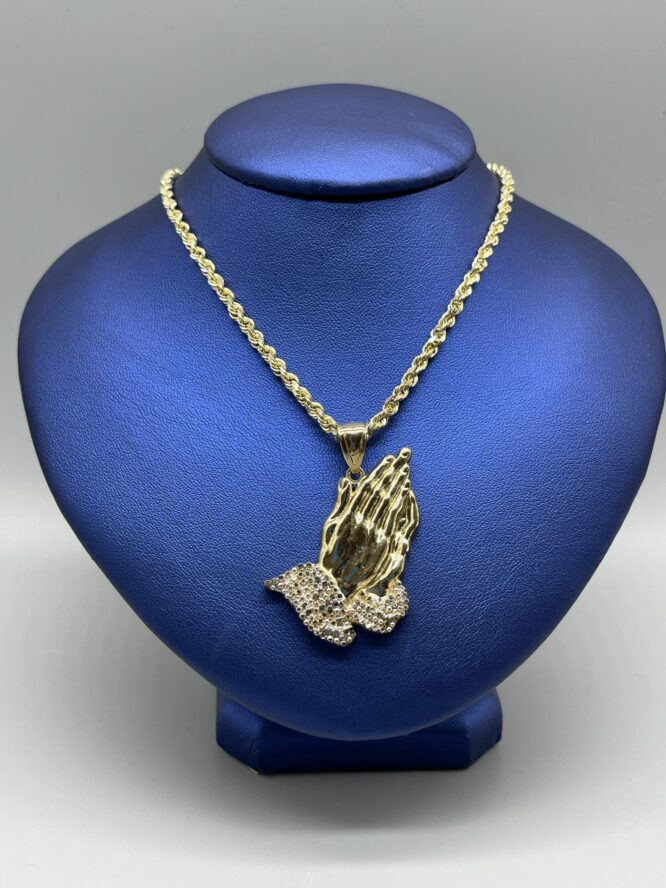 10KT Solid Gold Praying Hand Combo Set Comes With 3.5MM Rope 24″ Approx Gold Weight Pendant 10.05 Gram Chain Approx Weight 17.55 Grams