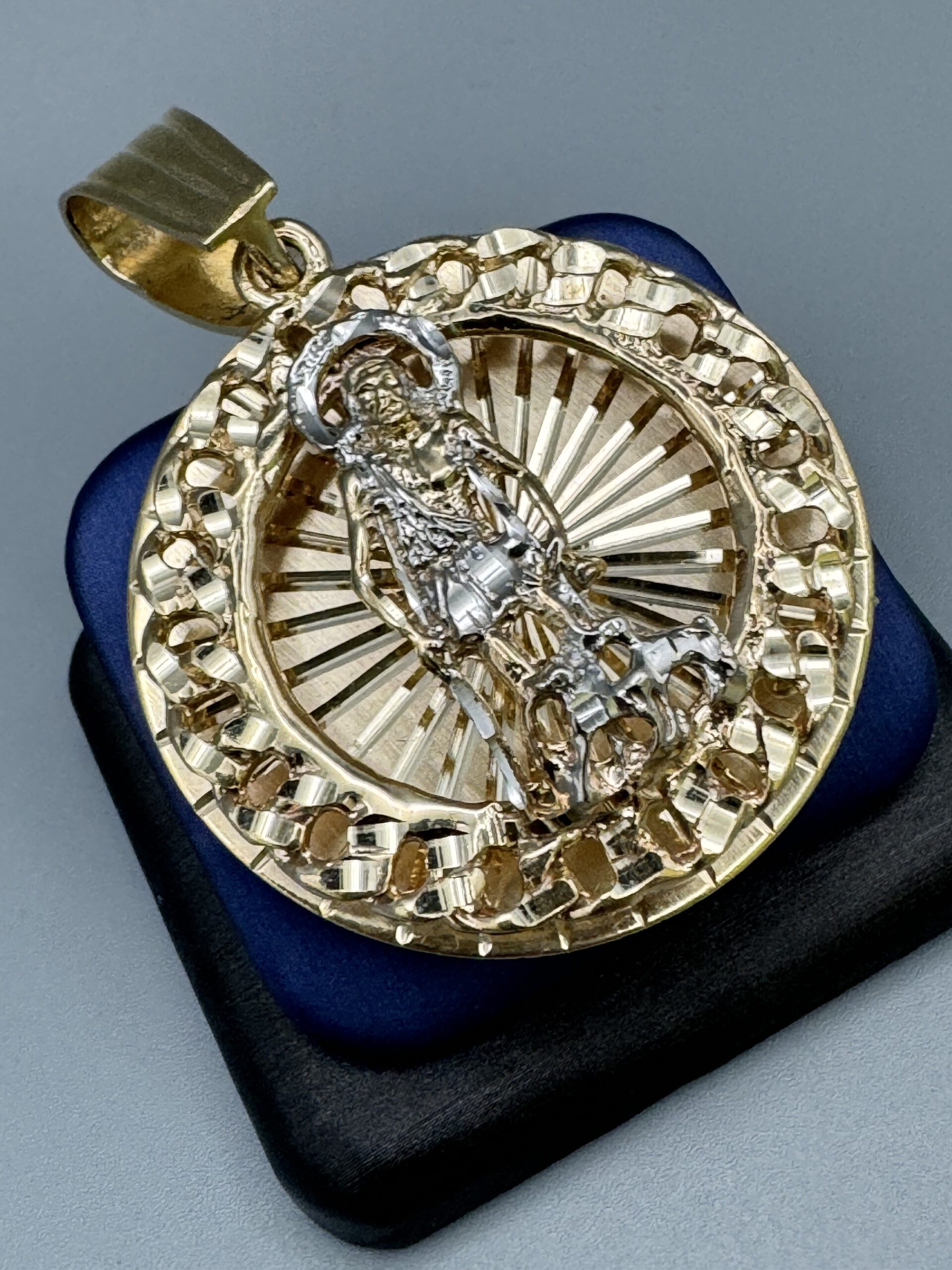 Elevate your style with this stunning 10KT Solid Gold St. Lazaro Pendant. At 1.5″ tall and 1.8″ wide, it weighs approximately 26.06 grams and features a captivating 3D solid back. Perfect for any occasion!