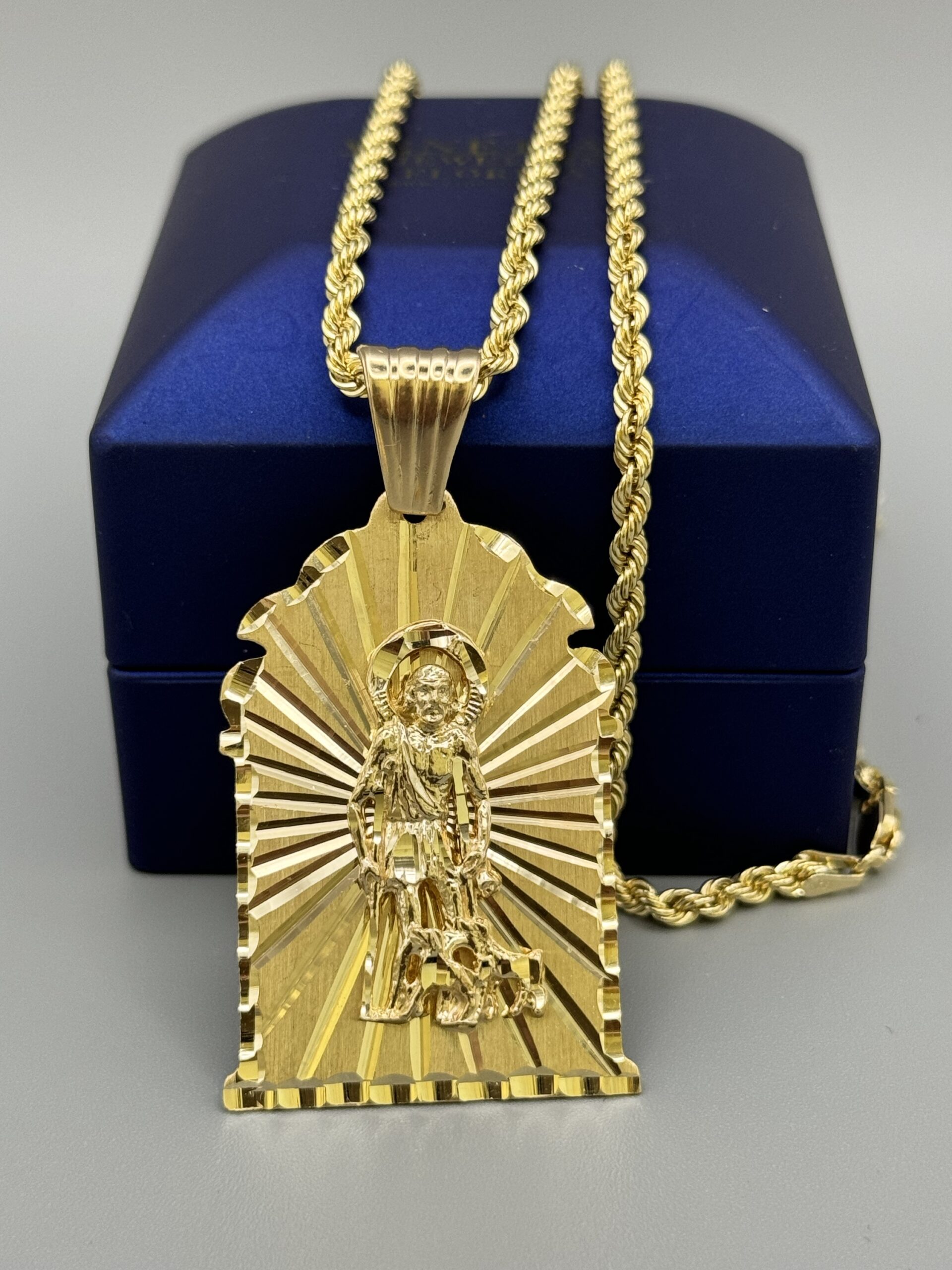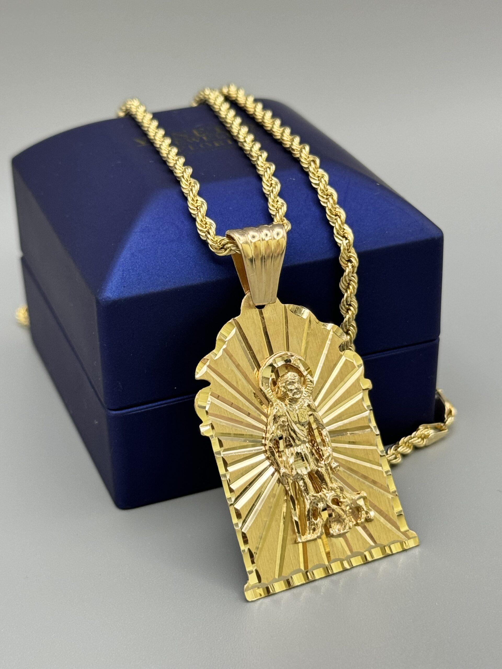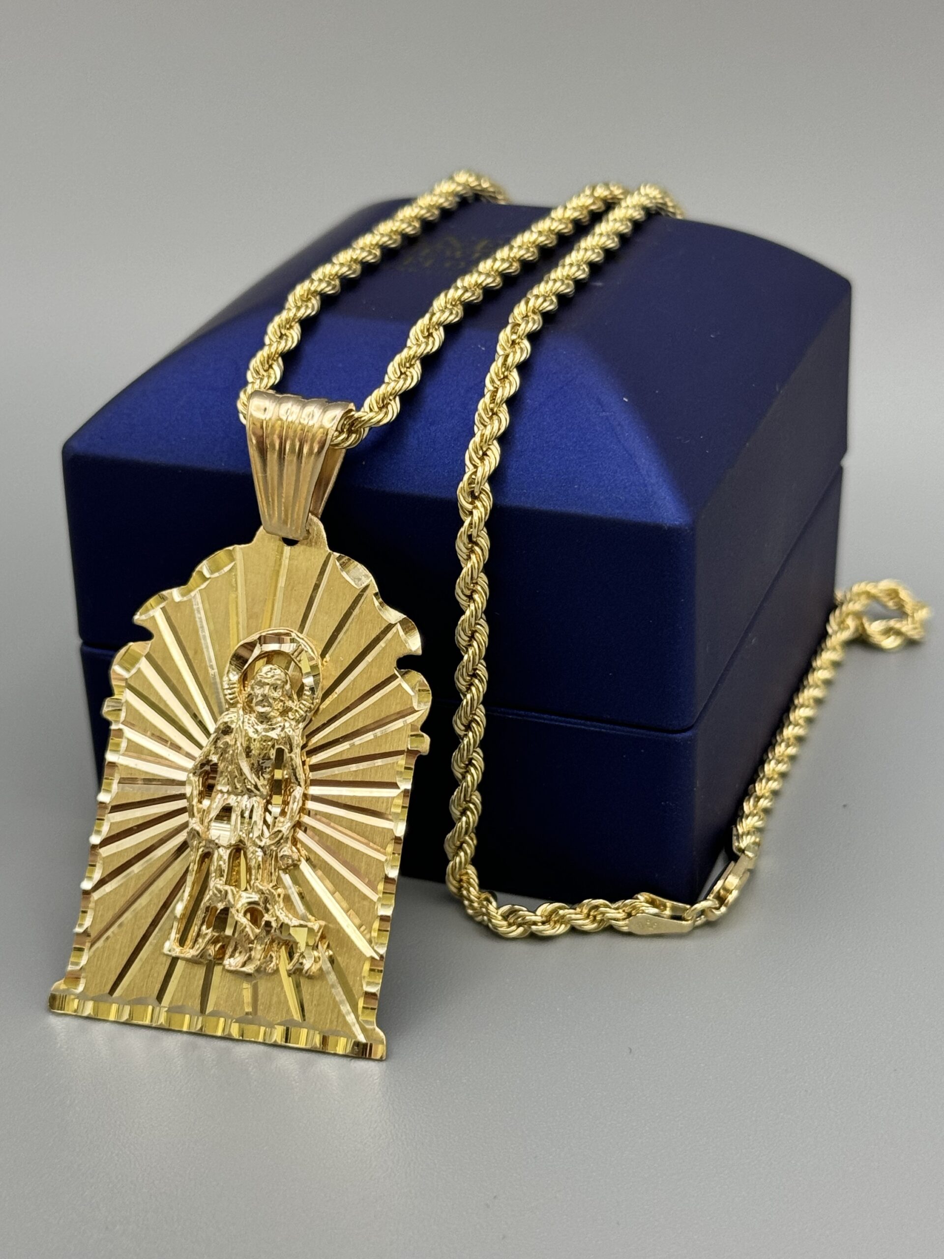 Elevate your style with this stunning 10KT Solid Gold St. Lazaro Pendant Combo Set. Featuring a 3MM rope necklace and a beautifully crafted pendant, it’s perfect for any occasion. Gold weight: 15.2 grams.