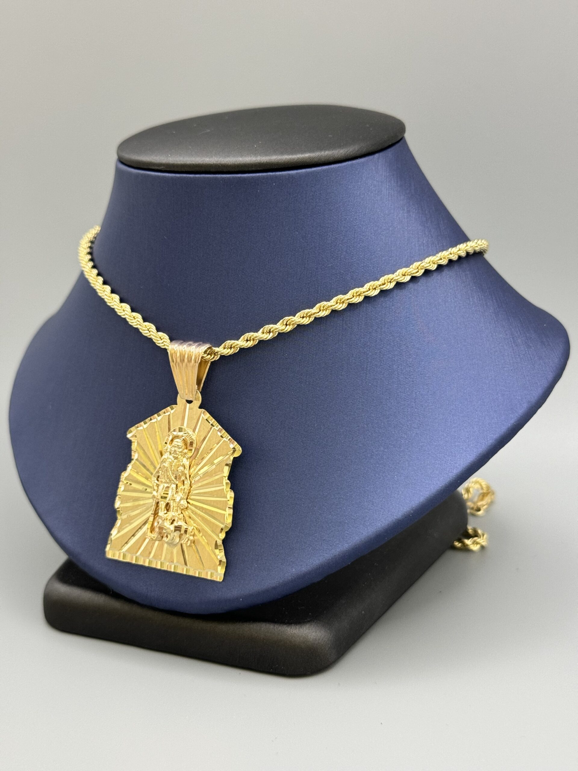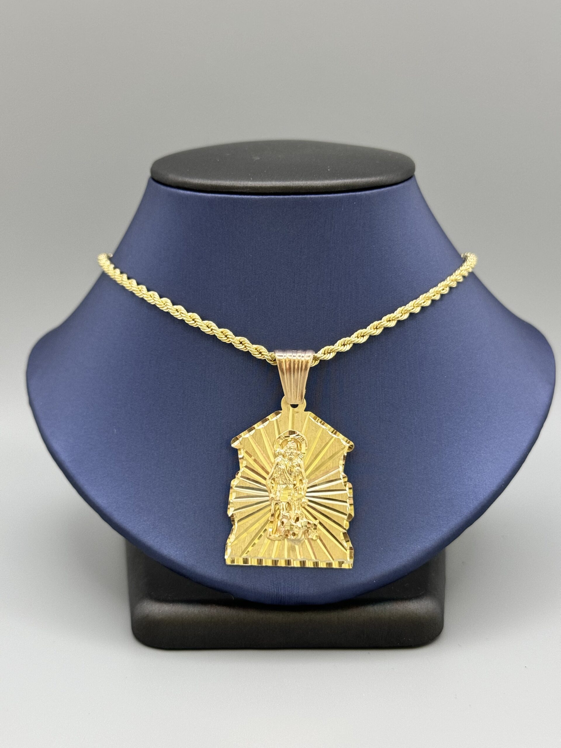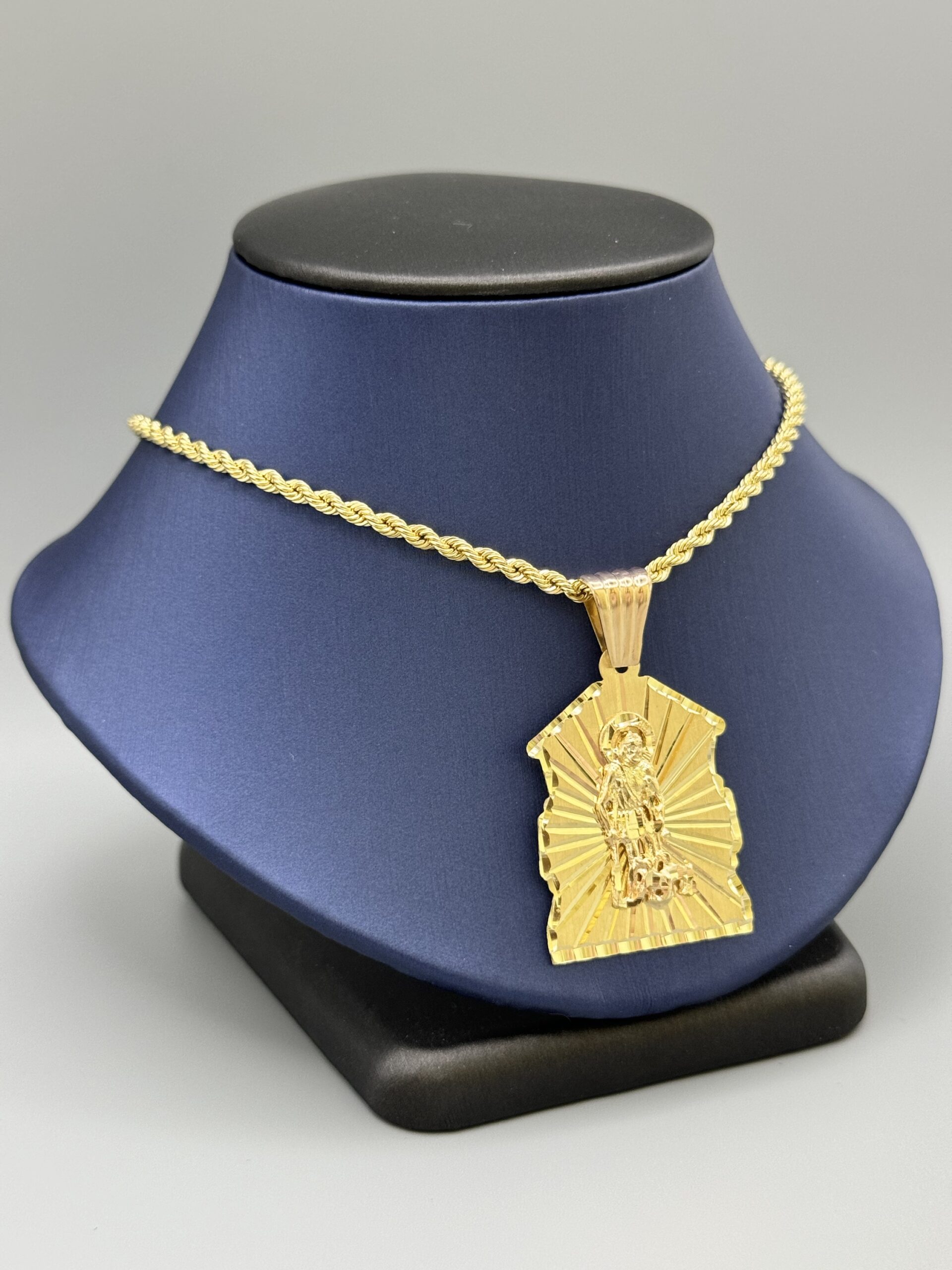 Elevate your style with this 10KT Solid Gold St. Lazaro Pendant Combo Set. It features a 22″ rope necklace and a stunning pendant, perfect for any occasion. Experience elegance in gold.