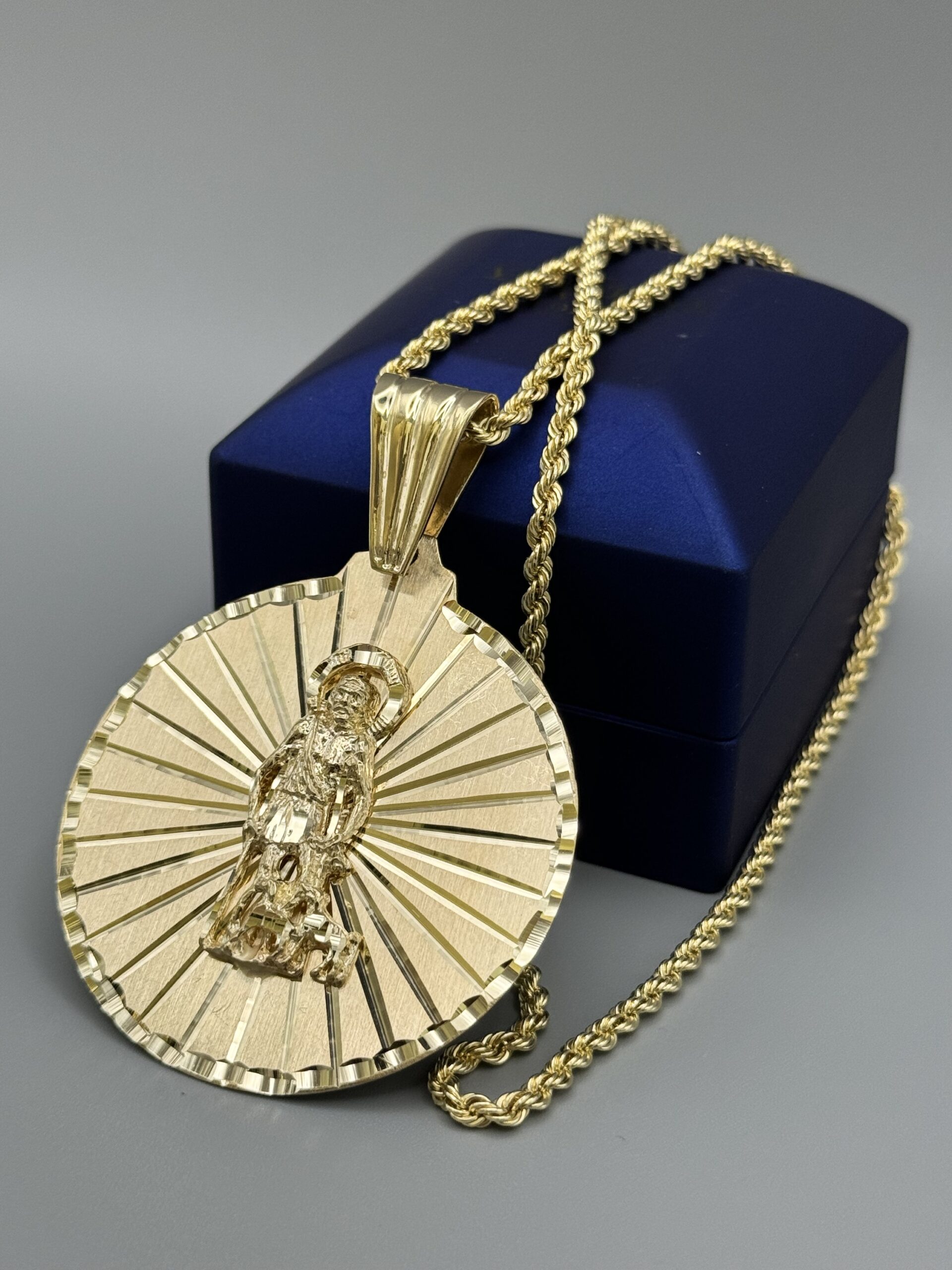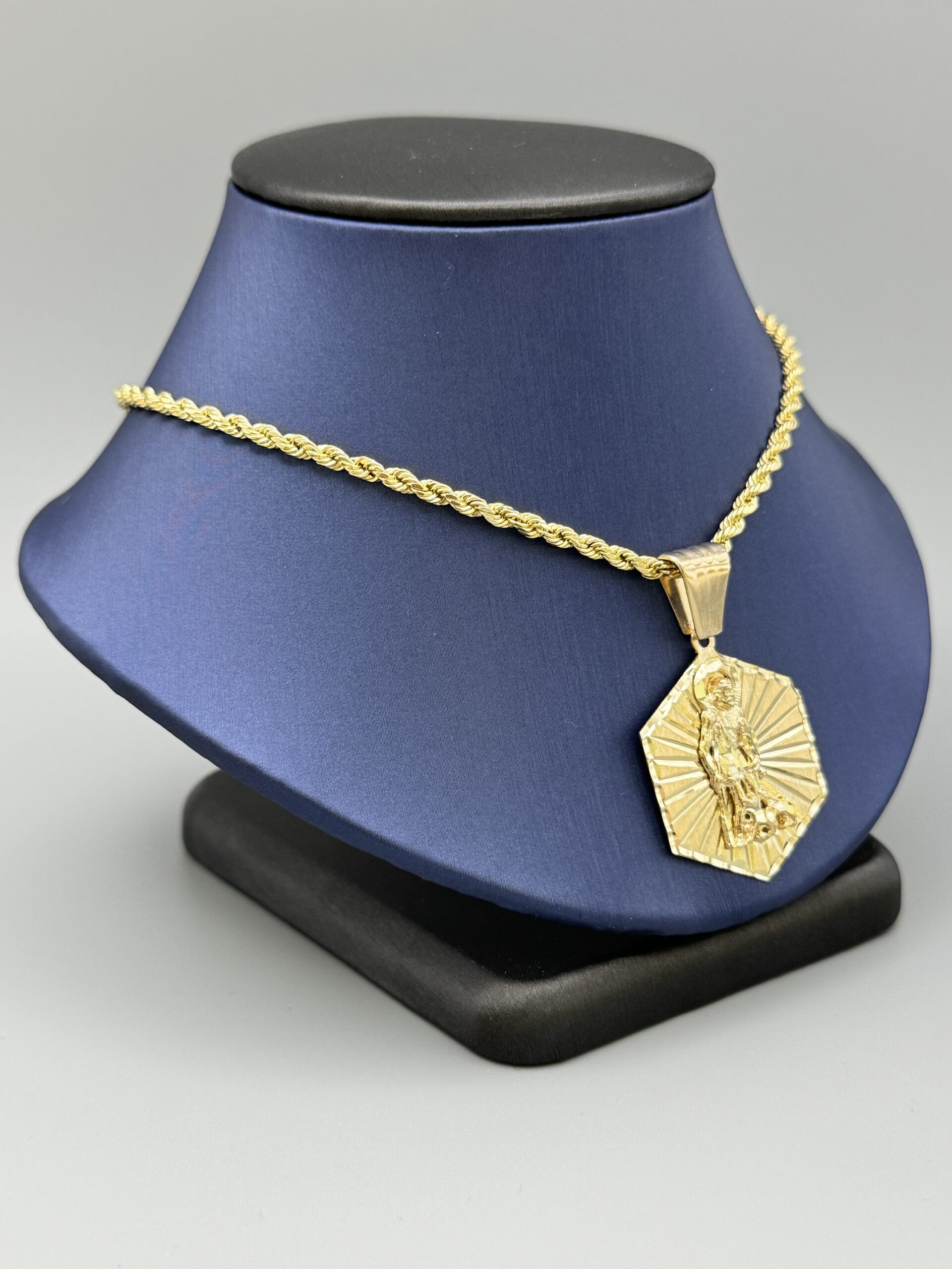 10KT Solid Gold St.Lazaro Pendant ComboSet Comes With 10KT Gold 3MM Rope Necklace 20″ Approx Gold Weight Of Necklace 5.2 Gram Pendant 5.8 Gram 1.75”” Tall Includes Bell By 1” Wide