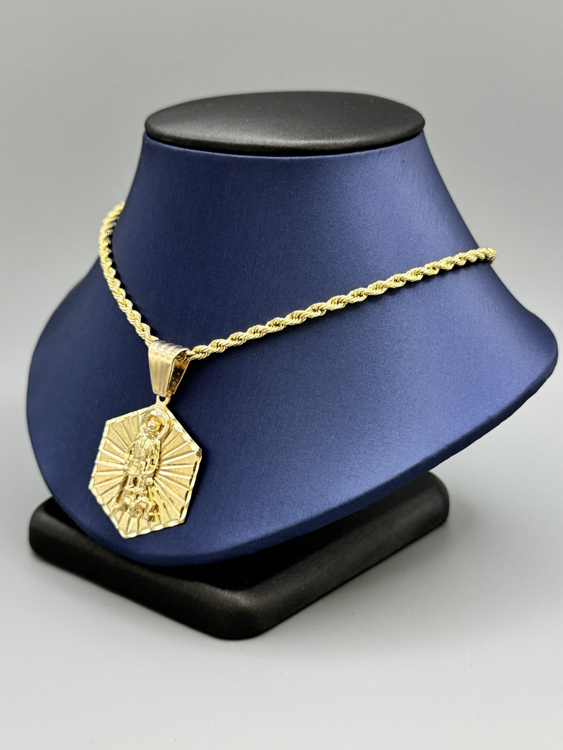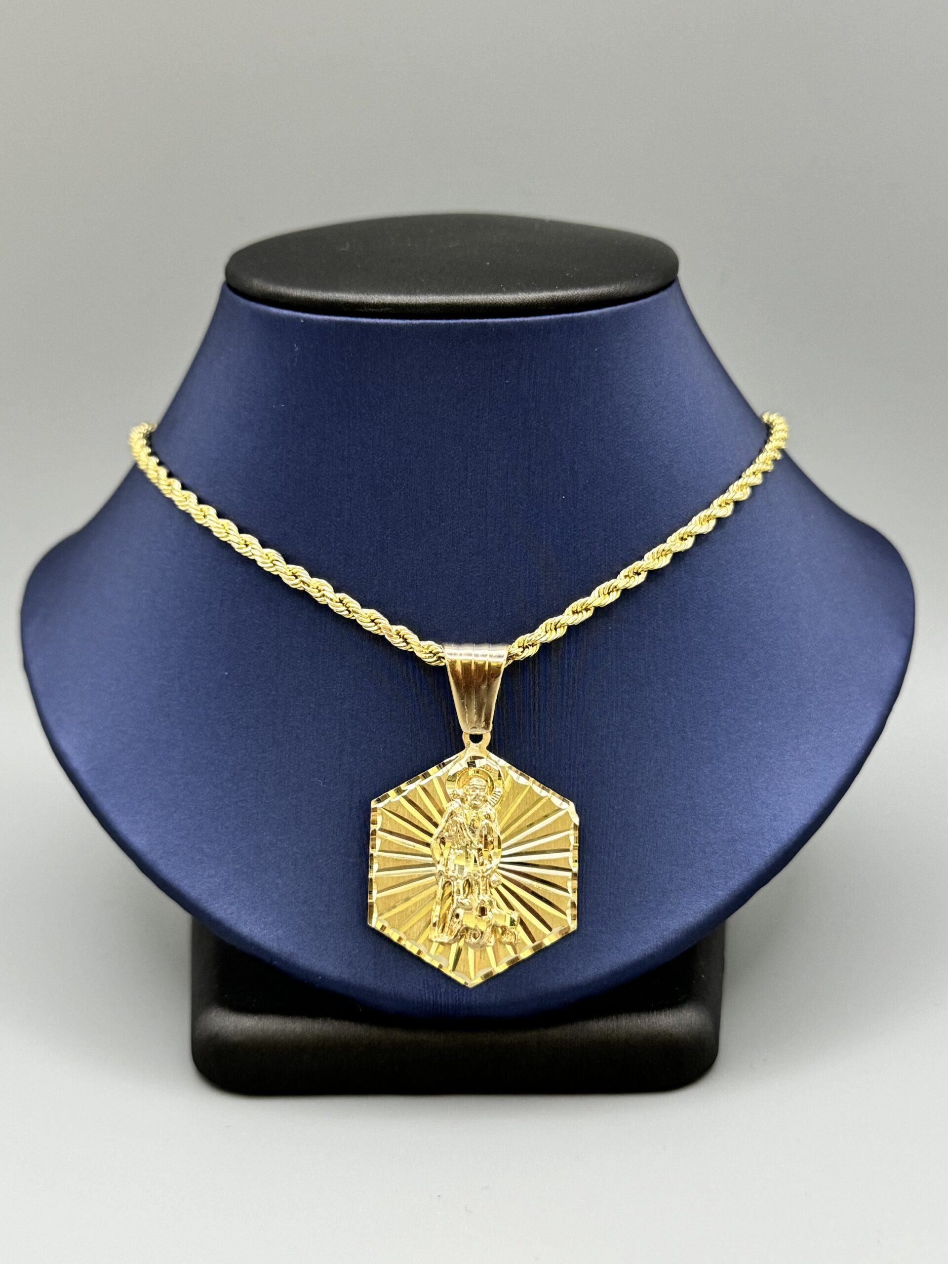 Elevate your style with this stunning 10KT Solid Gold St. Lazaro Pendant Combo Set. Featuring a 20″ rope necklace and an eye-catching pendant, it’s perfect for any occasion. Gold weight: 11 grams total.