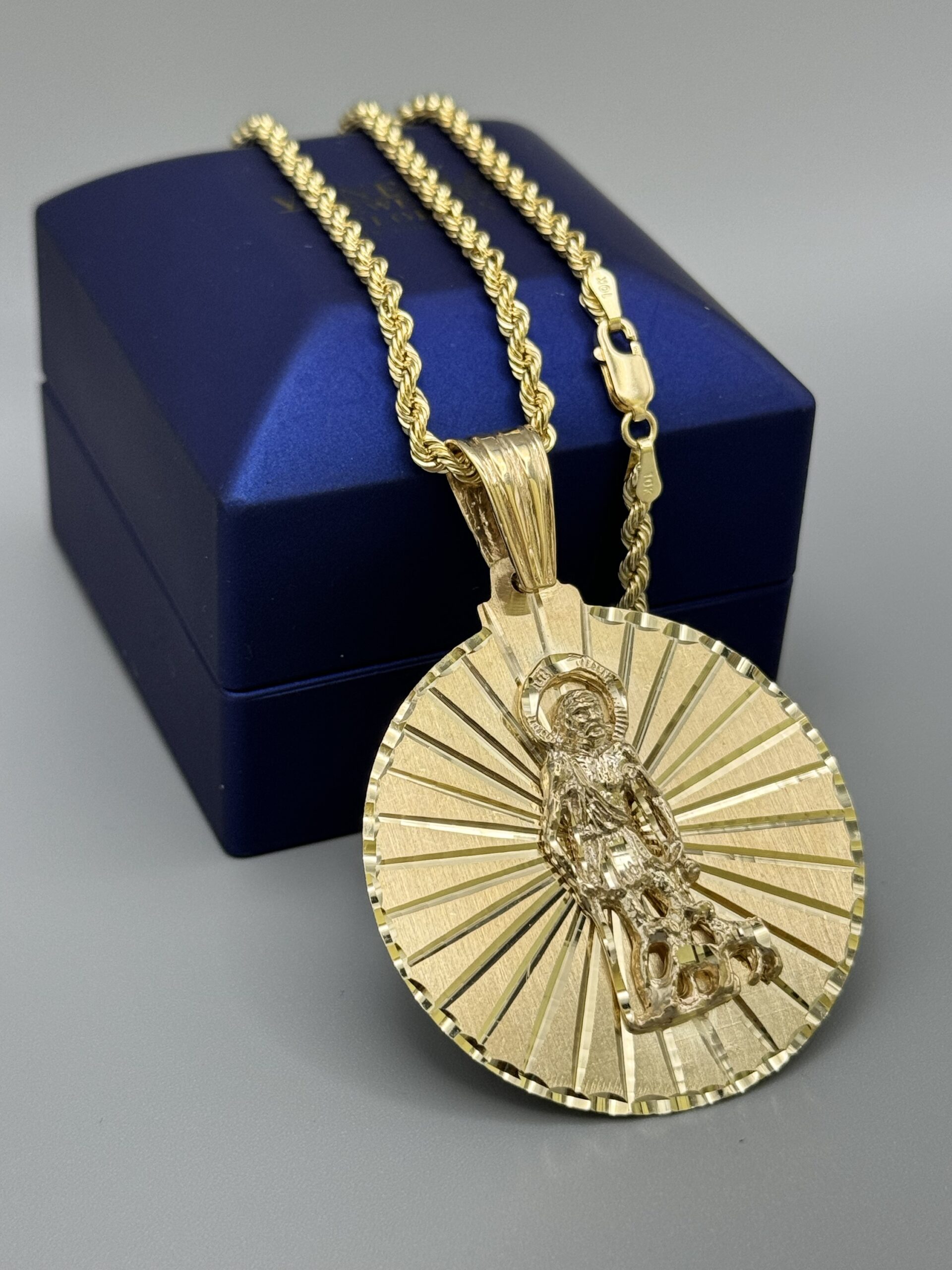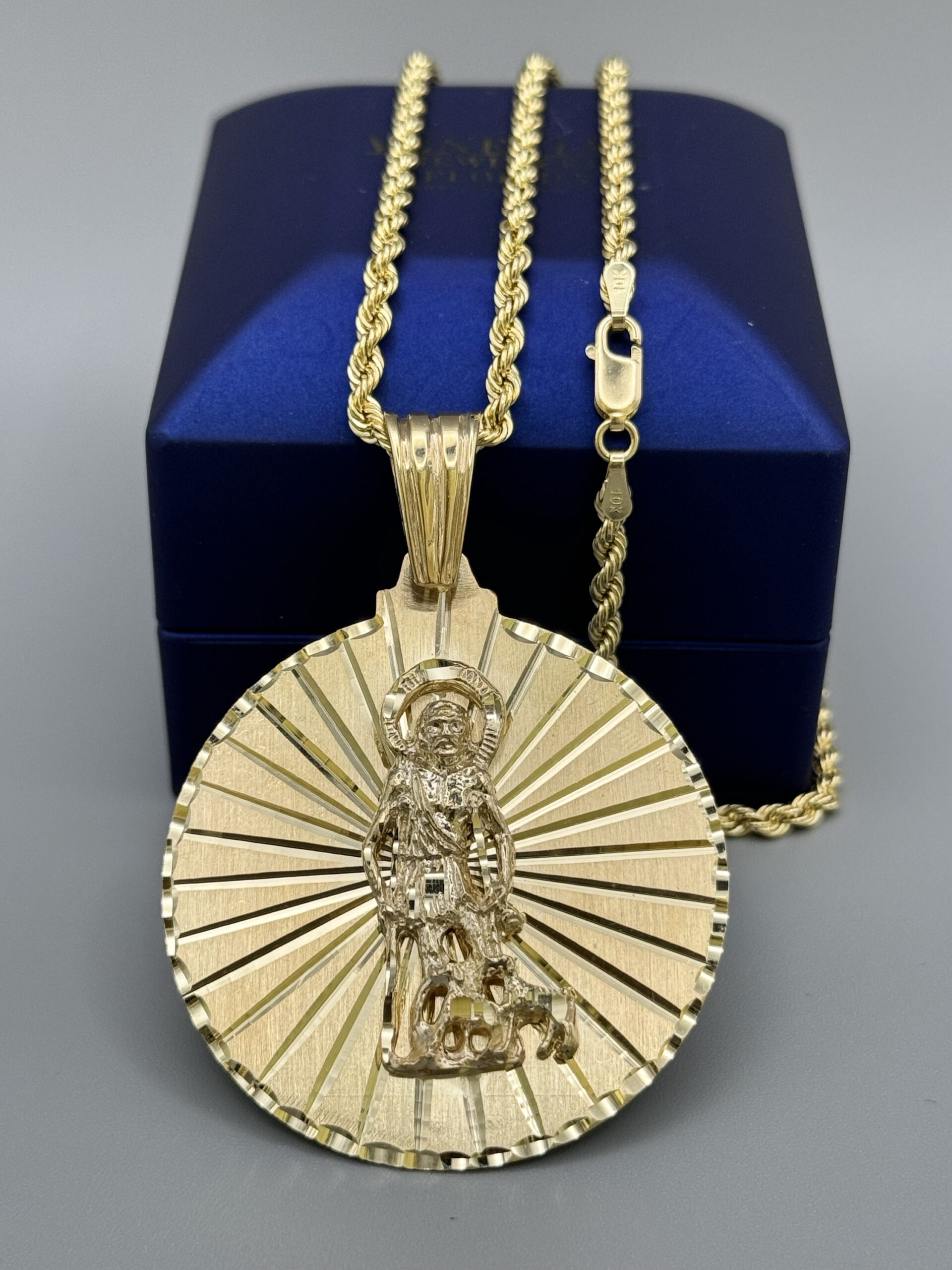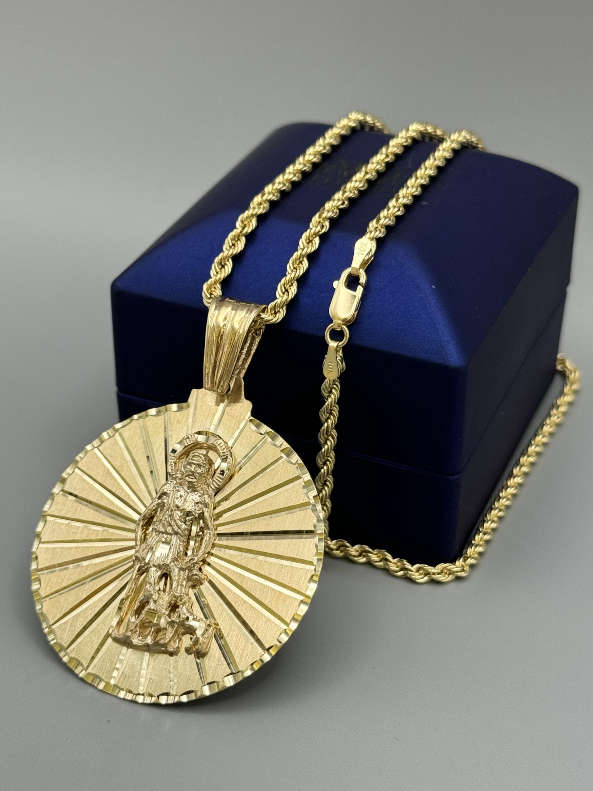 10KT Solid Gold St.Lazaro Pendant ComboSet Comes With 10KT Gold 3MM Rope Necklace 22″ Approx Gold Weight Of Necklace 5.6 Gram Pendant 15.7 Gram 2.5″ Tall Includes Bell By 1.75″ All Around