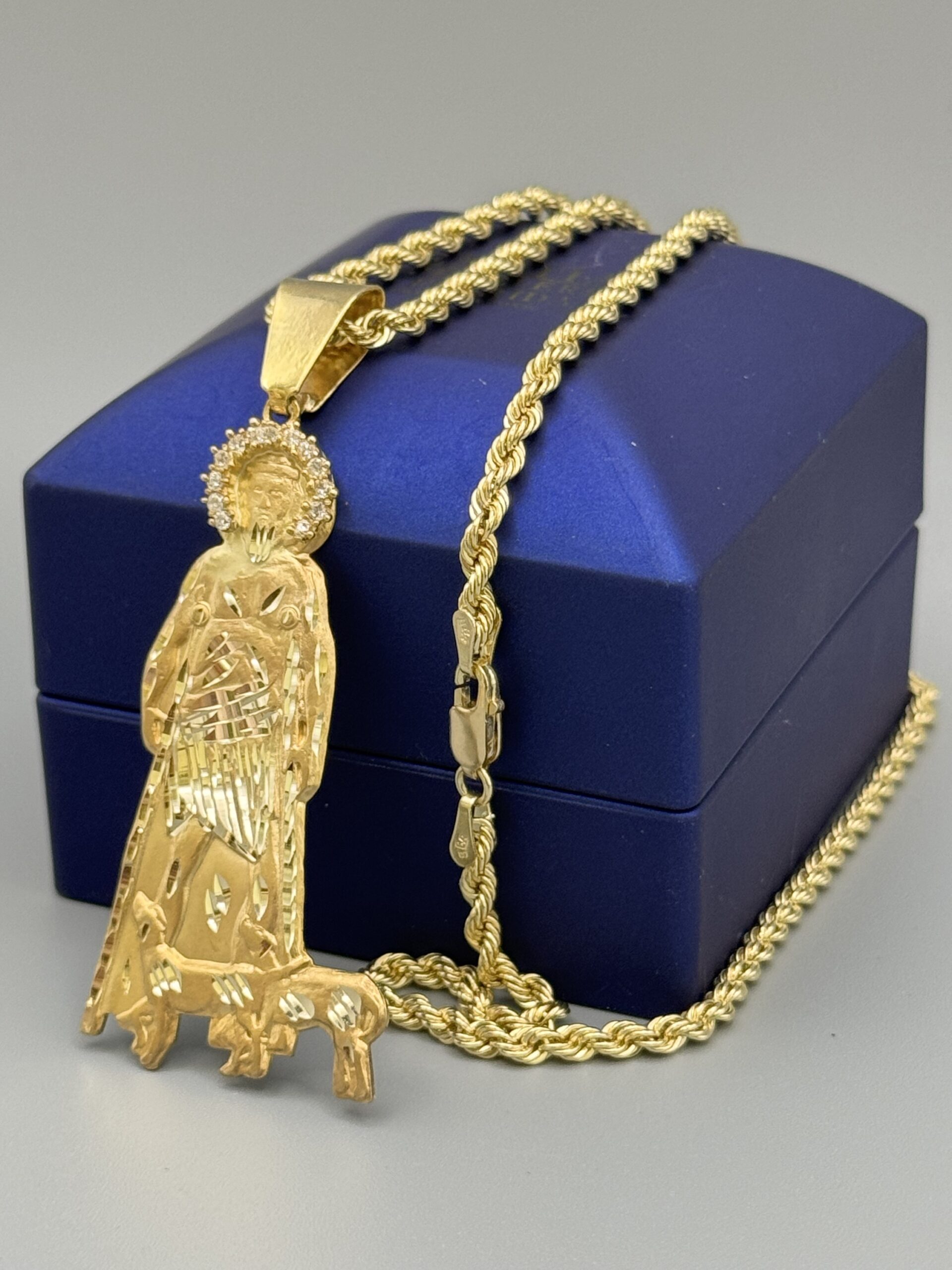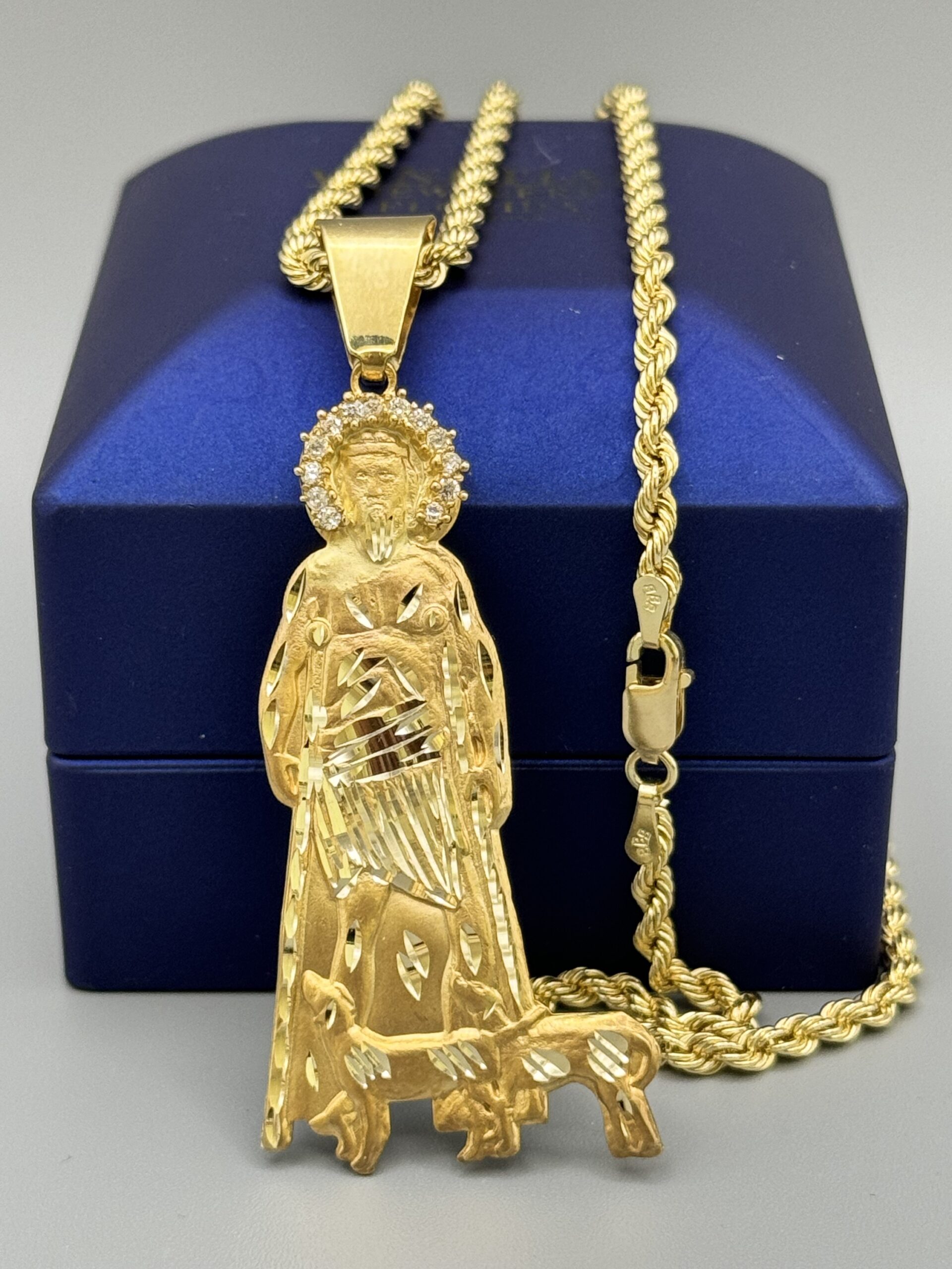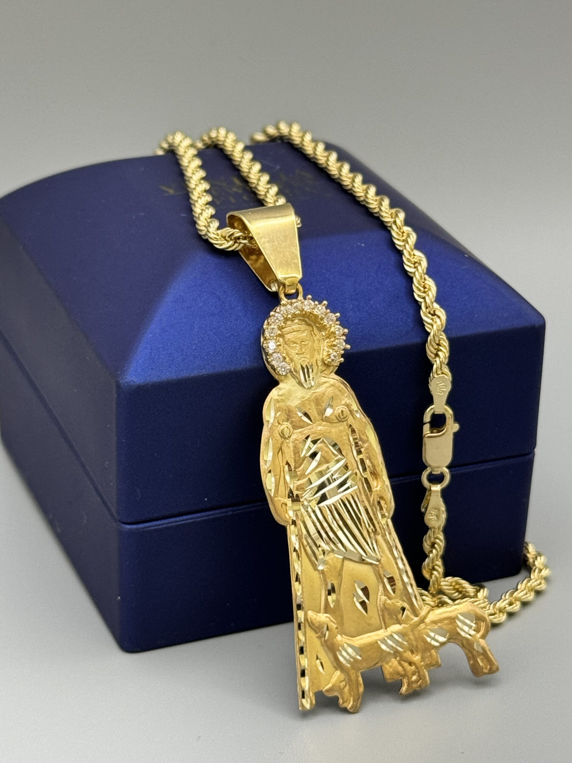 10KT Solid Gold St.Lazaro Pendant ComboSet Comes With 10KT Gold 3MM Rope Necklace 22″ Approx Gold Weight Of Necklace 5.6 Gram Pendant 6.3 Gram 2.5″ Tall Includes Bell By 1″ Wide