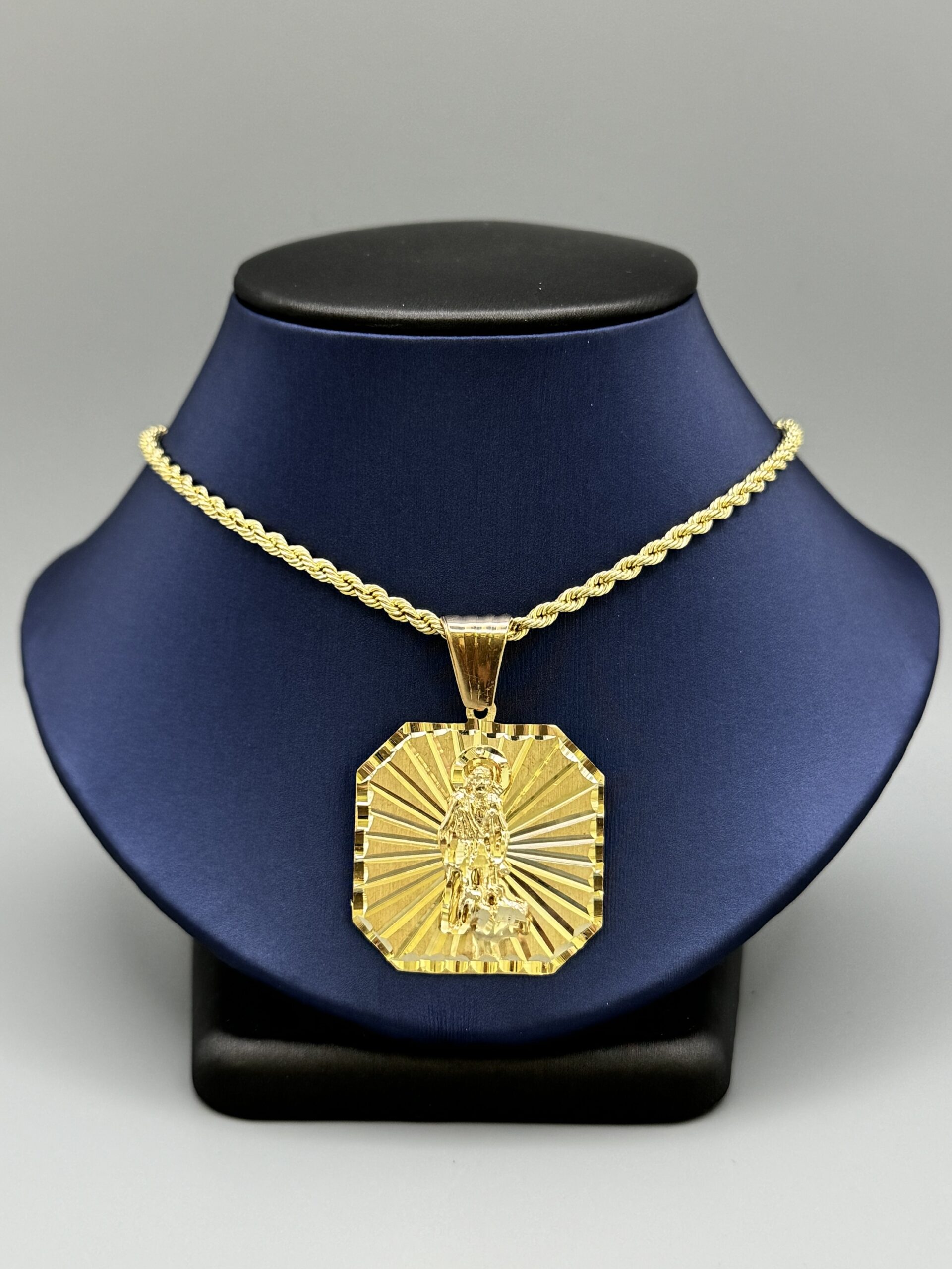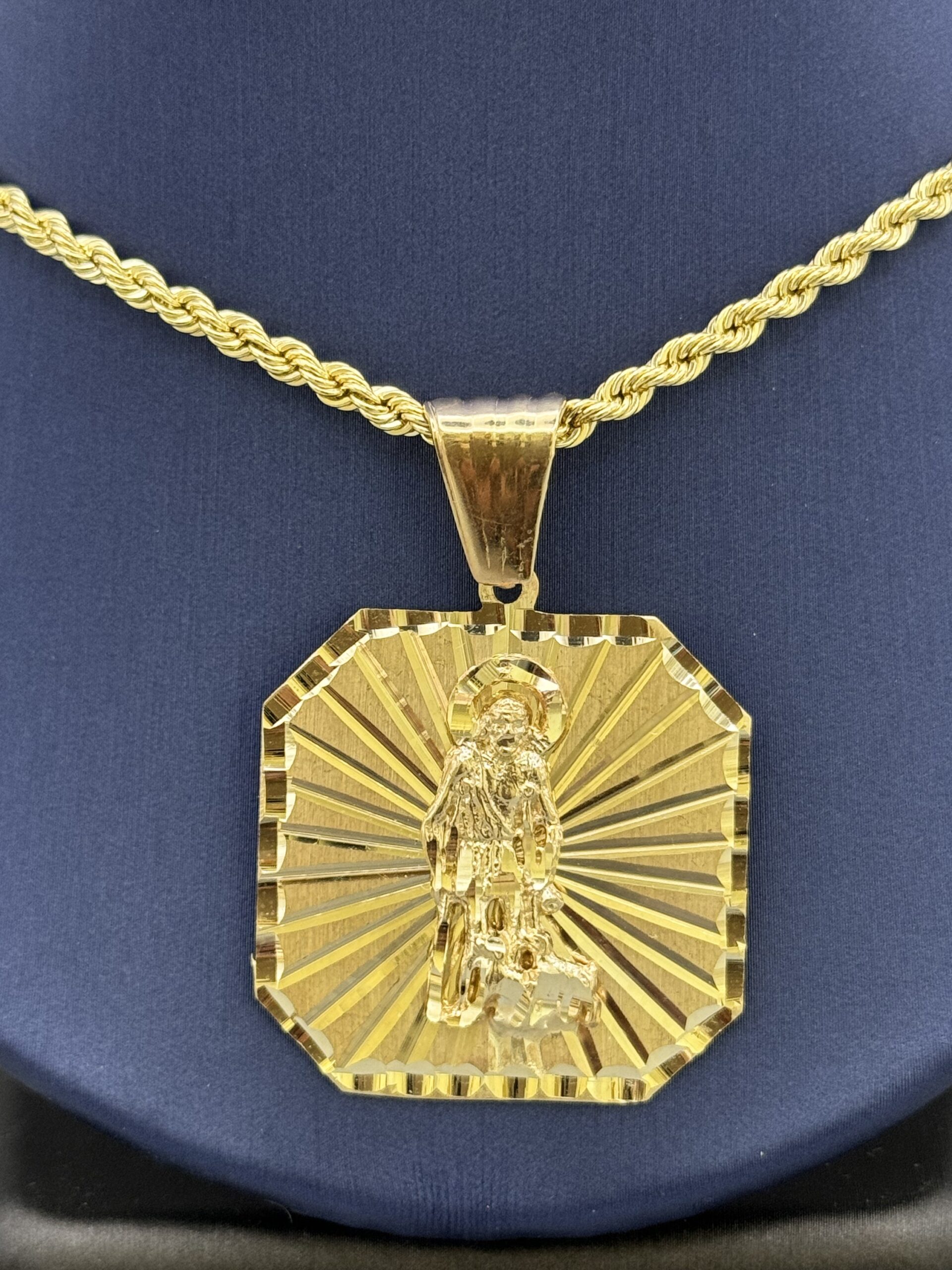 10KT Solid Gold St.Lazaro Pendant ComboSet Comes With 10KT Gold 3MM Rope Necklace 22″ Approx Gold Weight Of Necklace 5.6 Gram Pendant 7.4 Gram 1.75″ Tall Includes Bell By 1.25″ Wide