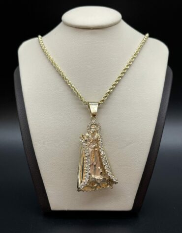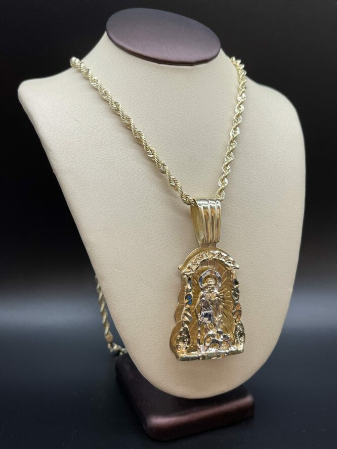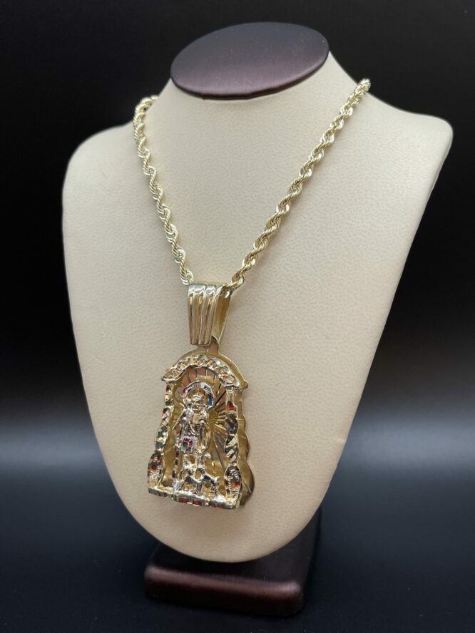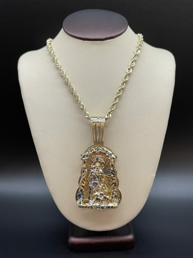 10KT Solid Gold Saint Lazaro Pendant Combo Set Comes With 4MM Rope Necklace Approx Gold Weight 7.32 Grams Pendant Approx Weight 24.09 Grams Length 2.5 Inches Includes Bell Width 1.25 Inches Custom Solid Back
