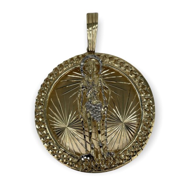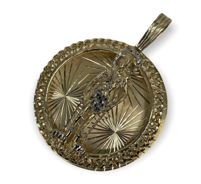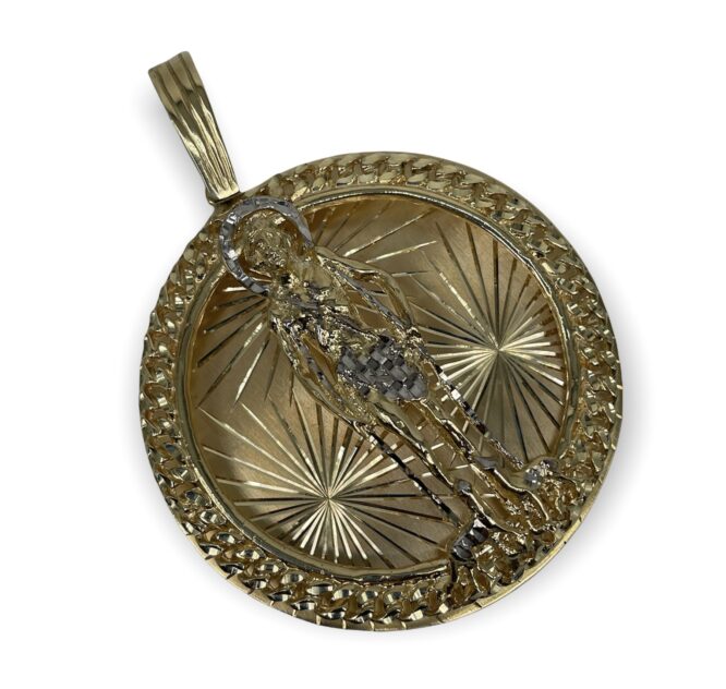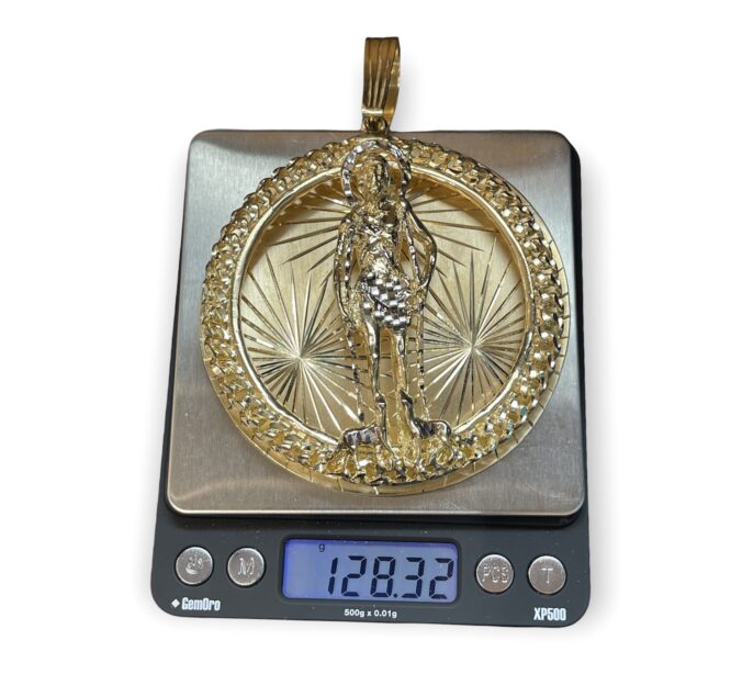 10KT Gold Solid Saint Lazaro Pendant 3.5 Inches Round With 1 Inches Bell Approx Gold Weight 128.32 Gram