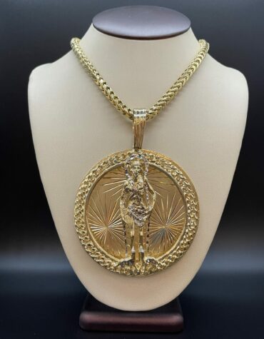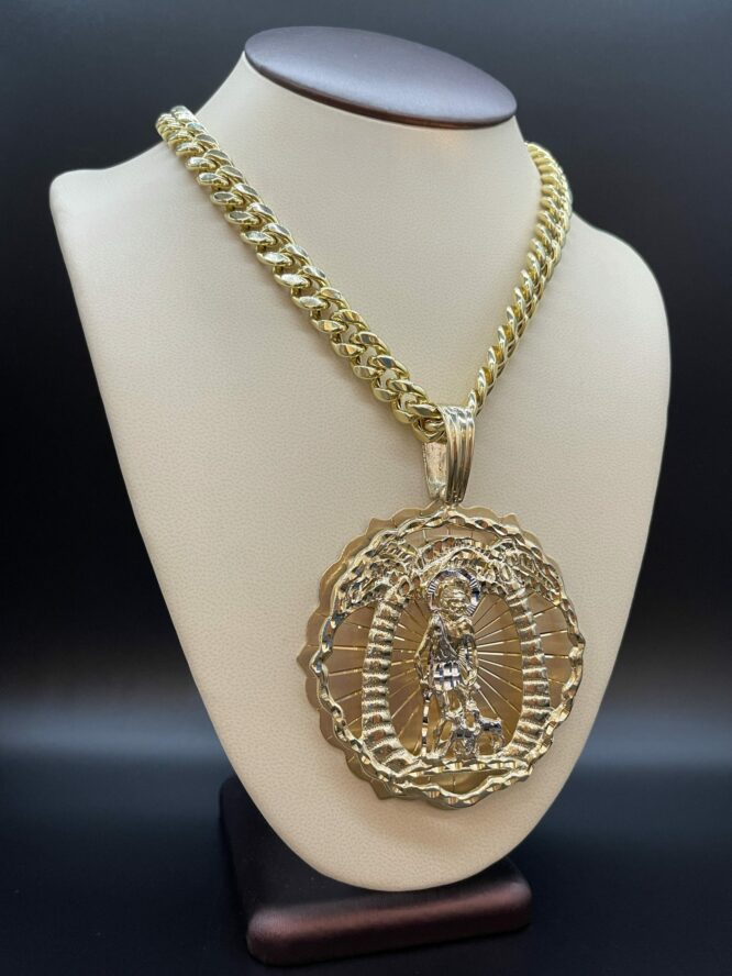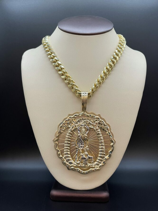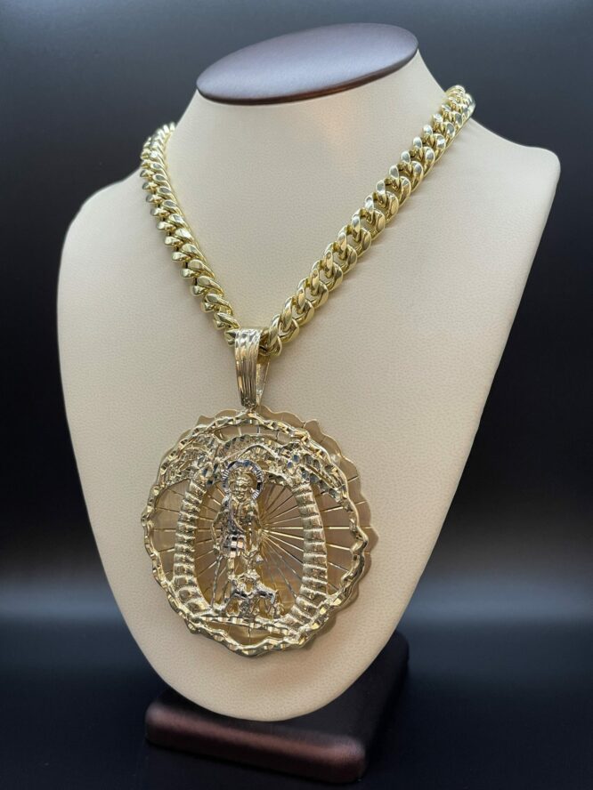 10Kt Gold Saint Lazaro Pendant Solid Gold Approx Weight 80.70 Grams With Semi Solid Gold MiamiCuban Chain Approx Gold Weight 74.55 Grams 11 MM 28″ Length