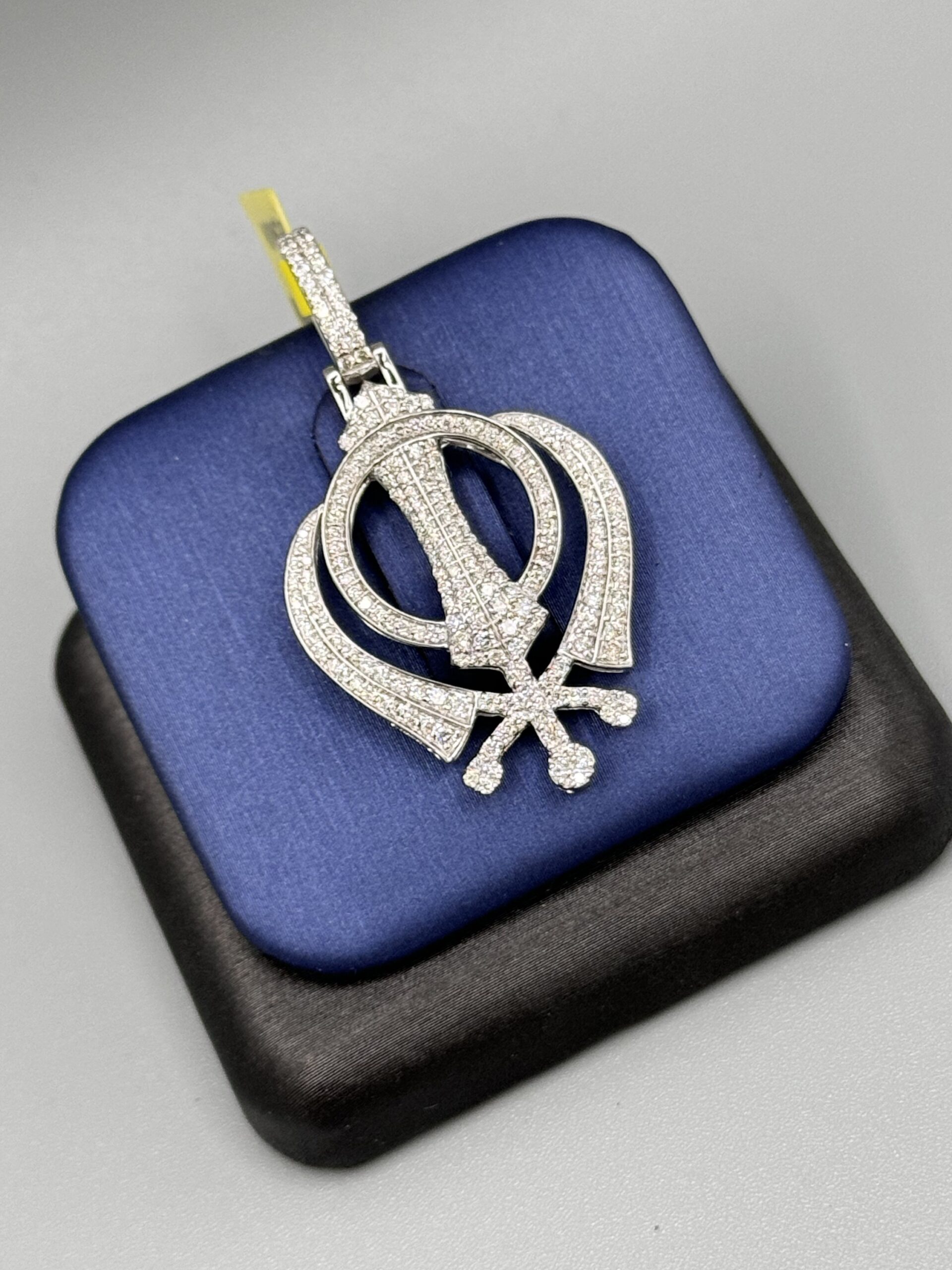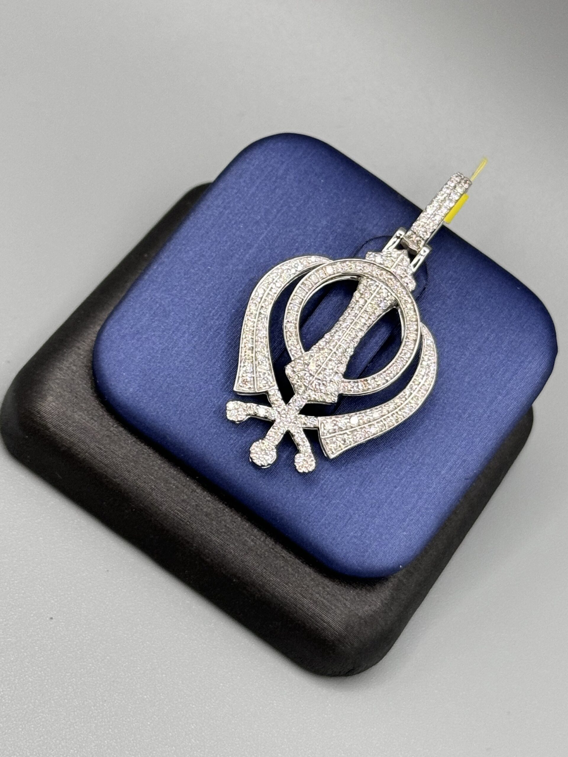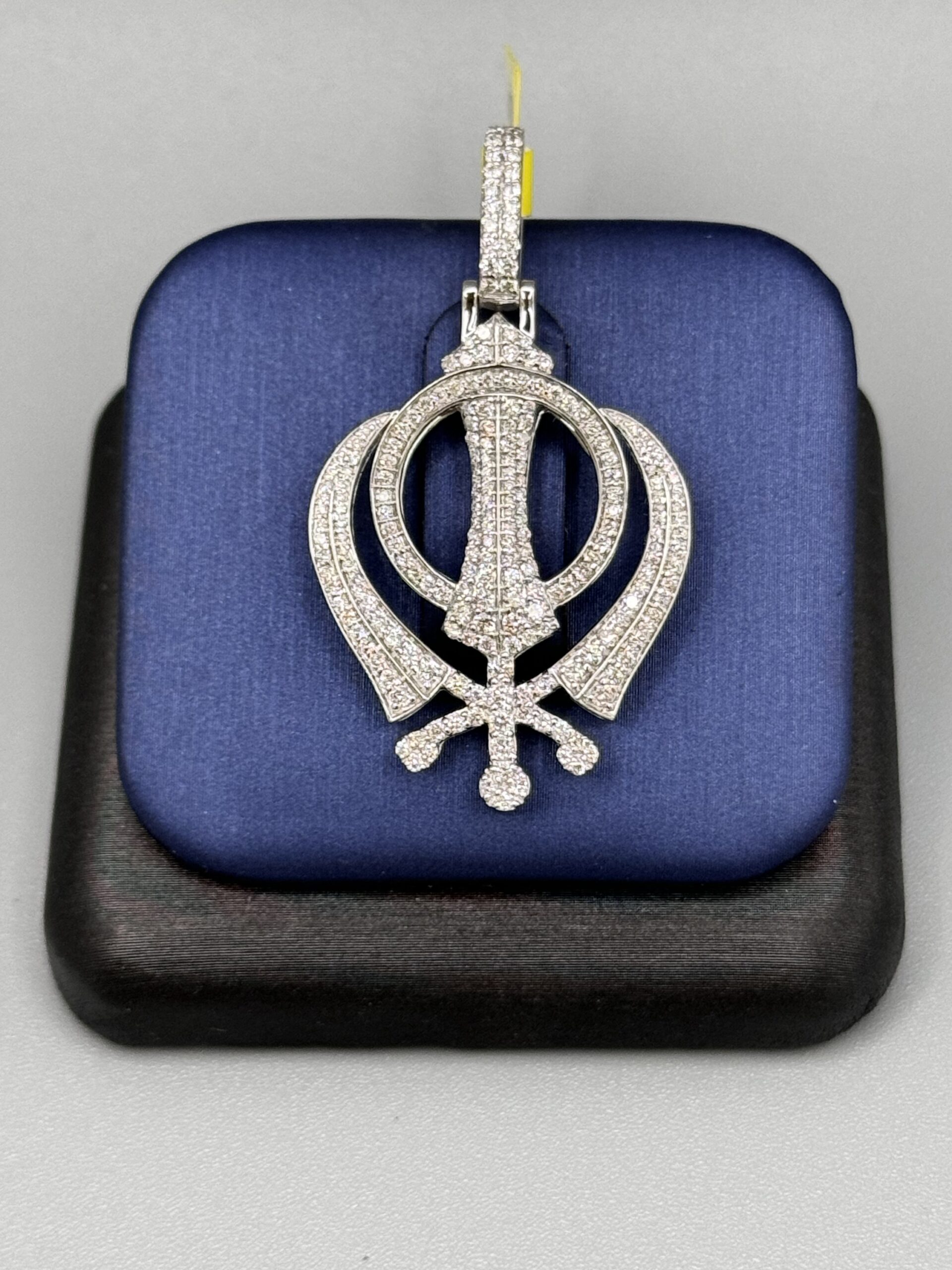 Elevate your style with this 10KT White Gold 1.05CT Diamond Double Curved Sword Pendant. Perfectly custom-made at 1.75″ tall and 1″ wide, wear it with pride and say, “Bole Sonihal Satsriyakal!