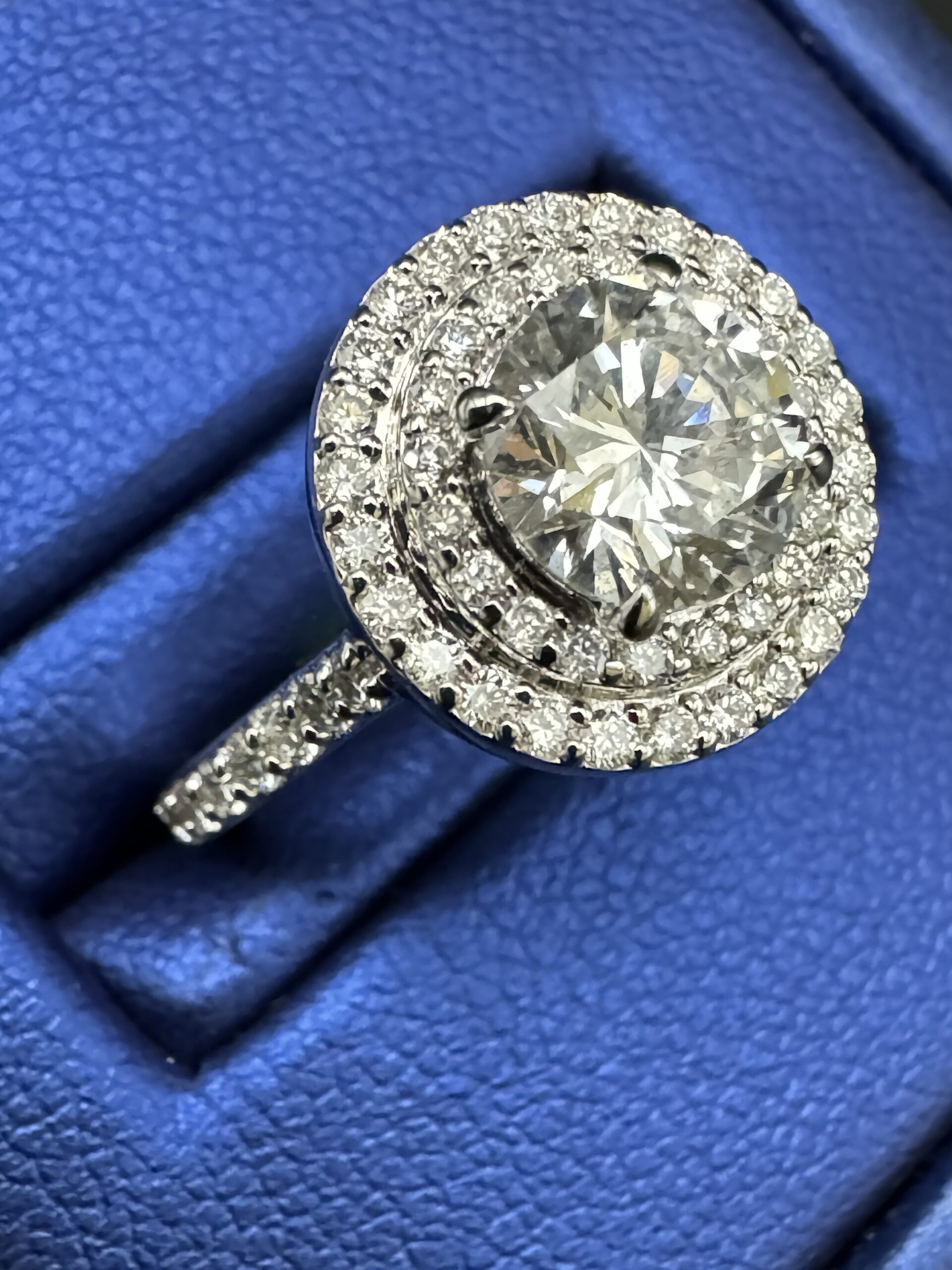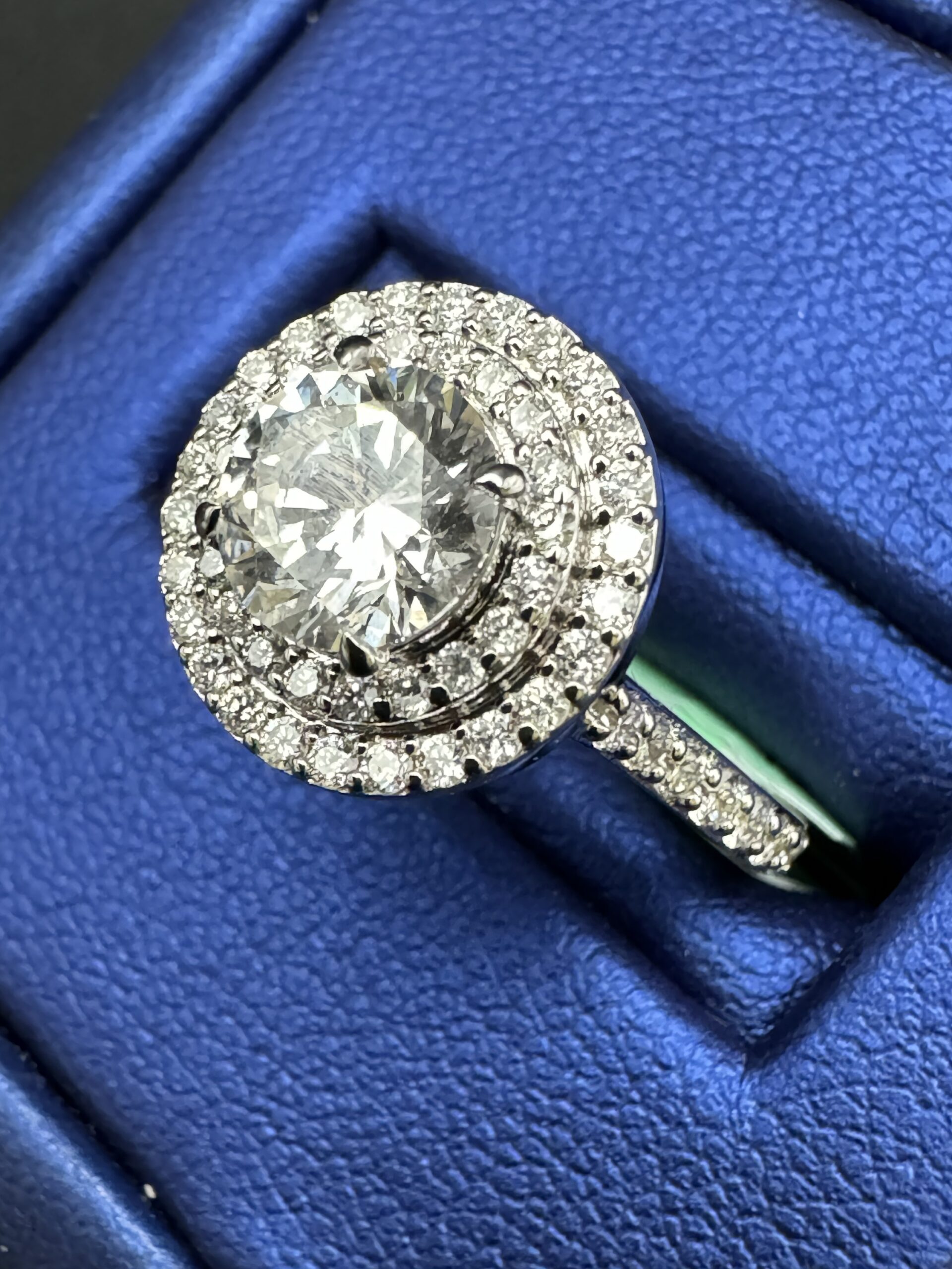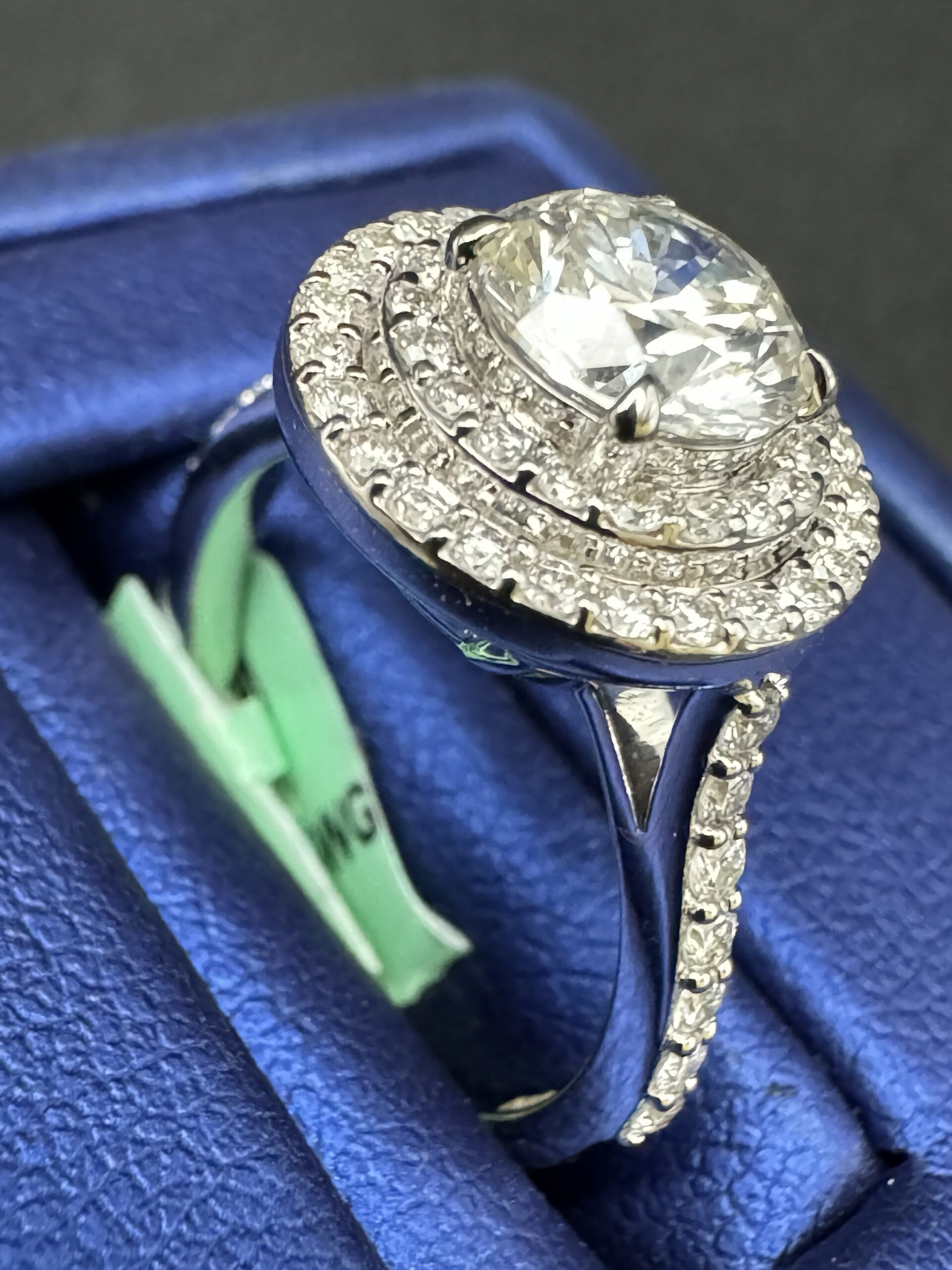 10KT W/Gold 1.61CT LabGrown Diamond Ring RoundCut Size 5.5 Approx Gold Weight 3.8 Gram 12MM Halo Head 2MM Side VVs Clarity F Color Traditional Look Sizing Available