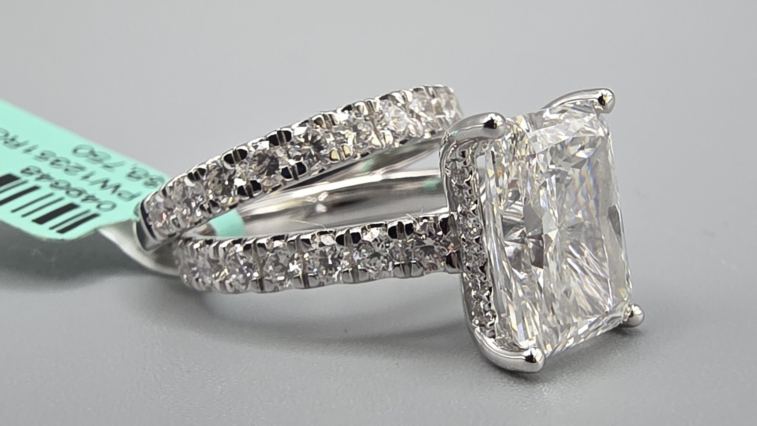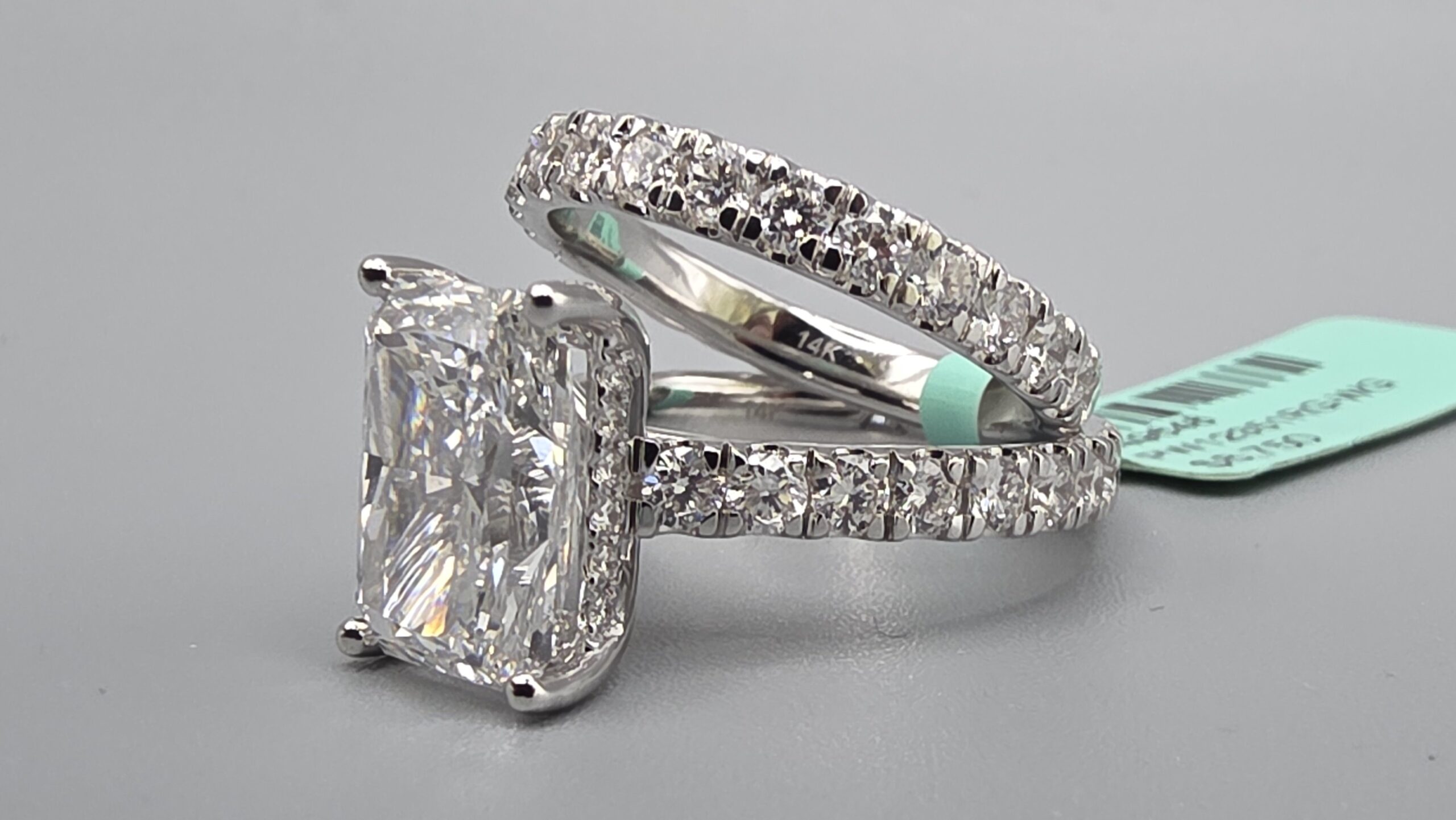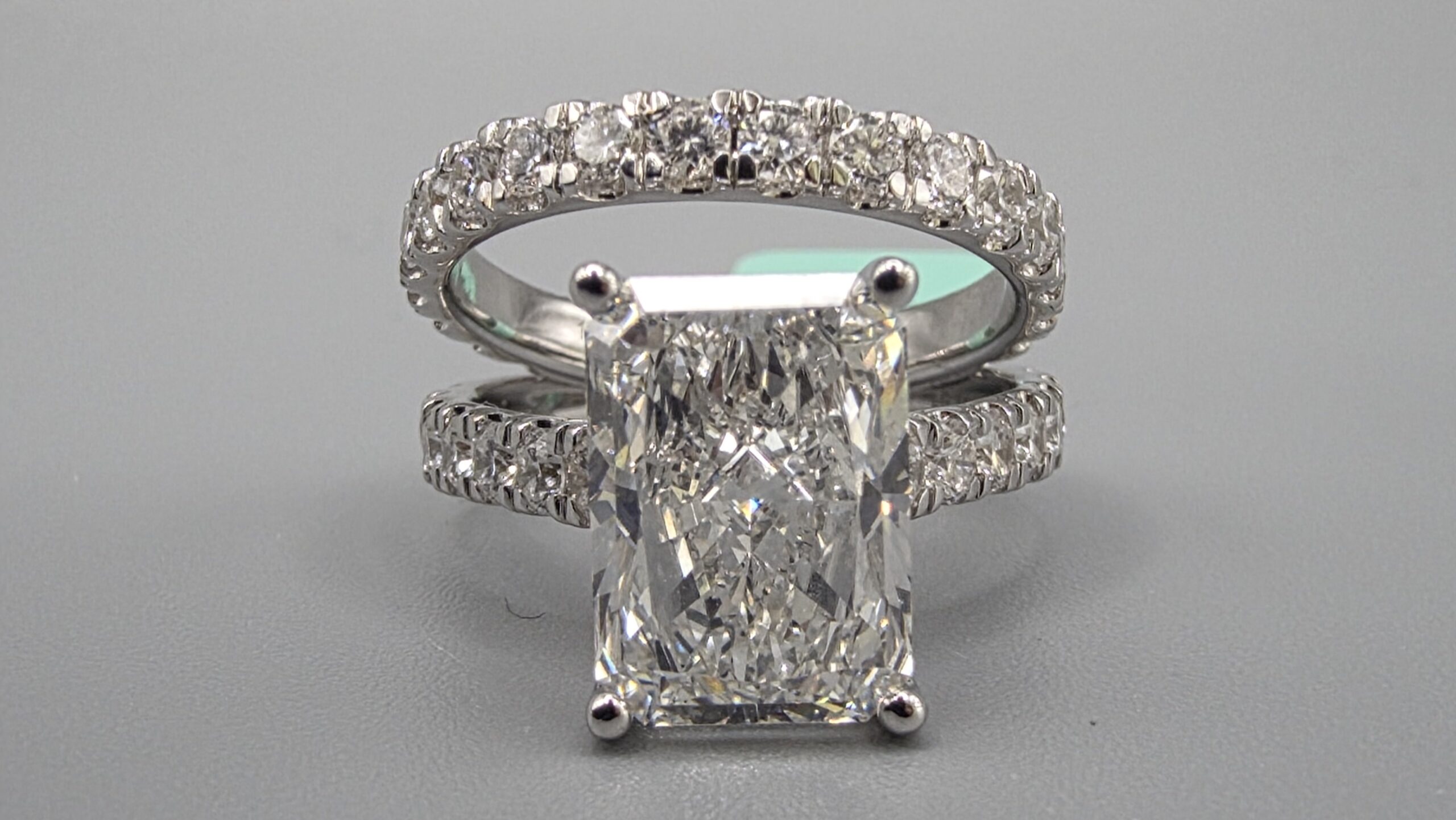 Say “I do” with a dazzling 14K white gold bridal ring featuring a stunning 4.04CT emerald-cut solitaire and 5.96CT of diamonds. Size 7, weighing approximately 7.4 grams—love at first sight!