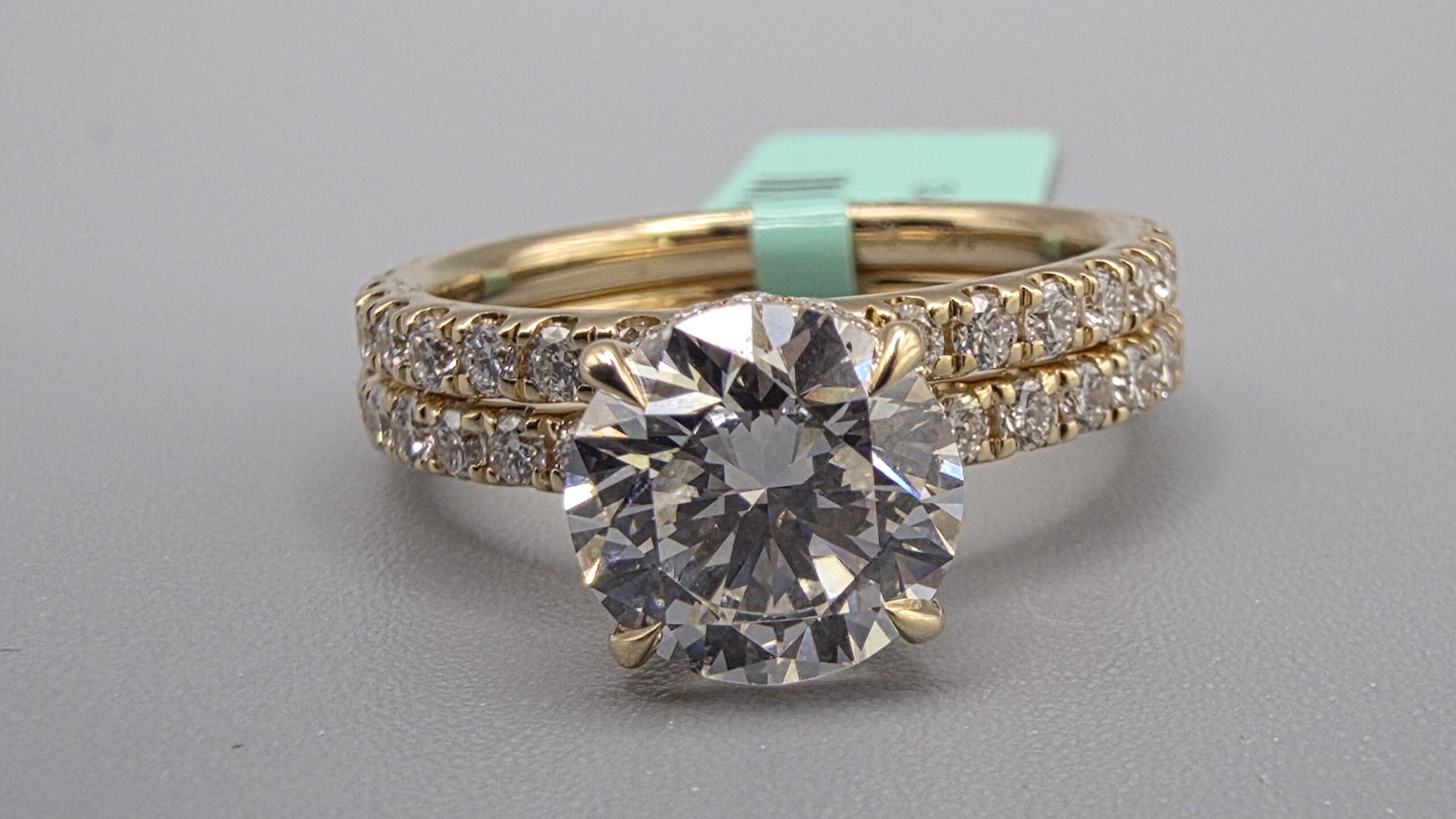 Elevate your love story with this stunning 14K yellow gold bridal ring. Featuring a 2.03CT round-cut solitaire and 3.14CT total diamond weight, it shines with 5.1 grams of pure elegance in size 7.