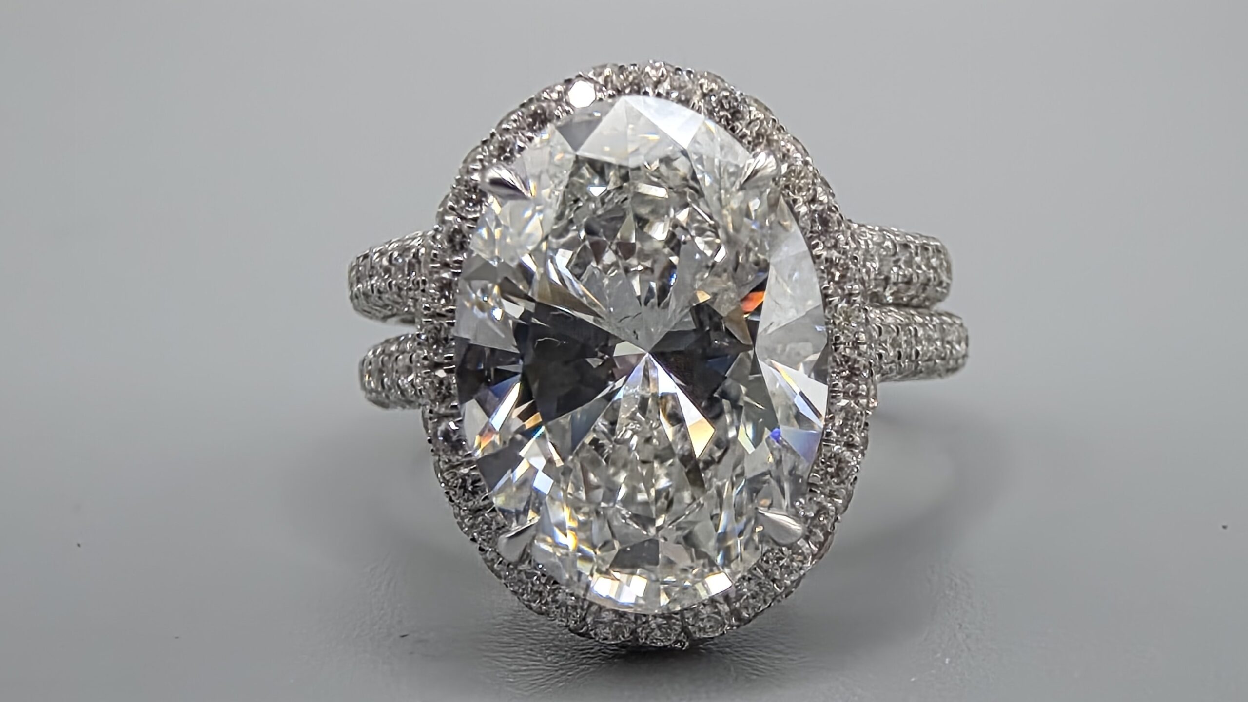 This stunning 14K YGold bridal ring features a 5.00CT oval solitaire nestled among dazzling 6.90CT diamonds. Size 7 and weighing 7.0 grams, it’s an exquisite symbol of love ready to shine!