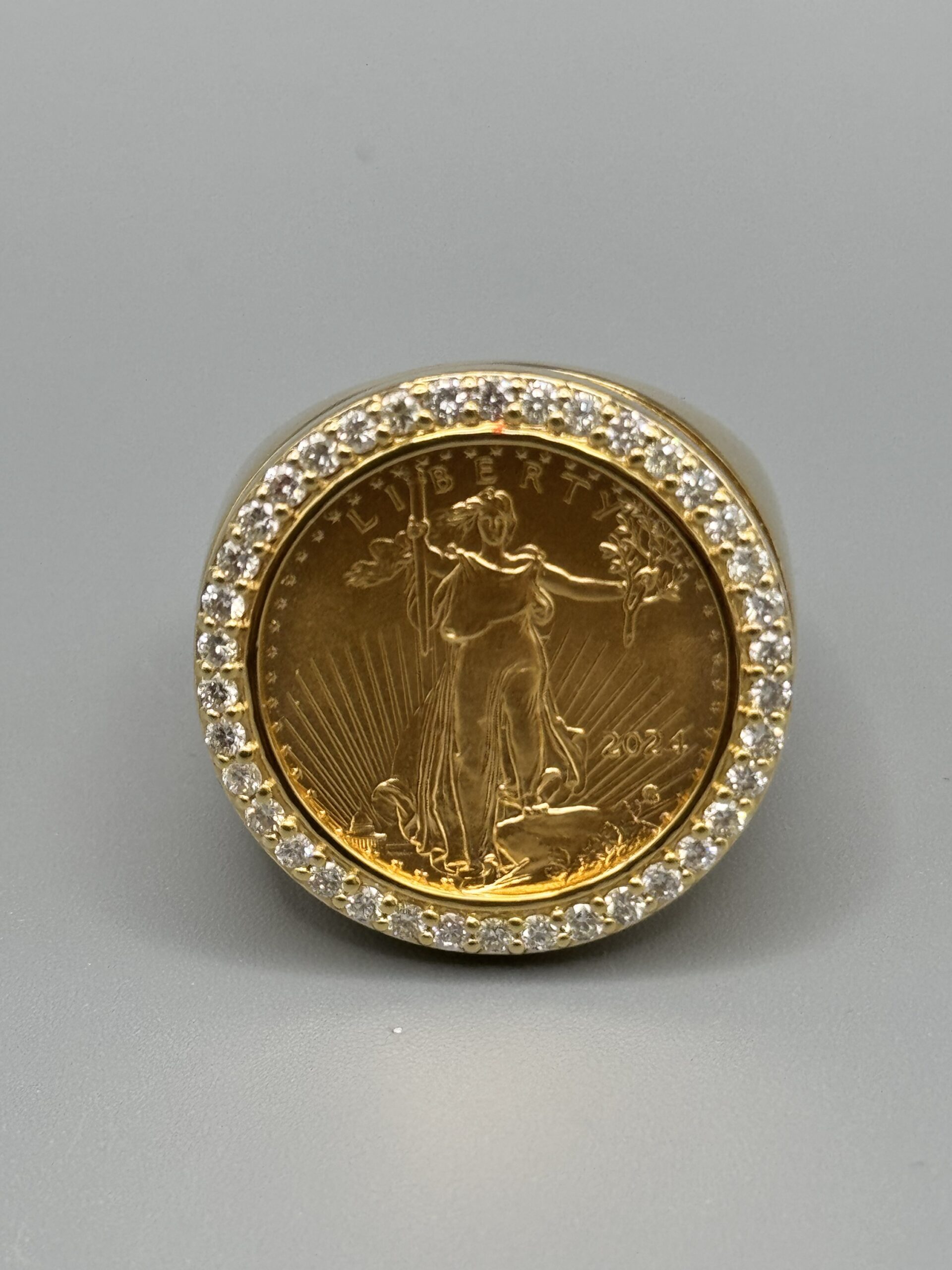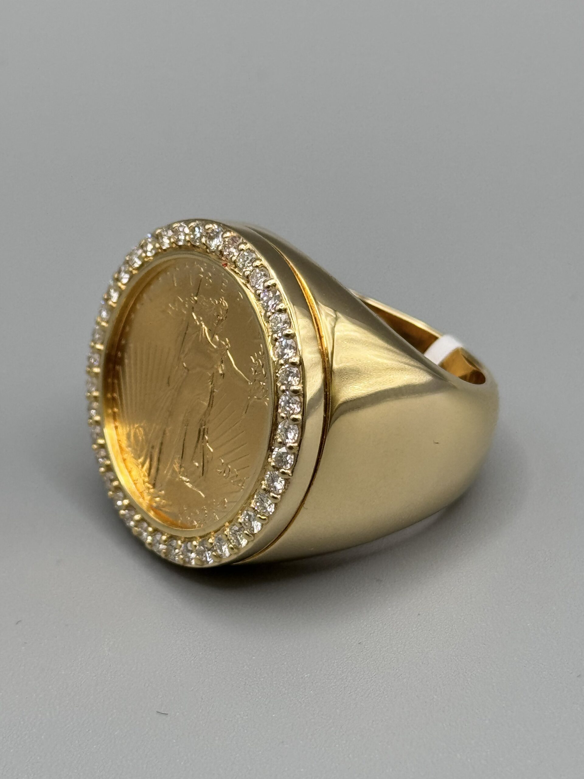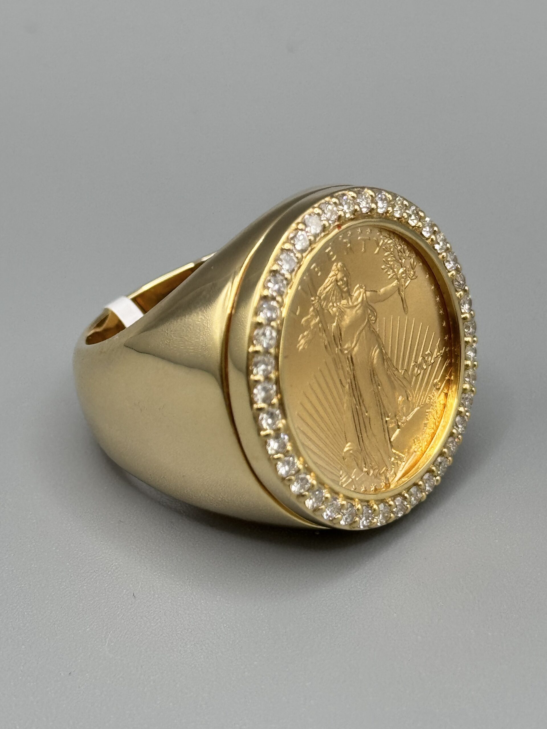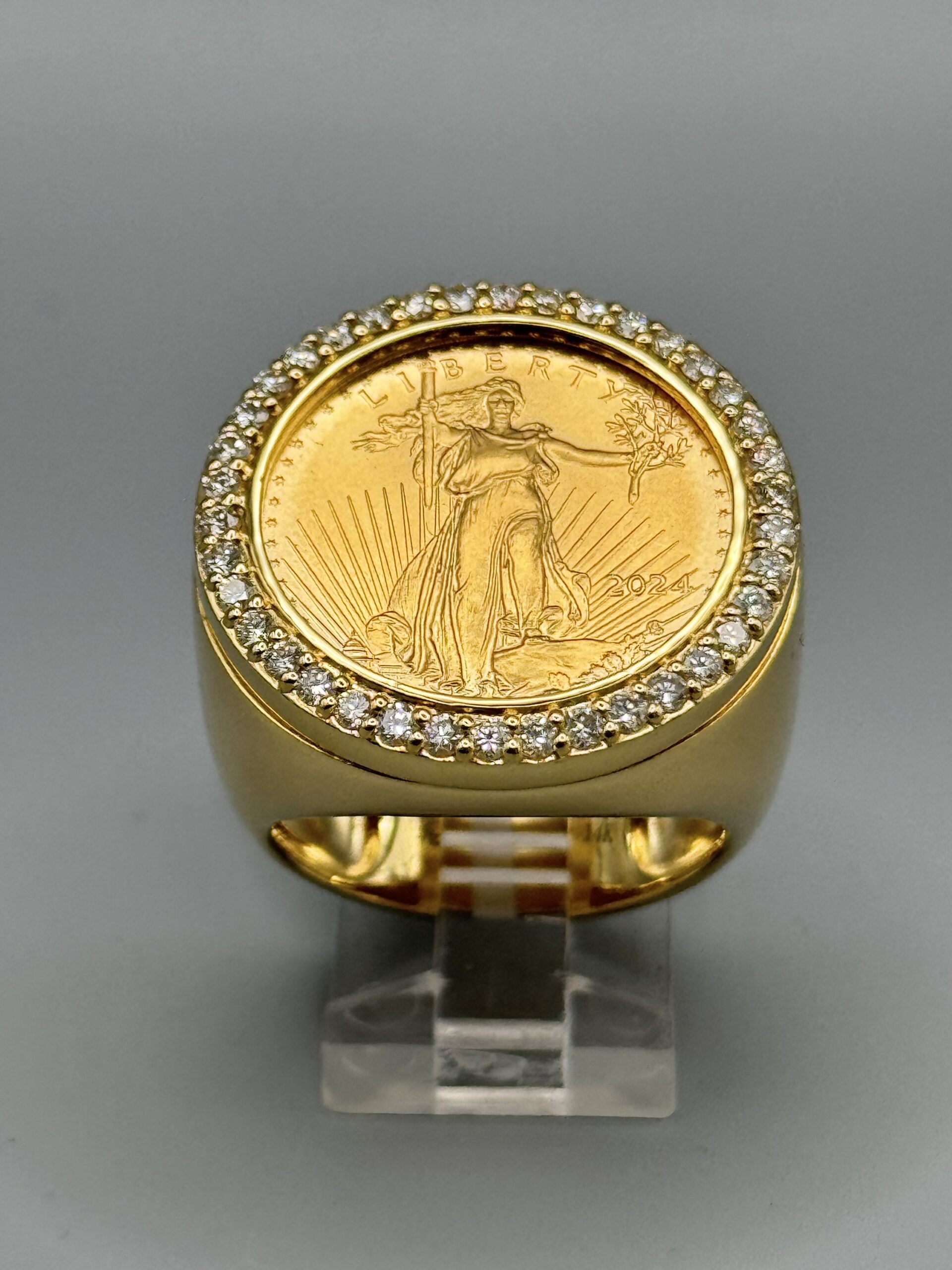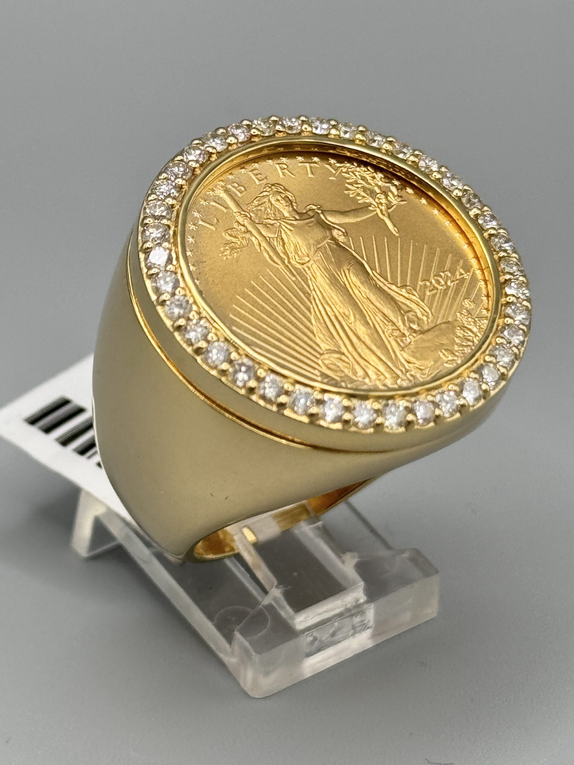 14KT Gold 0.95CT Diamond 1/4 OZ Liberty Coin Ring Size 10 Solid Gold With Smooth Design Coin Weigh 8.43 Grams Ring Total Weight 24.6 Gram Sizing Available 27MM Top Head Width