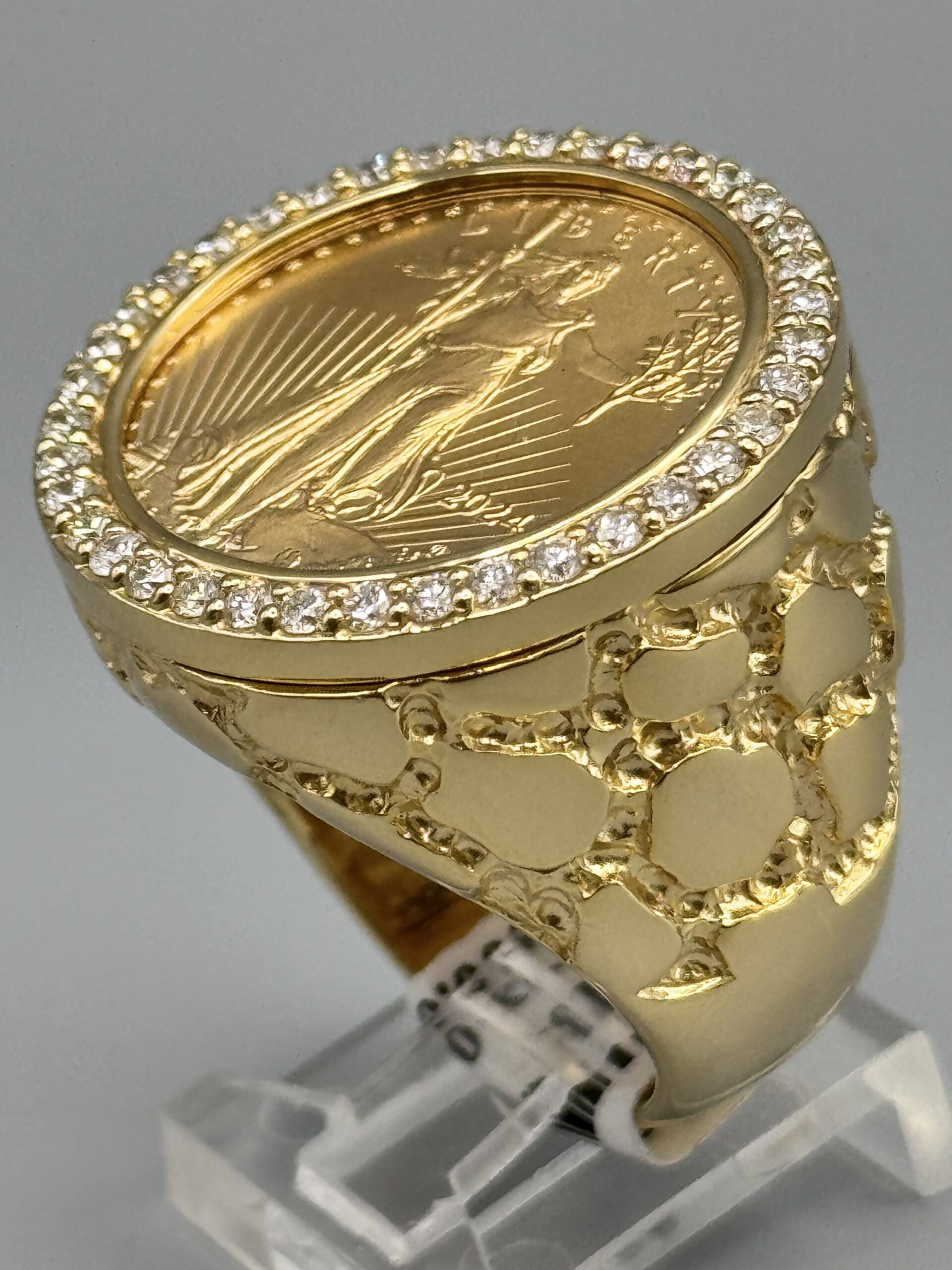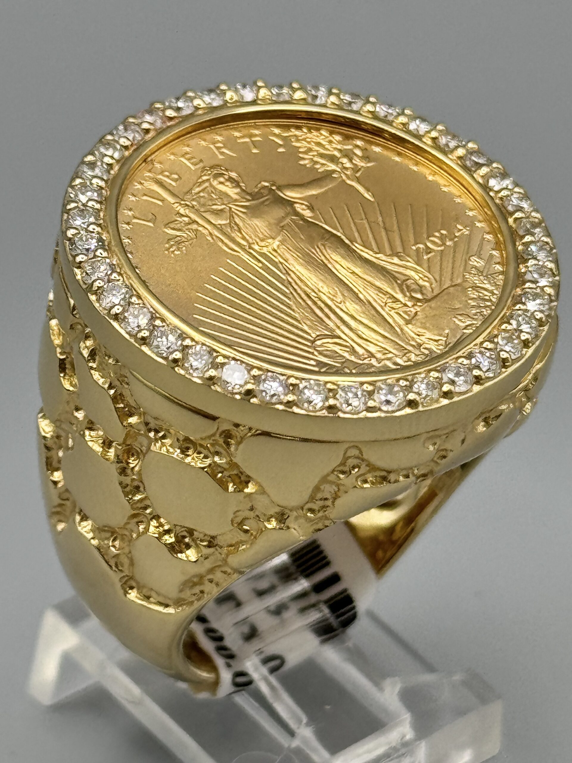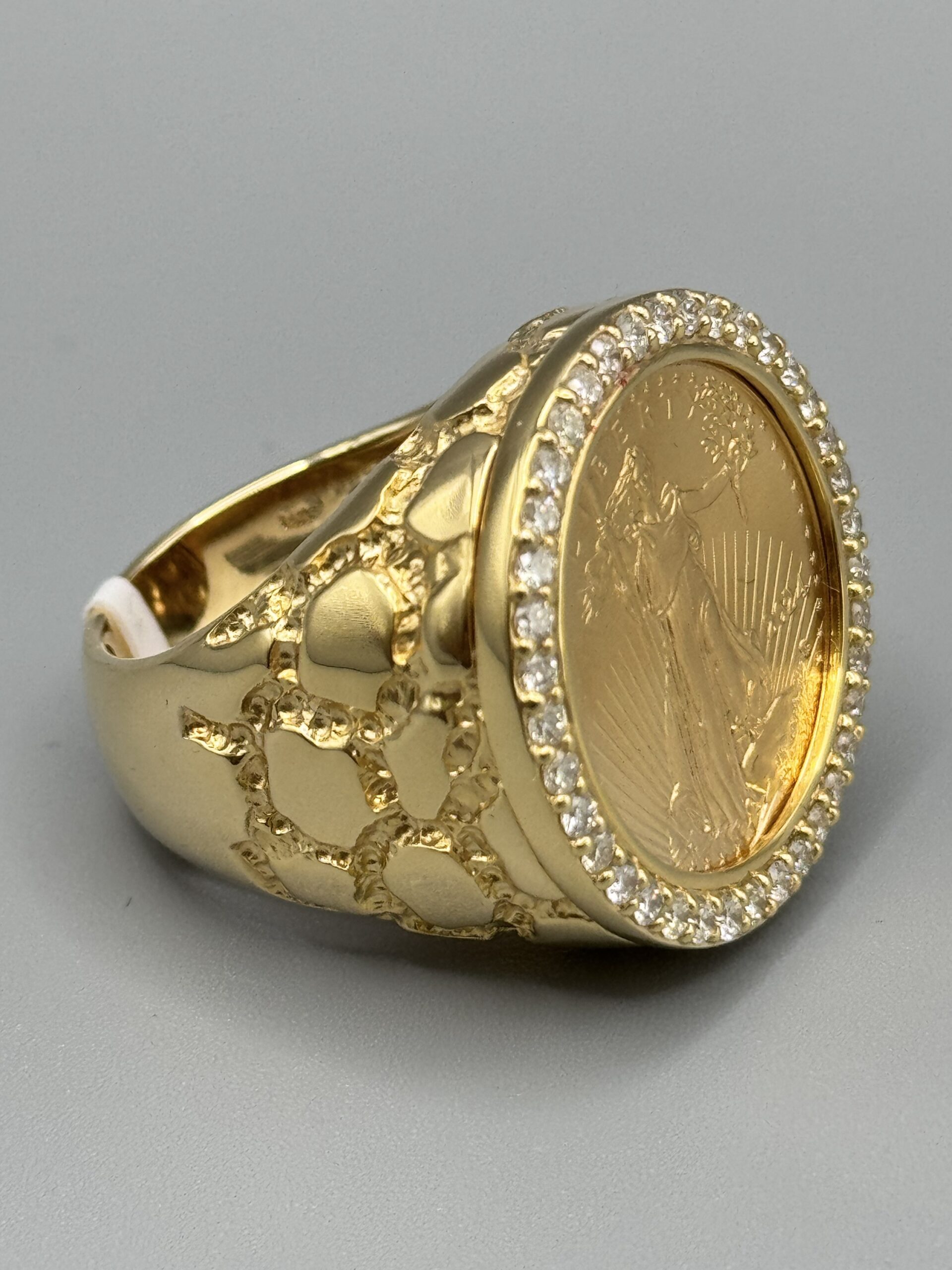 14KT Gold 0.95CT Diamond 1/4 OZ Liberty Coin Ring Size 10 Solid Gold With Nugget Design Coin Weigh 8.43 Grams Ring Total Weight 27.4 Gram Sizing Available 27MM Top Head Width