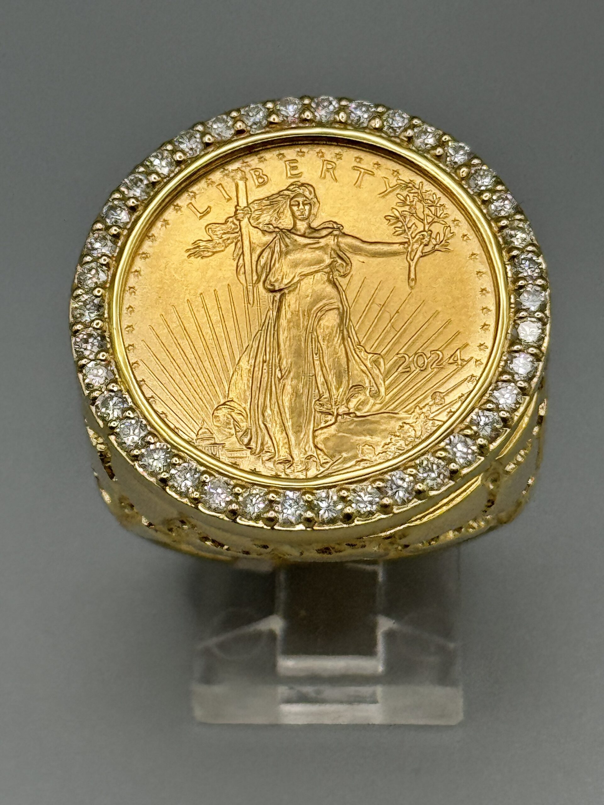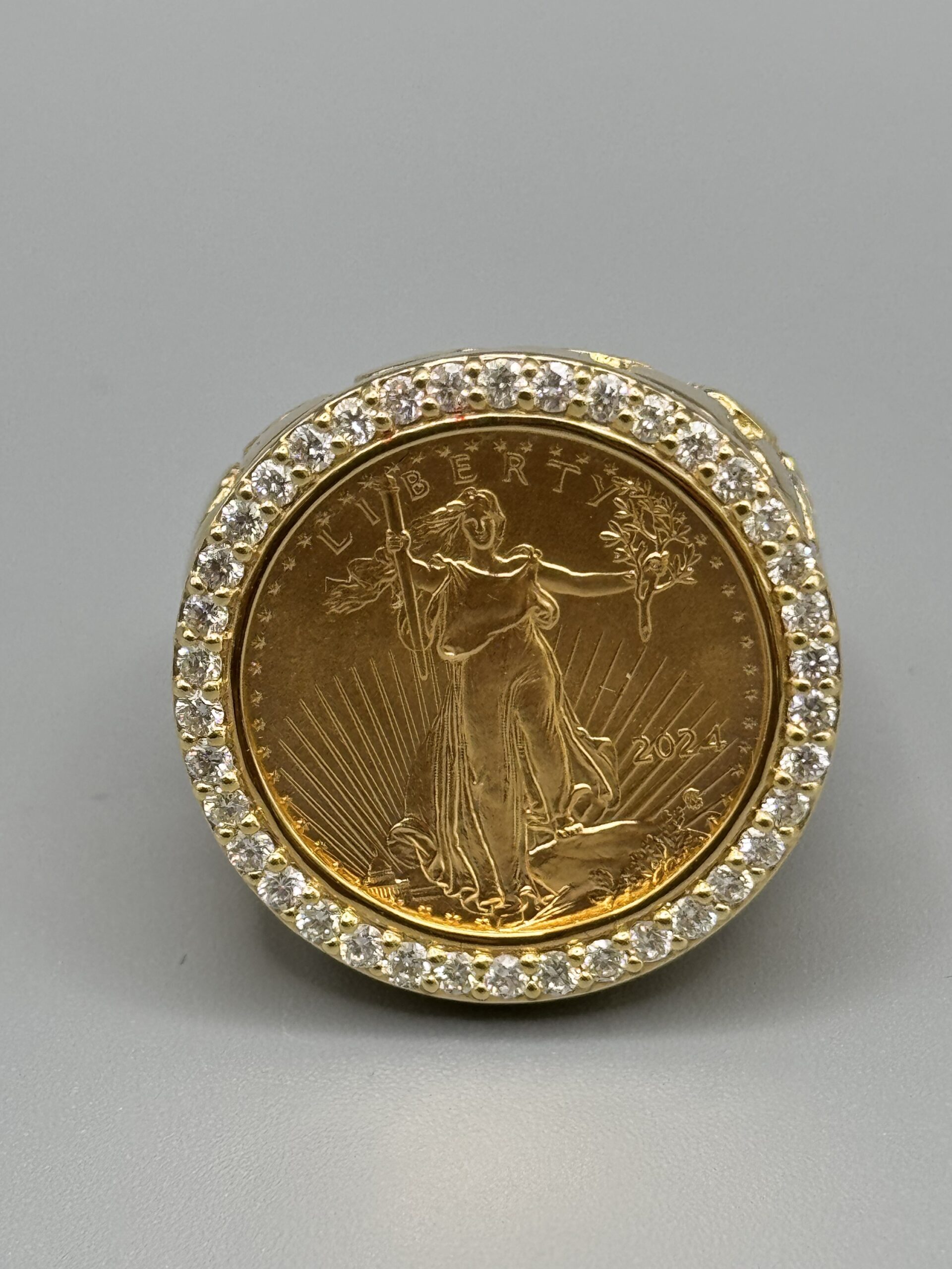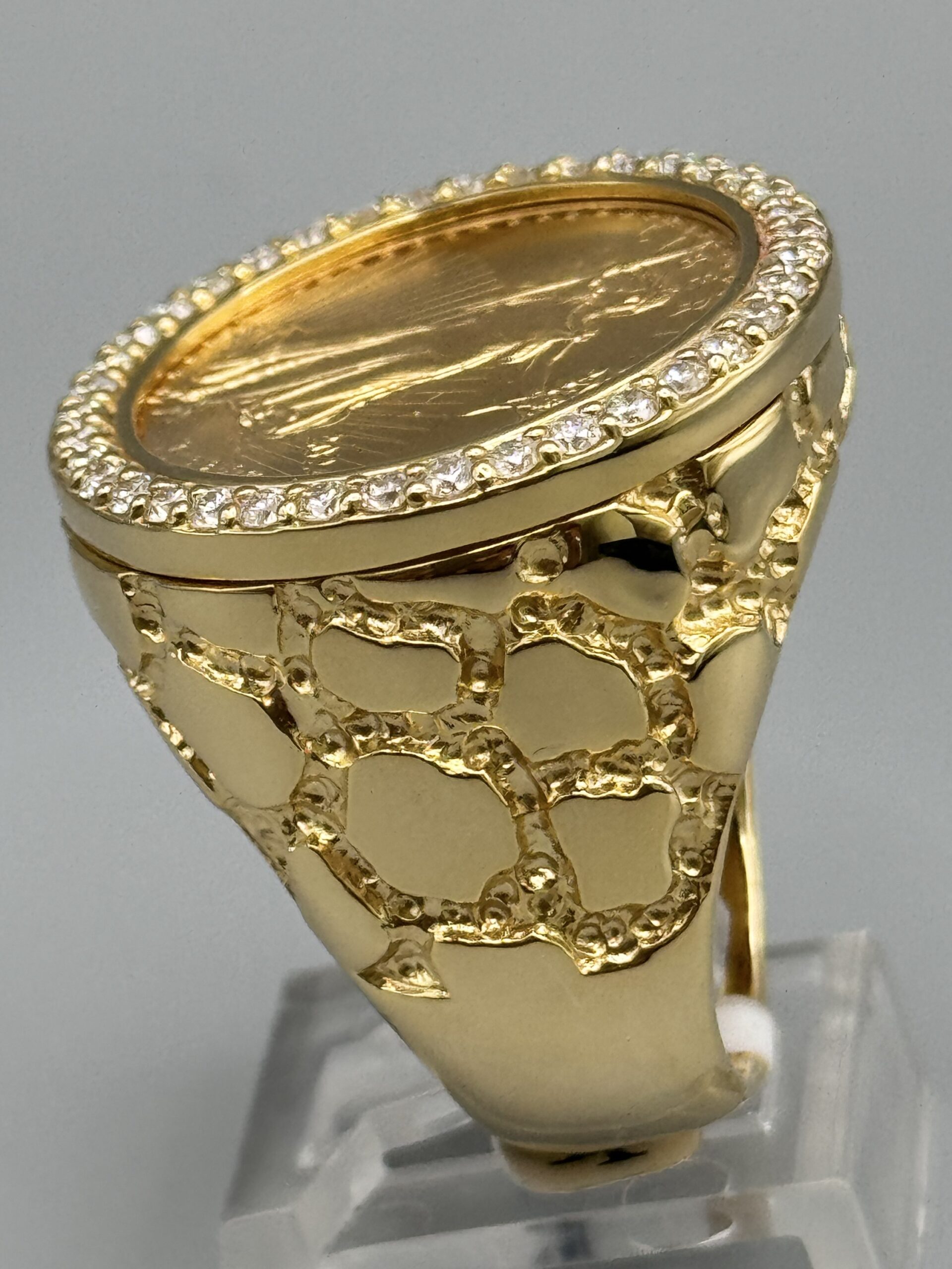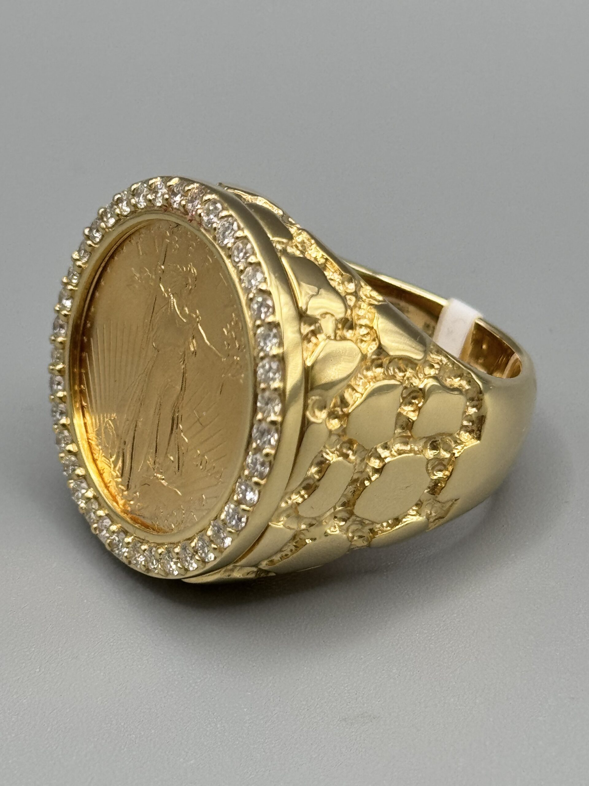 14KT Gold 0.95CT Diamond 1/4 OZ Liberty Coin Ring Size 10 Solid Gold With Nugget Design Coin Weigh 8.43 Grams Ring Total Weight 27.4 Gram Sizing Available 27MM Top Head Width