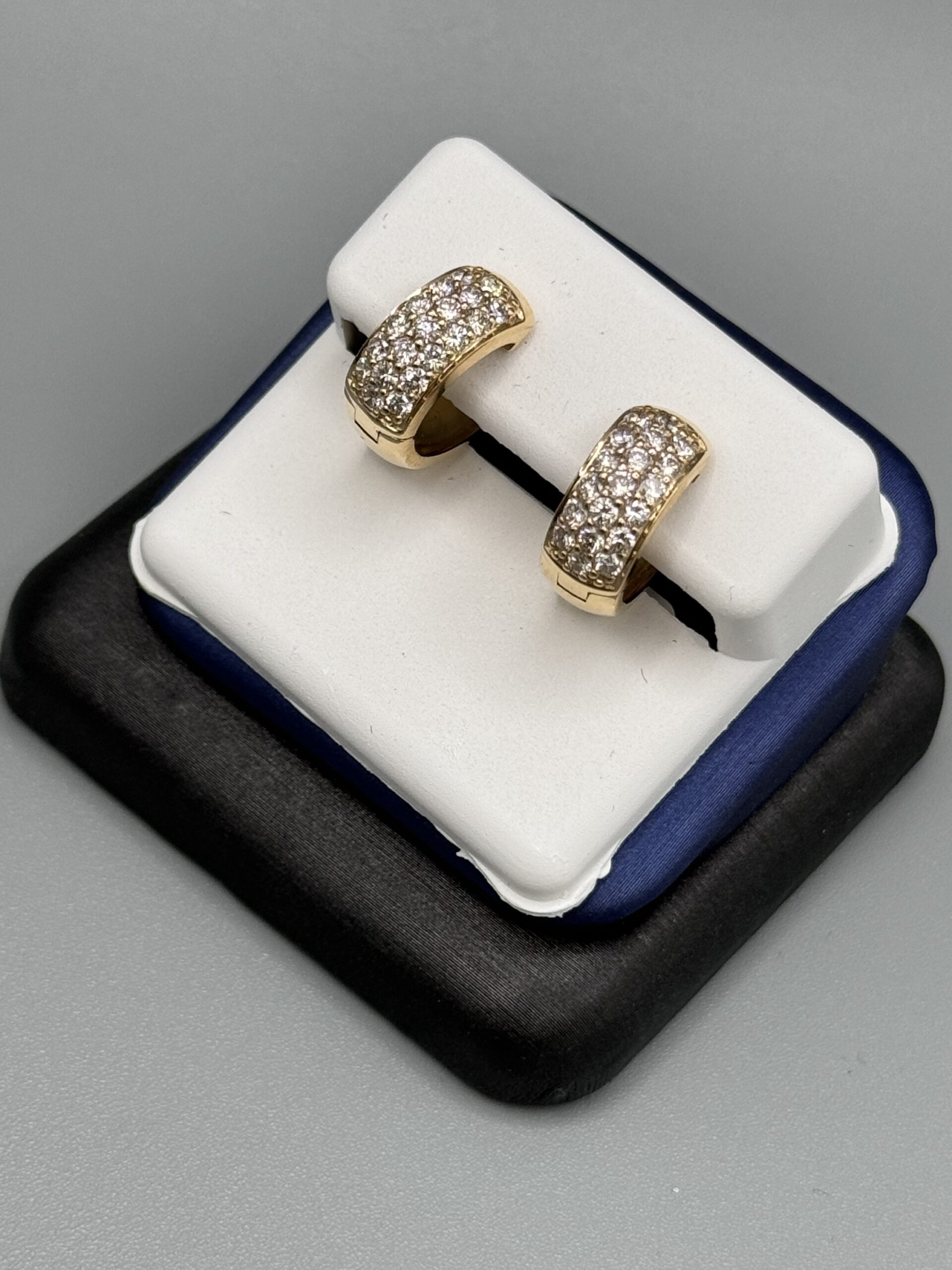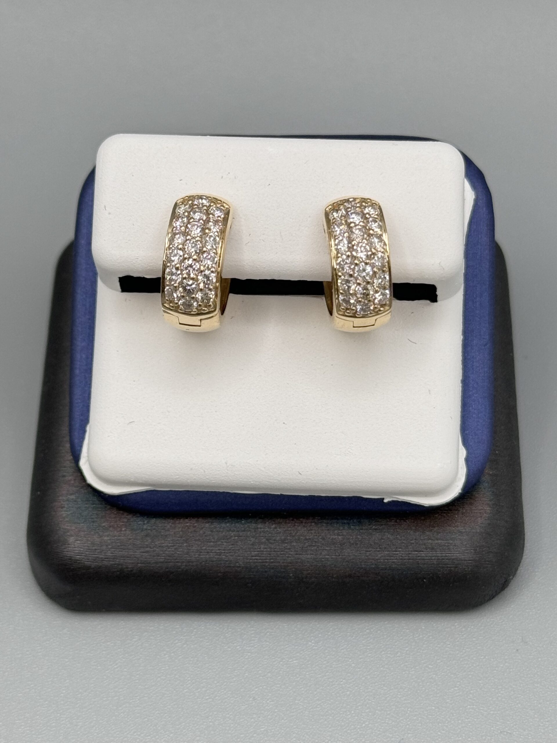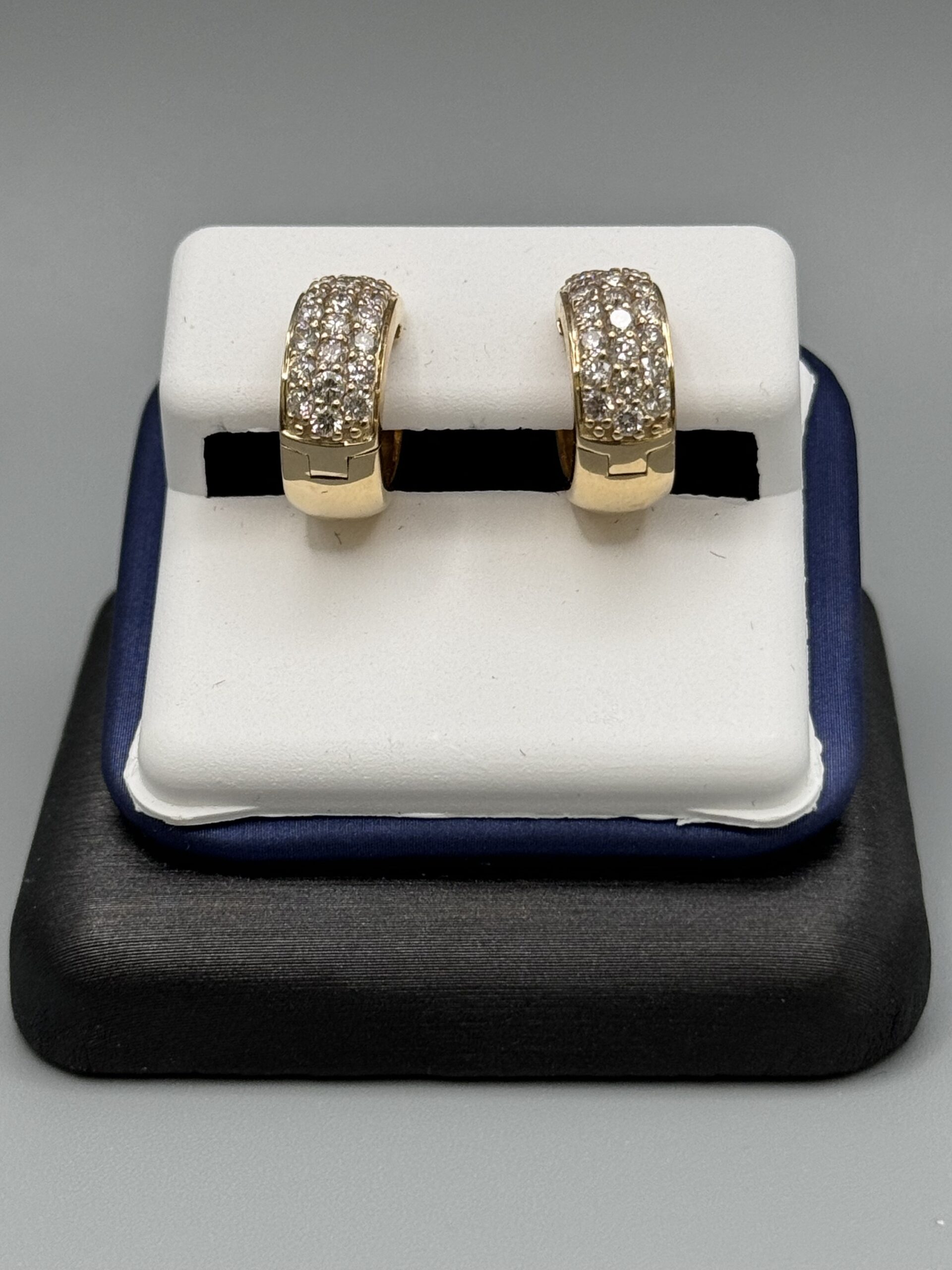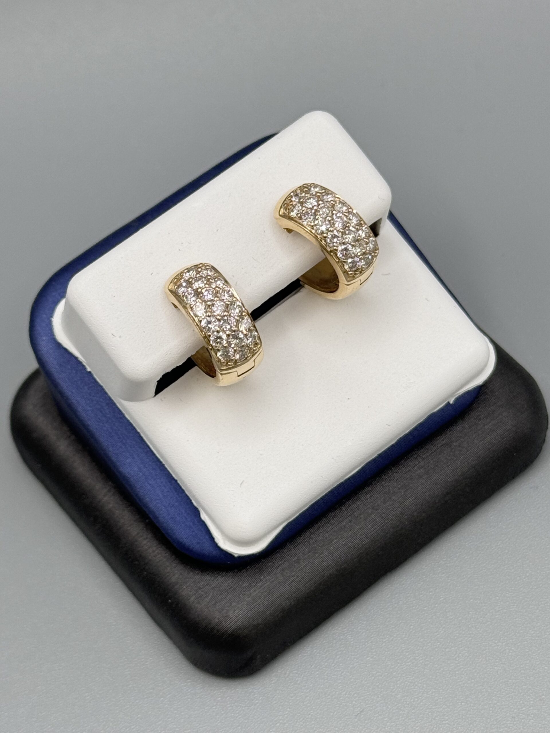 Elevate your style with these stunning 14KT Gold Diamond Huggies. Featuring 1.00CT of F Color Vs clarity diamonds, each hoop measures 1/2 inch tall by 6mm wide. Thick, solid gold backing ensures durability and luxury.