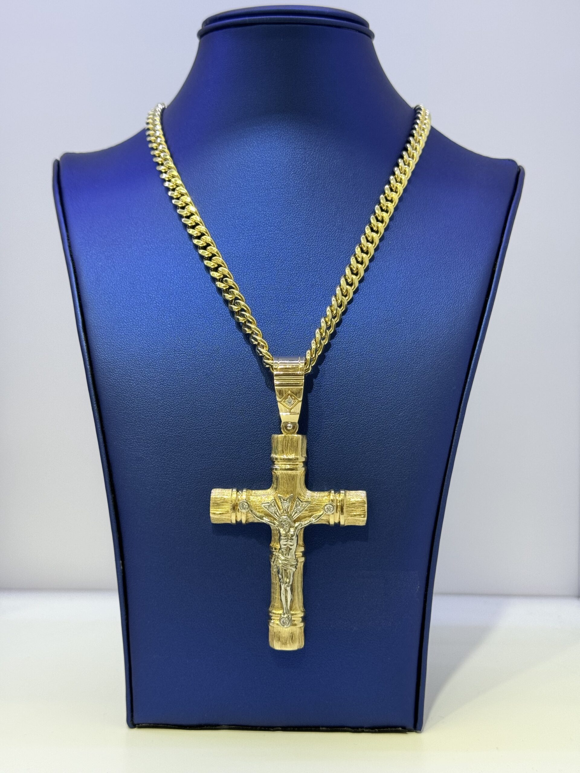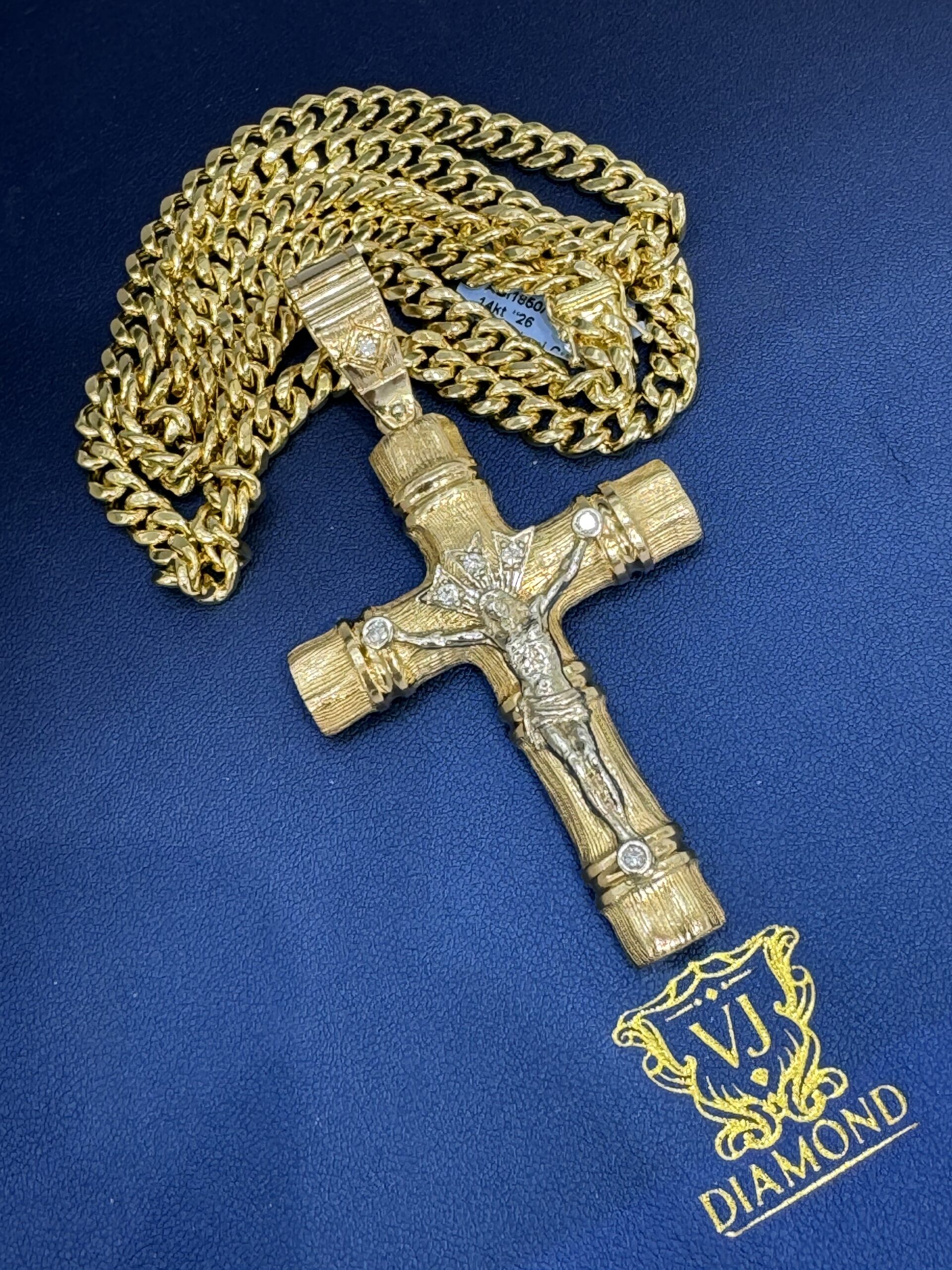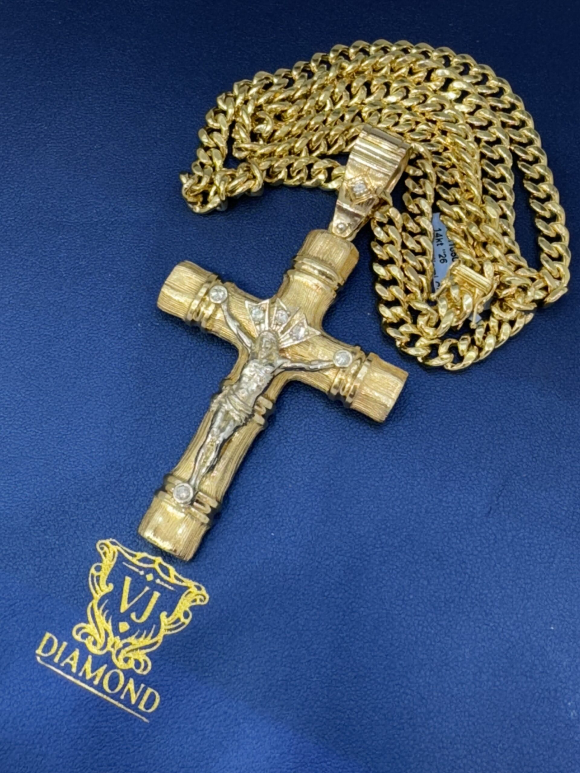 14KT Gold 1.00CT Diamond Solid Gold Cross Pendant With 14KT 7MM 26″ SemiSolid MiamiCuban Necklace 3.55″ Tall Cross By 2″ Wide Approx Gold Weight 44.0 Gram Chain Approx Gold Weight 20.1 Gram