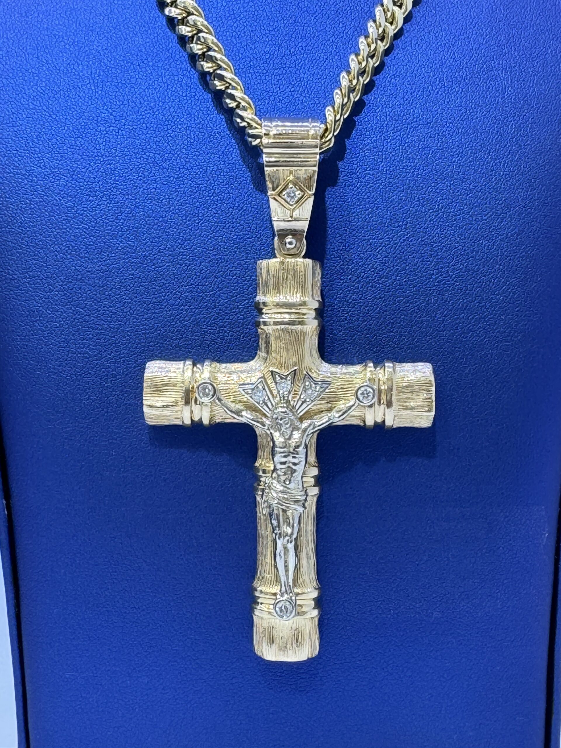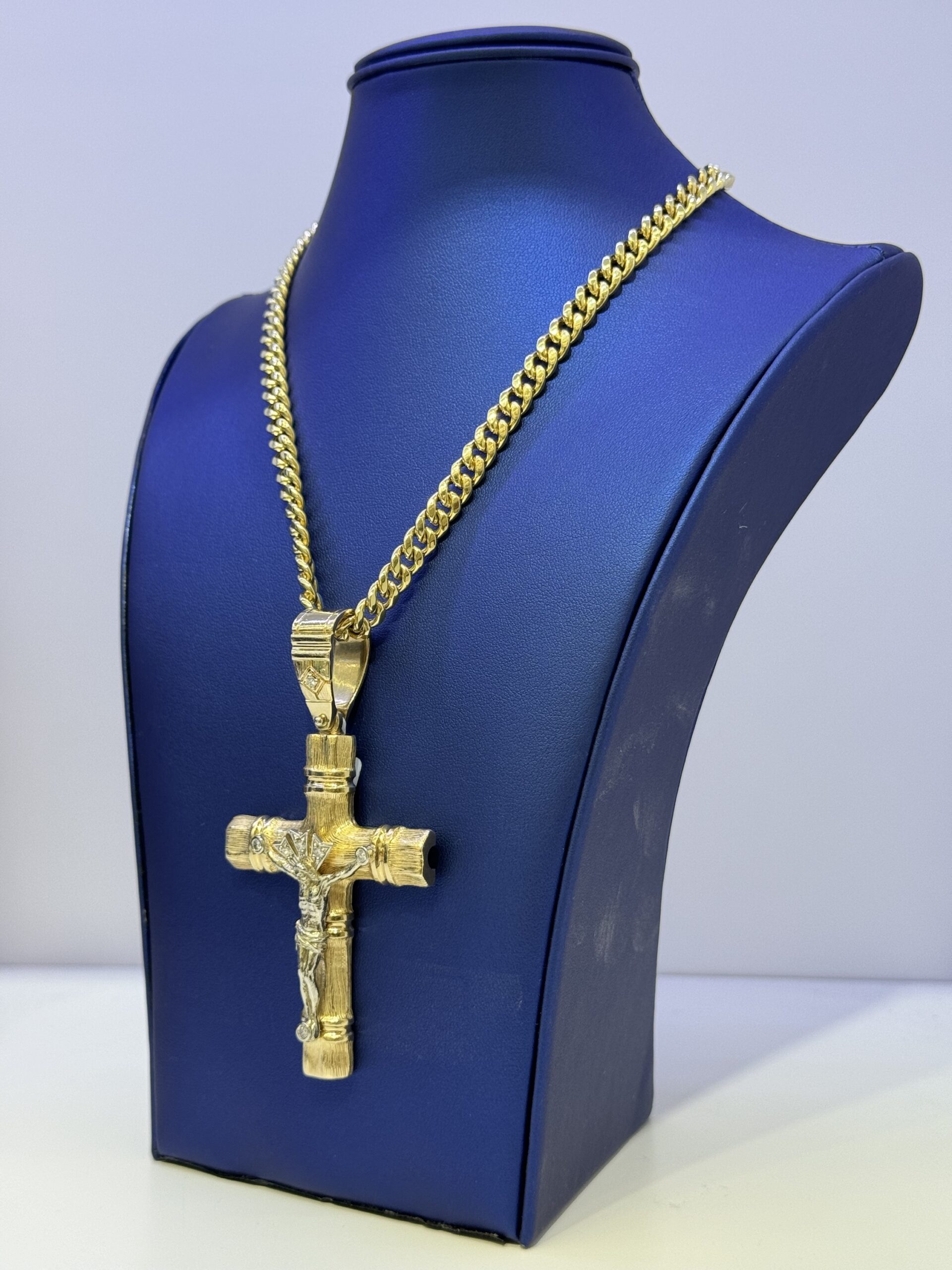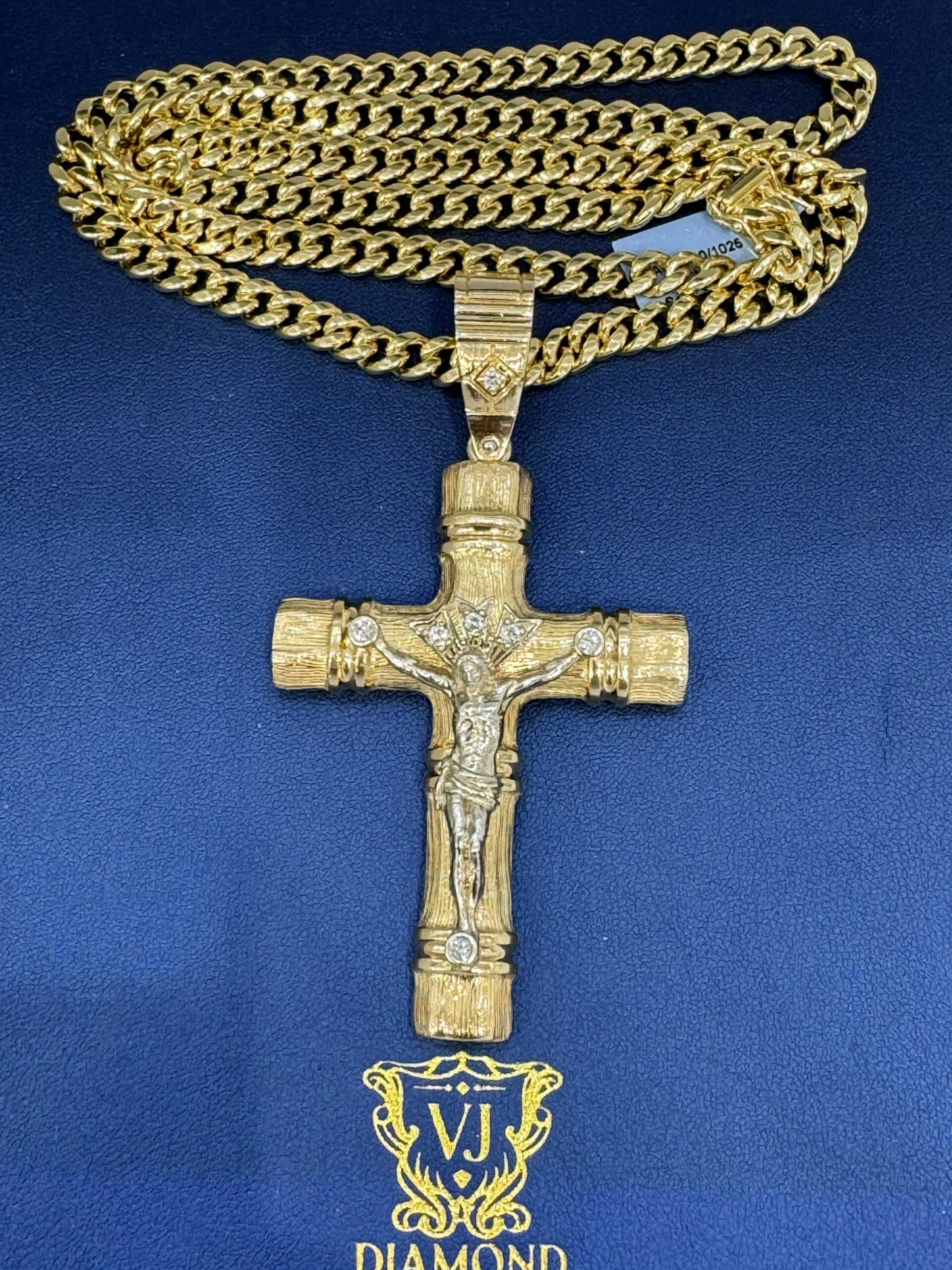 14KT Gold 1.00CT Diamond Solid Gold Cross Pendant With 14KT 7MM 26″ SemiSolid MiamiCuban Necklace 3.55″ Tall Cross By 2″ Wide Approx Gold Weight 44.0 Gram Chain Approx Gold Weight 20.1 Gram