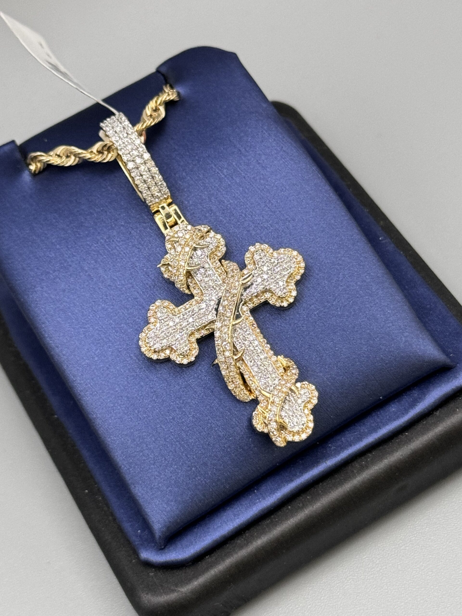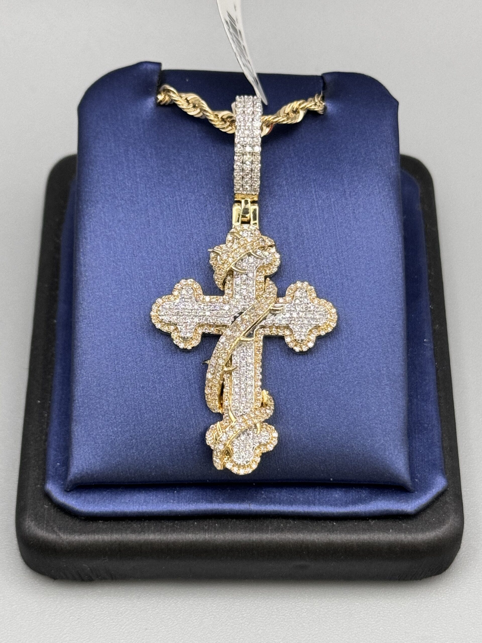 Elevate your style with this stunning 14KT Gold 1.35CT Diamond Cross Pendant set. Complete with a 22″ rope necklace, the pendant measures 2″ tall by 1″ wide, weighing 8.3 grams. Perfectly elegant!