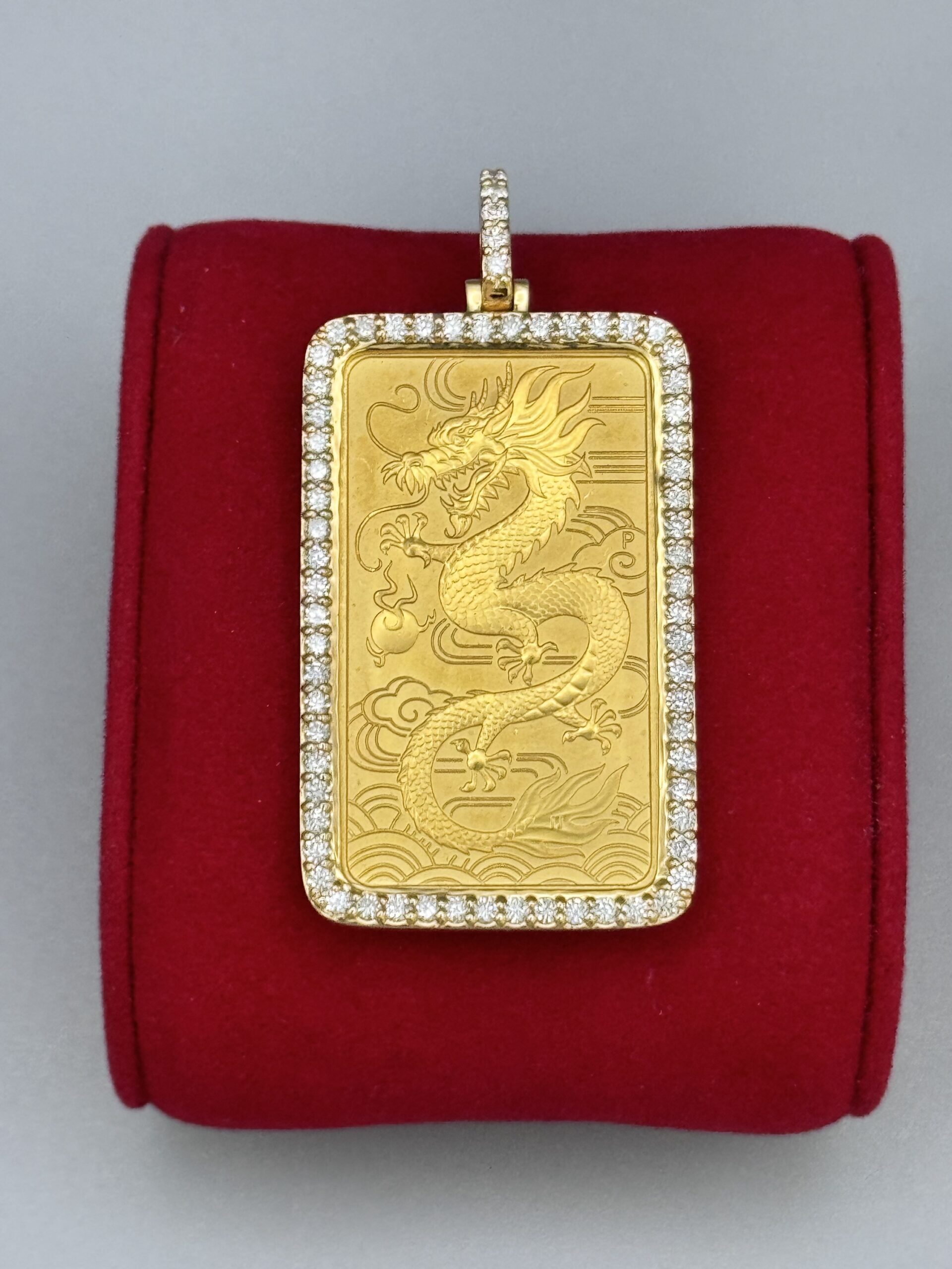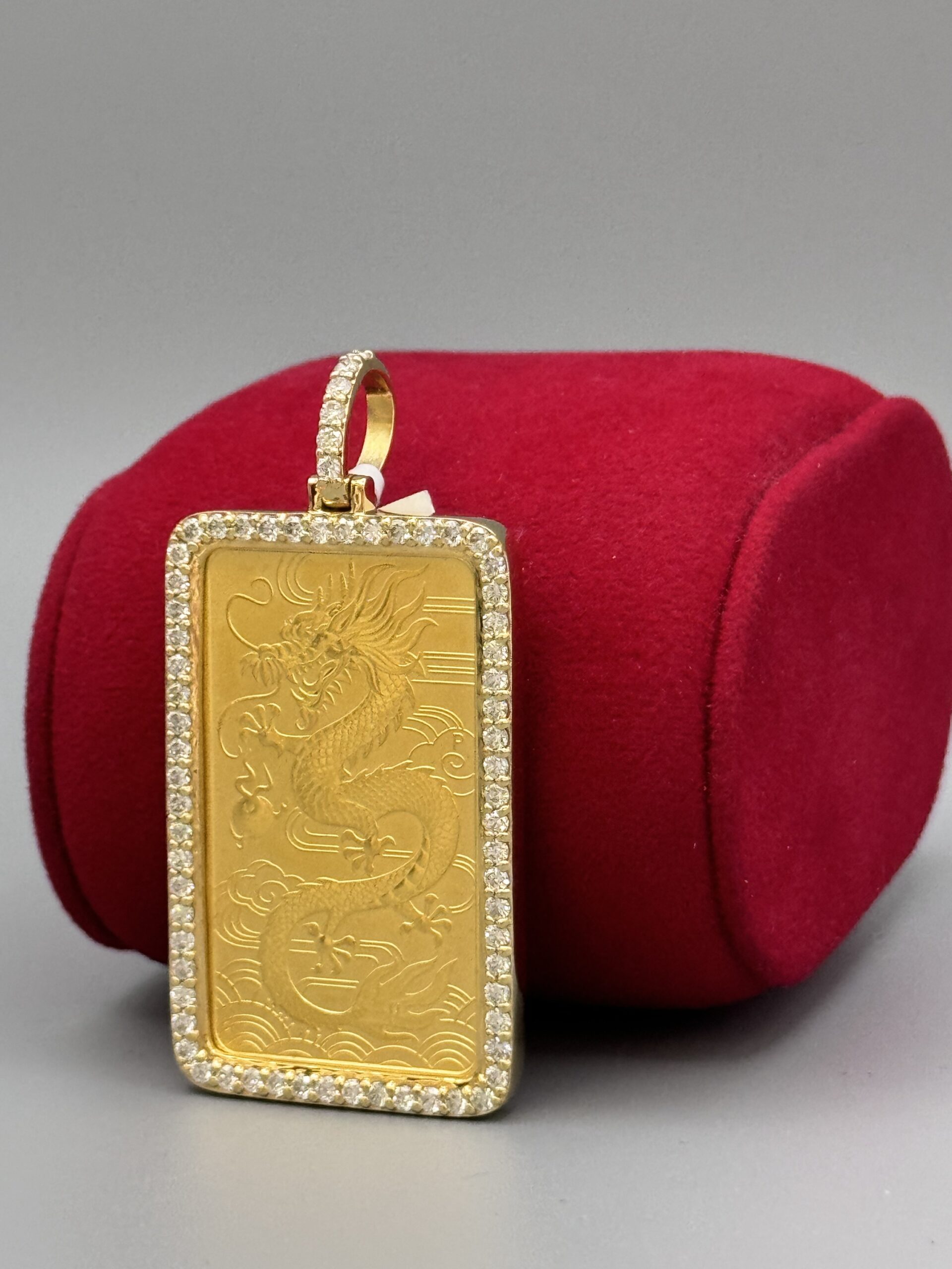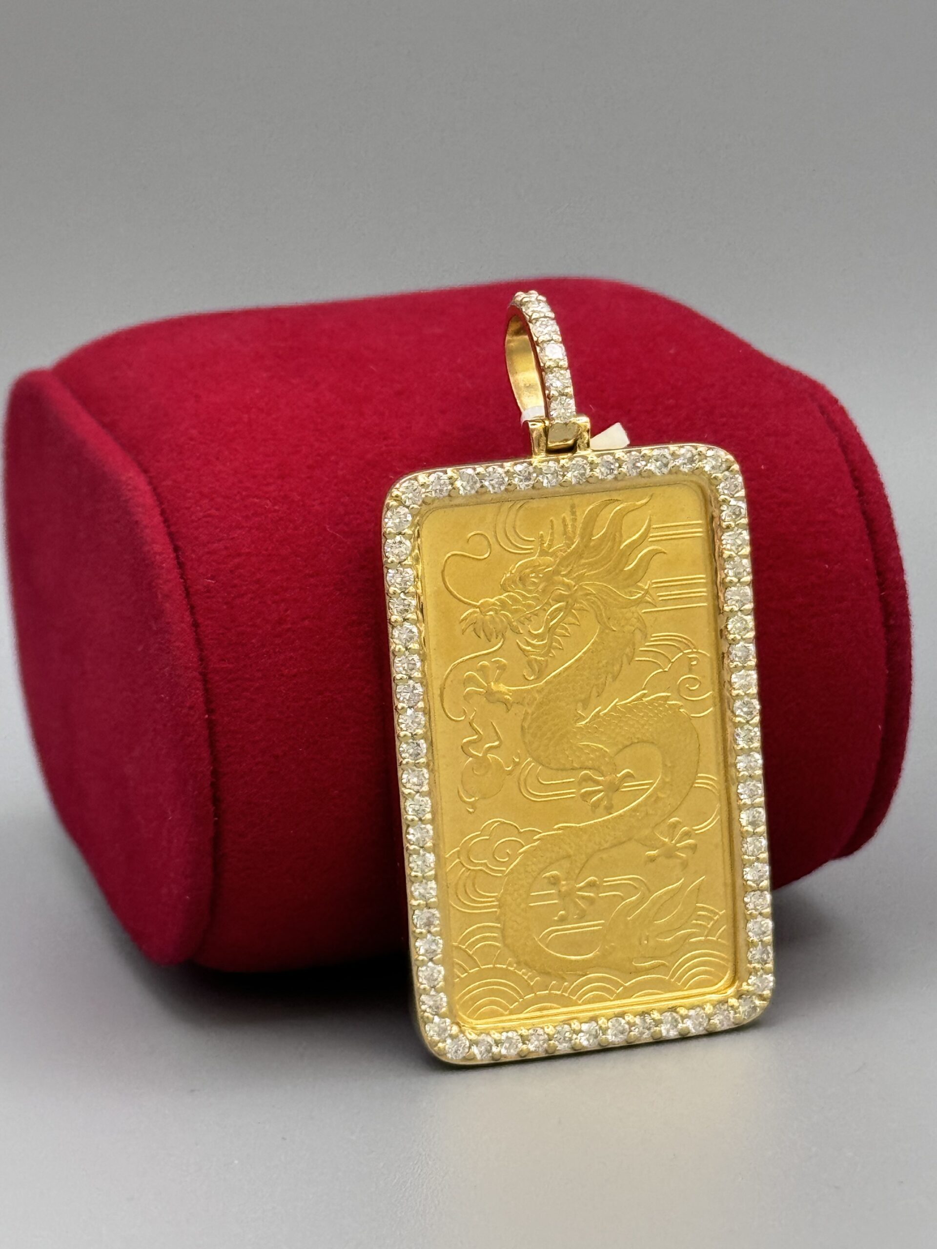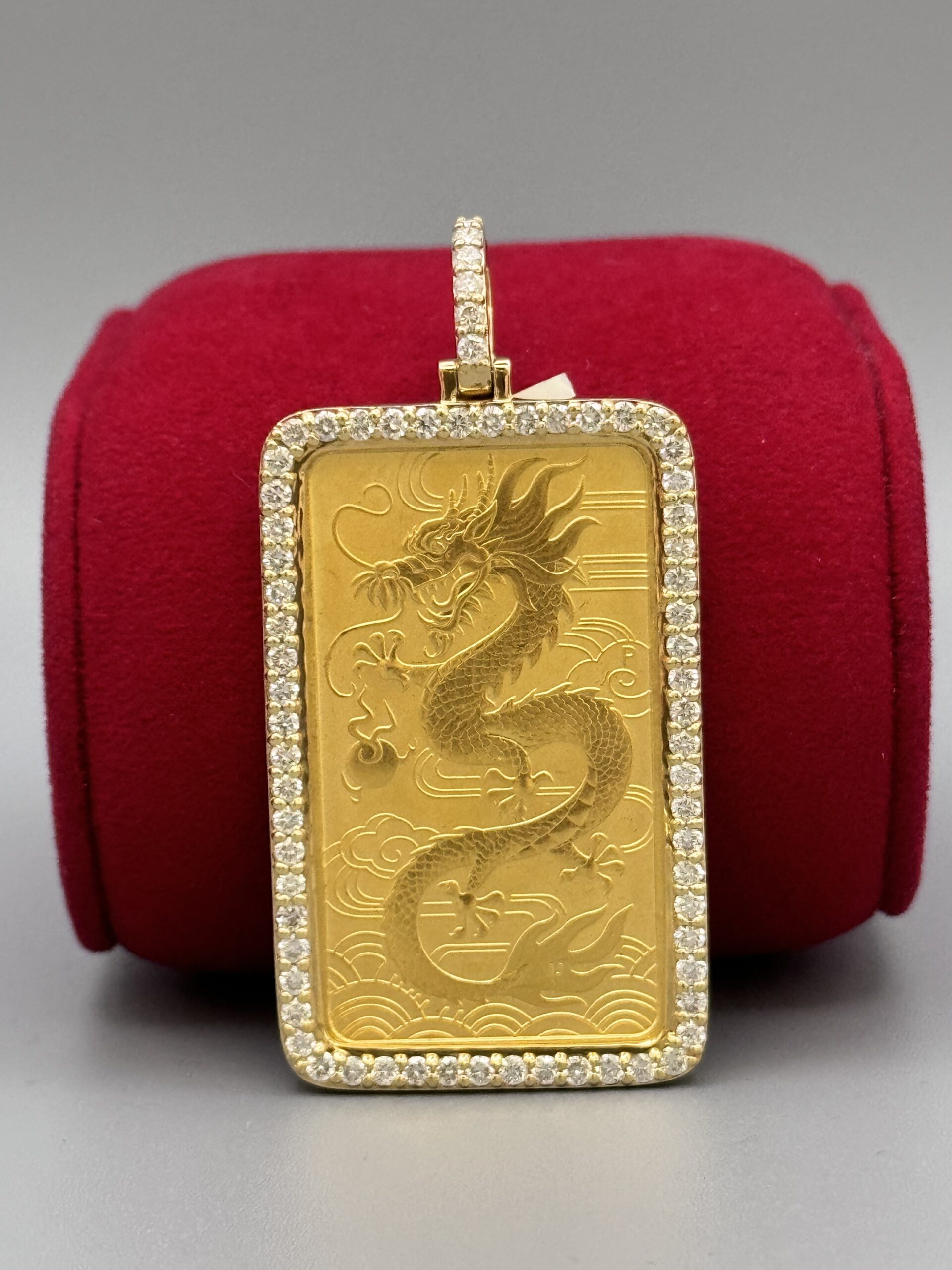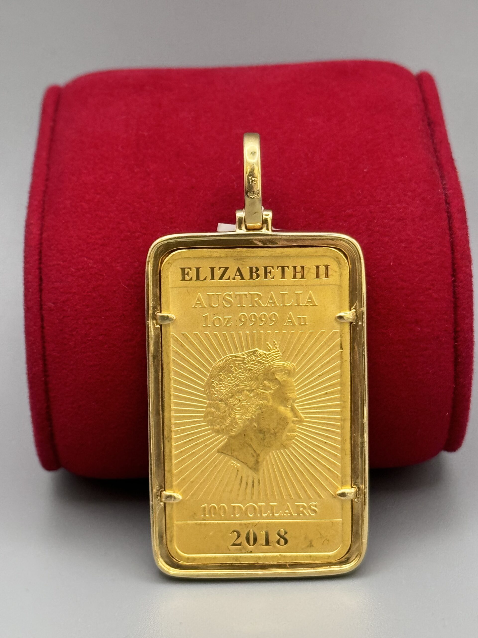 14Kt Gold 2.00CT Diamond Bezel 1 Ounce Bar Pendant Elizabeth 2.25″ Tall By 1″ Wide All Genuine VS Clarity Diamond’s Around The Bezel Approx Gold Weight Includes Bezel 42.04 Gram 31.13 Gram Coin Weight